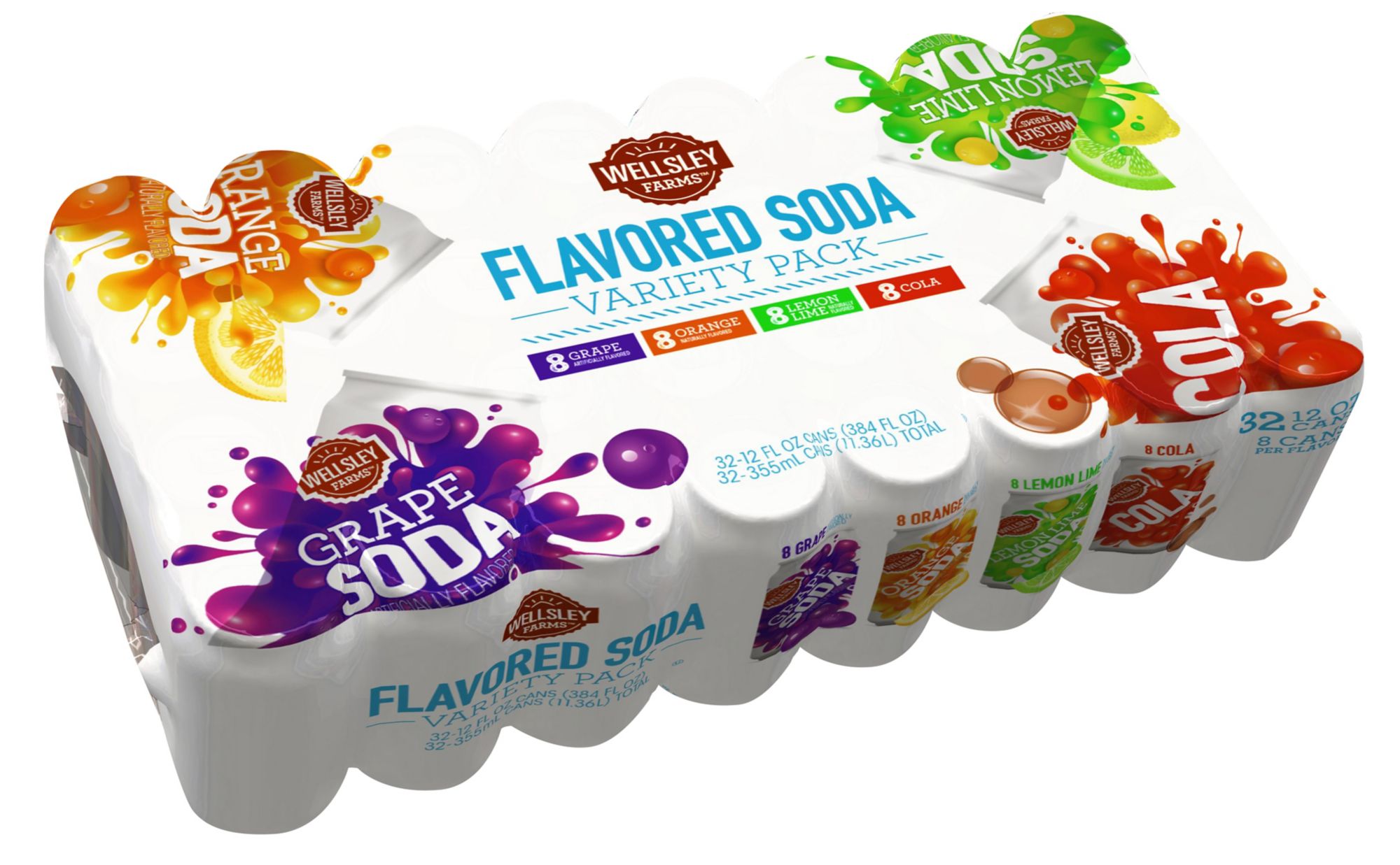 With four delicious flavors at a great value, this pack of Wellsley Farms 12-Oz. Variety Soda is sure to please any soda lover. It comes with the refreshing flavors of Cola, Lemon-Lime, Orange and Grape. Included are 32 cans of soda.