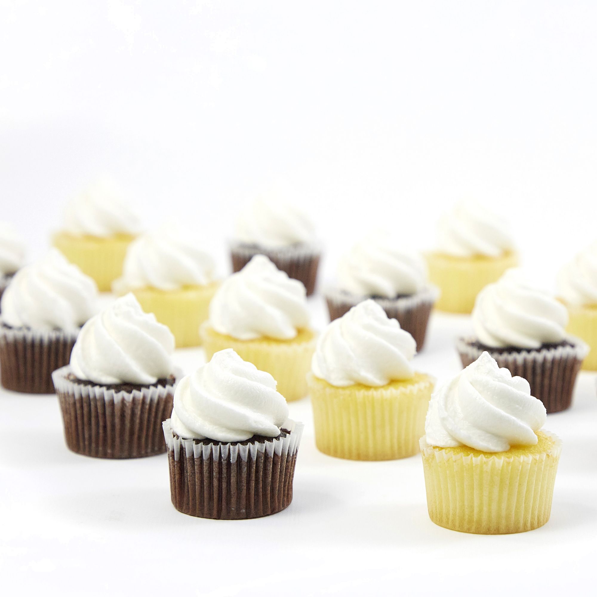 Wellsley Farms White Iced Mini Cupcakes include vanilla and chocolate flavored cupcakes topped with creamy white swirl icing. This tray of cupcakes is ready to serve for parties and events, with 24 cupcakes in a pack. With both chocolate and vanilla cake flavors, there's something for everyone.