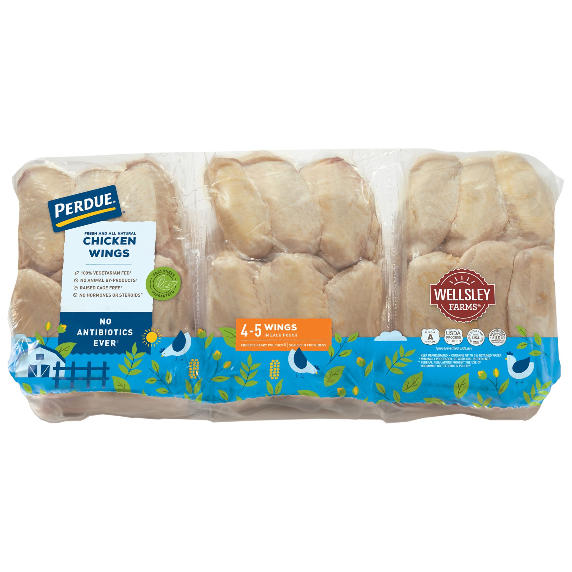 Perdue and Wellsley Farms team up to bring the best cuts of chicken to your table. Whether you are cooking dinner for the family or meal prepping for the week, Perdue and Wellsley Farms provide delicious chicken that's always 100% Veggie fed with no antibiotics ever. The Wings come fresh with whole three-joint chicken wings, packed 4 - 5 wings per pouch, six pouches per pack. The pouch makes wing night easy.