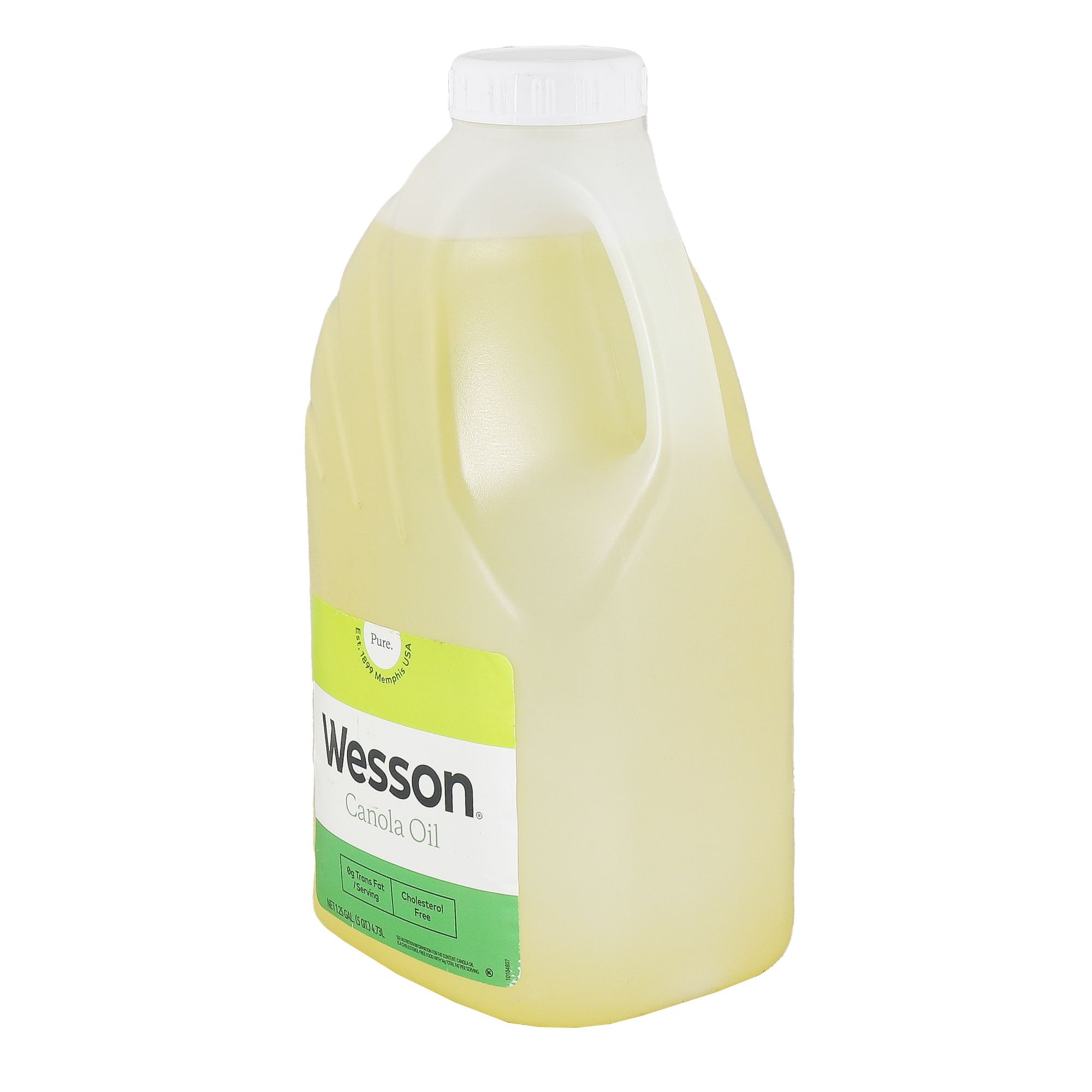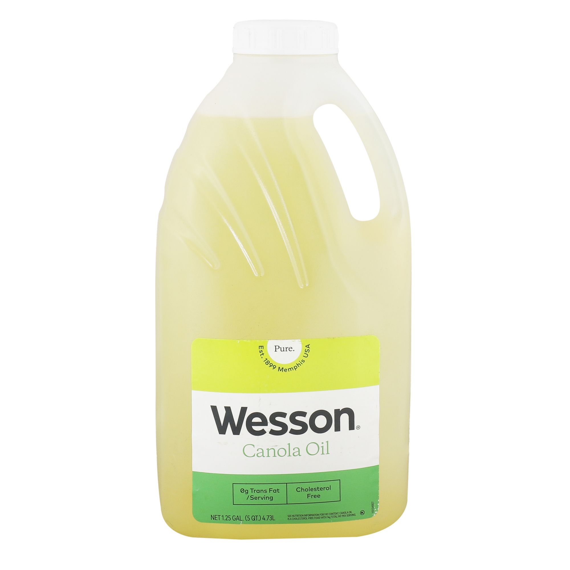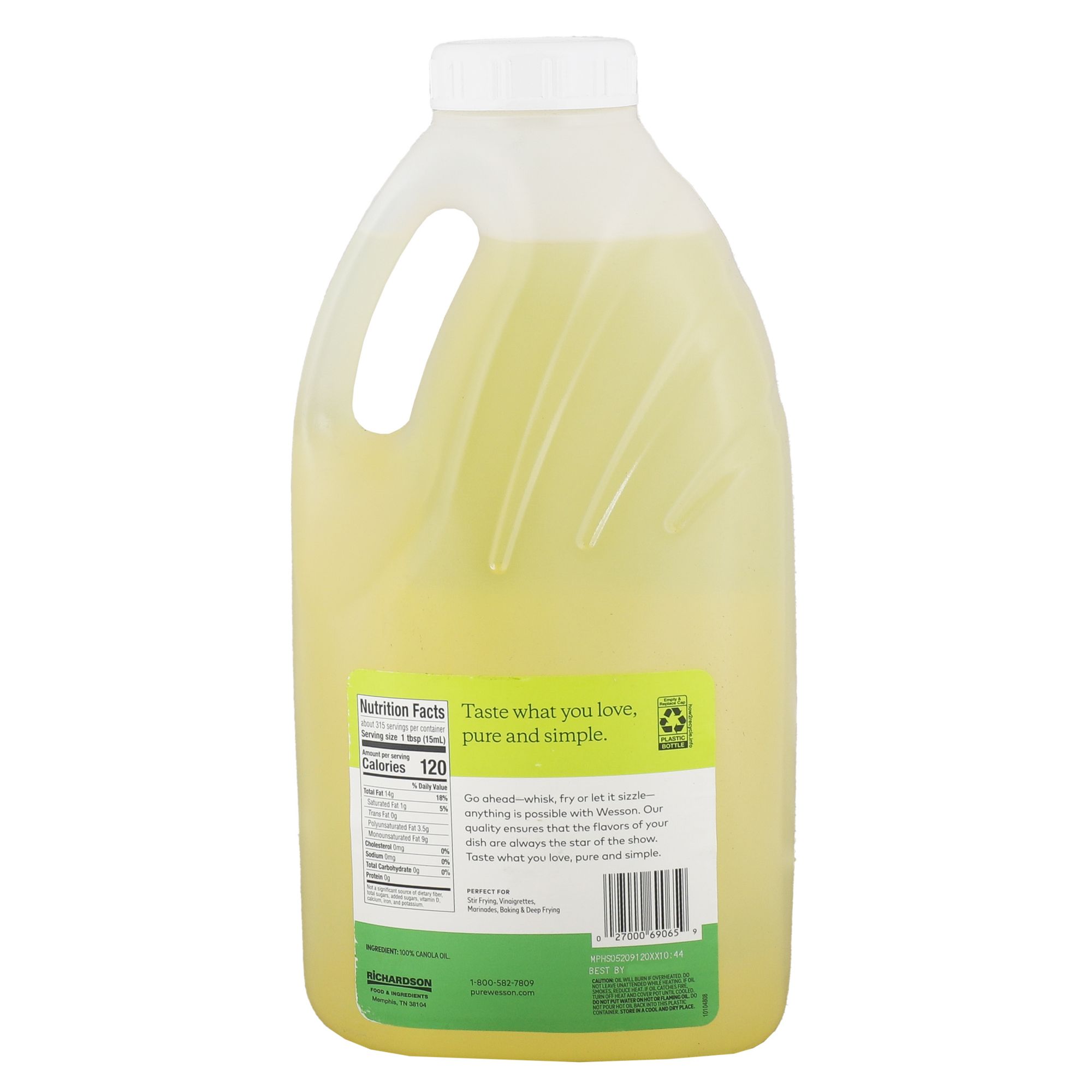 Pure and 100% natural Wesson Oil Great for baking, stir fry, marinades and vinaigrettes Taste the food, not the oil 0g trans fat 0mg sodium per serving Cholesterol free Kosher Pareve Shelf life: 270 days Includes Wesson Canola Oil, 5 Quarts