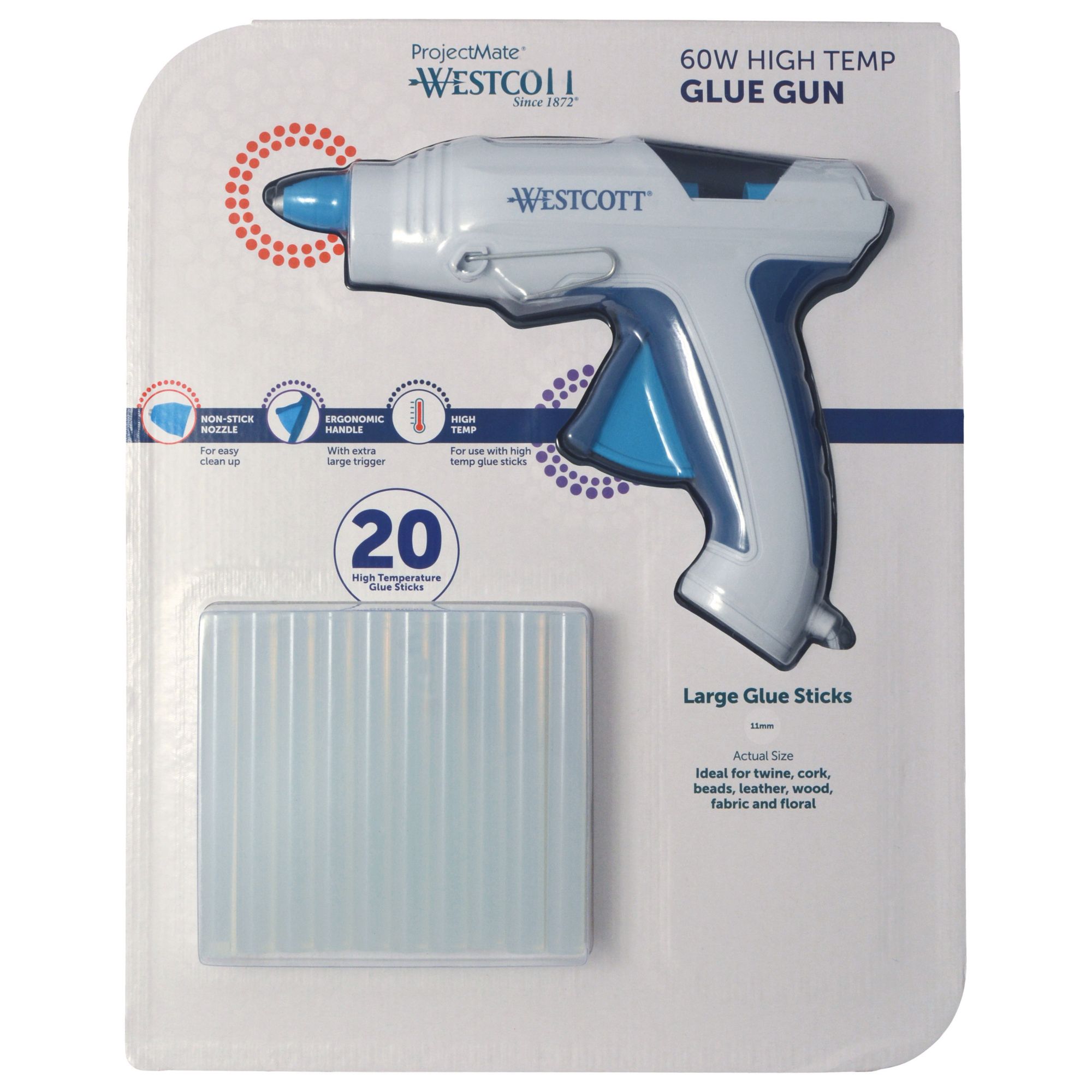The Westcott 60 Watt Mid Range Glue Gun is unlike any other product in the crafting market. With an innovative ergonomic design, hours of crafting comfort are at crafters fingertips. Ideal for twine, cork, beads, leather wood, fabric and florals.