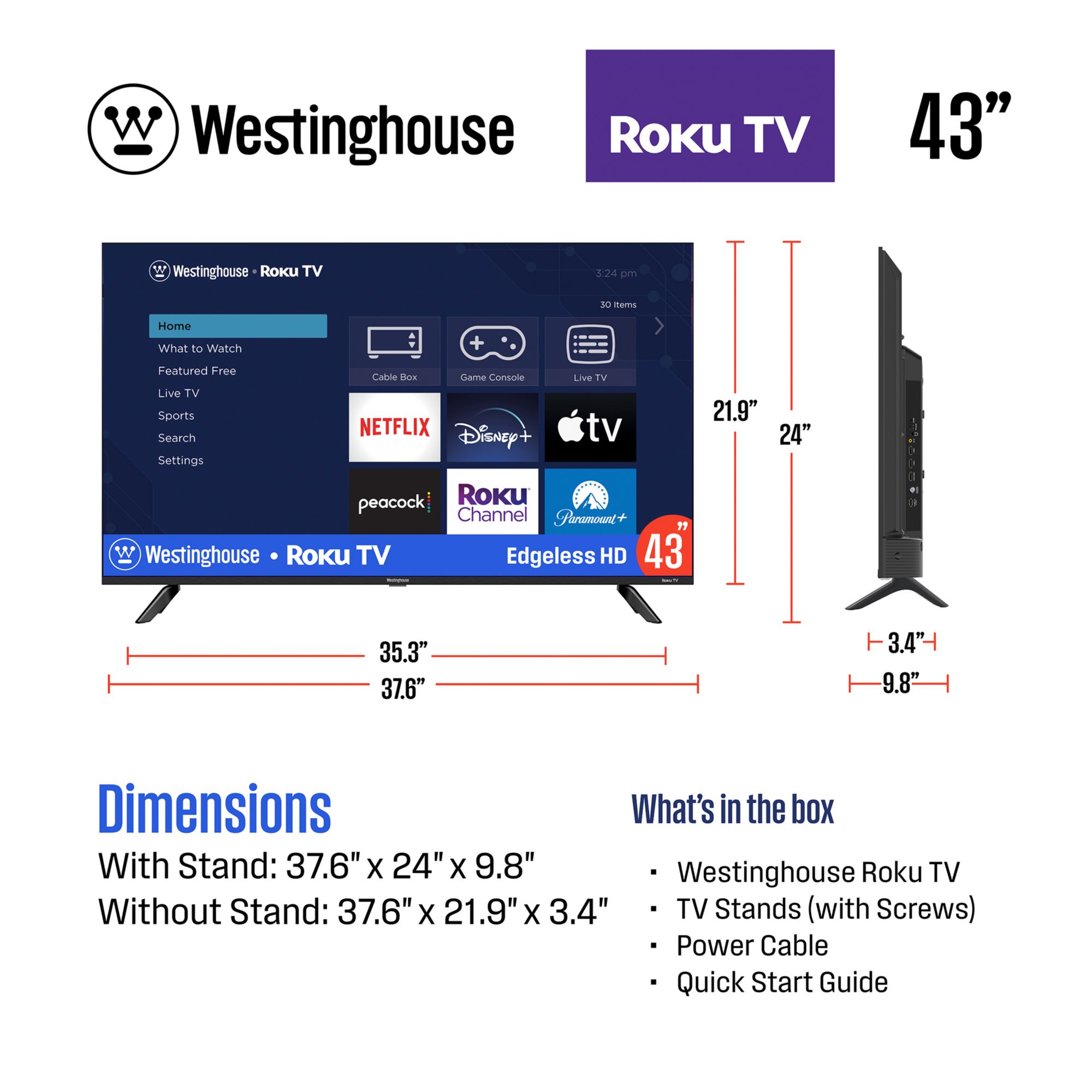 Includes TV, Roku TV remote, stand legs, stand screws, power cord, manual, warranty card