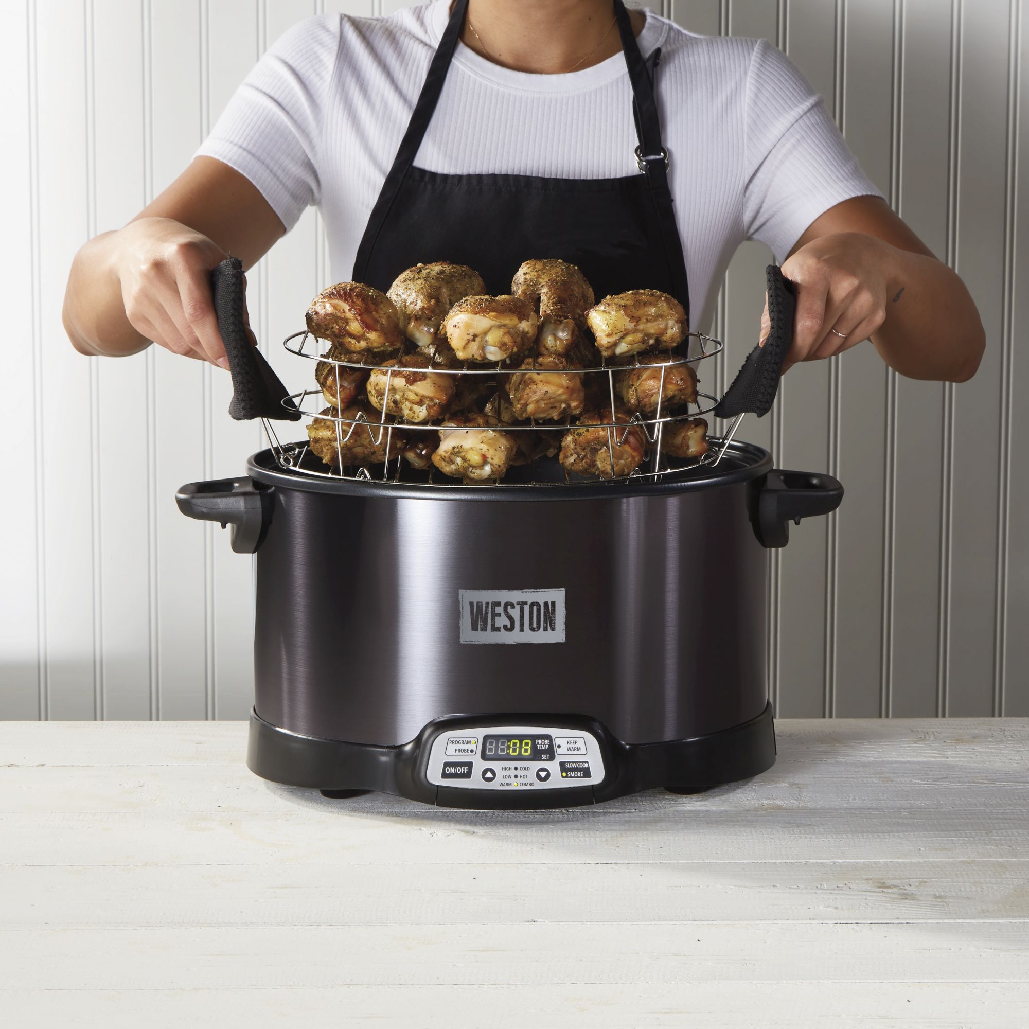 The Weston two-in-one Indoor Smoker and Slow Cooker smokes meat, cheese, and other foods quickly and easily right on your kitchen countertop. Enjoy your favorite foods infused with authentic smokehouse flavor year-round without the long wait or prep associated with traditional outdoor smokers. Or use with the removable 6-qt. cooking vessel to slow cook a variety of foods — the nonstick vessel holds a 6 lbs. chicken or a 4 lbs. roast. Quickly smokes food indoors with this indoor electric smoker/slow cooker, you'll smoke your favorite foods quickly and easily year-round right in your kitchen. It infuses meat, cheese and vegetables with authentic smokehouse flavor without the long wait. Two-in-one indoor smoker doubles as a 6-qt. slow cooker. Besides smoking foods with the cooking vessel removed, you can easily slow-cook a variety of foods in the nonstick cooking vessel. It holds up to 6-qt. and fits a 6 lbs. chicken or a 4 lbs. roast. Smokes food in three ways.