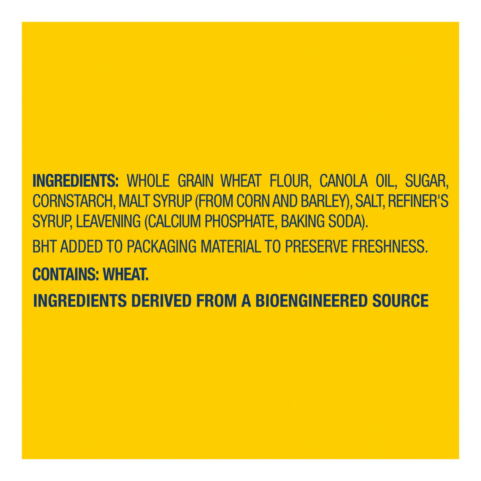 Ingredients: Whole Grain Wheat Flour, Canola Oil, Sugar, Cornstarch, Malt Syrup (From Corn And Barley), Salt, Refiner's Syrup, Leavening (Calcium Phosphate, Baking Soda). Bht Added To Packaging Material To Preserve Freshness. Contains: Wheat.