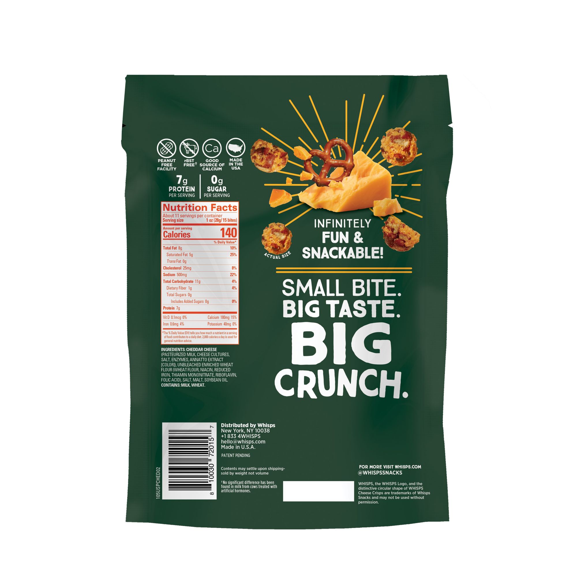 Whisps Cheddar Cheese and Pretzel bites are simply 100% real cheddar cheese baked with delicious pretzel pieces into a one-of-a-kind crunchy, cheesy, satisfying bite! Whisps Cheddar Cheese & Pretzel Bites are a great snacking option for those looking for a healthier alternative to their favorite pretzel snacks. Each serving delivers 7 grams of protein, a good source of calcium and 0 grams of sugar to keep you and your family feeling full and energized. Irresistibly fun and snackable, Whisps Cheese & Pretzel Bites are the perfect blend of 100% real cheddar cheese & pretzel pieces in every delicious, crunchy bite. Try Whisps today and discover a tasty way to snack healthier!