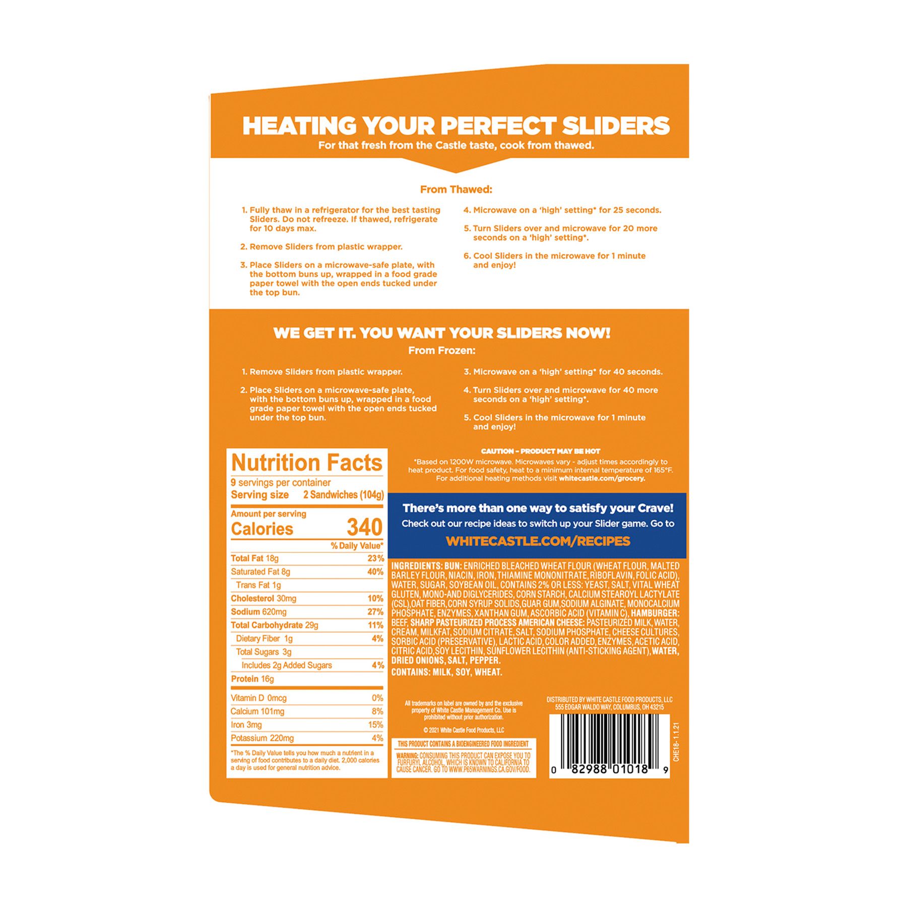 White Castle Classic Cheese Sliders are made with 100% Beef, American Cheese, and grilled onions; topped on the signature soft baked bun. White Castle frozen sliders are cooked and packaged through a process that replicates the unique steam grilling process used in the Castles. Want to create that same Castle experience in your home, try them with a couple of slices of dill pickles. Easy to heat and fun to eat, offering a satisfying 16g of protein per serving. White Castle is a fourth-generation, 100-year-old family-run company operating restaurants, bakeries, and manufacturing locations that satisfy the Crave nationwide. Perfect for a quick snack, lunch, or dinner that the whole family can enjoy, creating memorable moments for Craver generations everywhere. White Castle Sliders deliver one-of-a-kind taste and are easy to make, making it simple to bring home the Crave from our Castle to yours. It’s what you Crave.