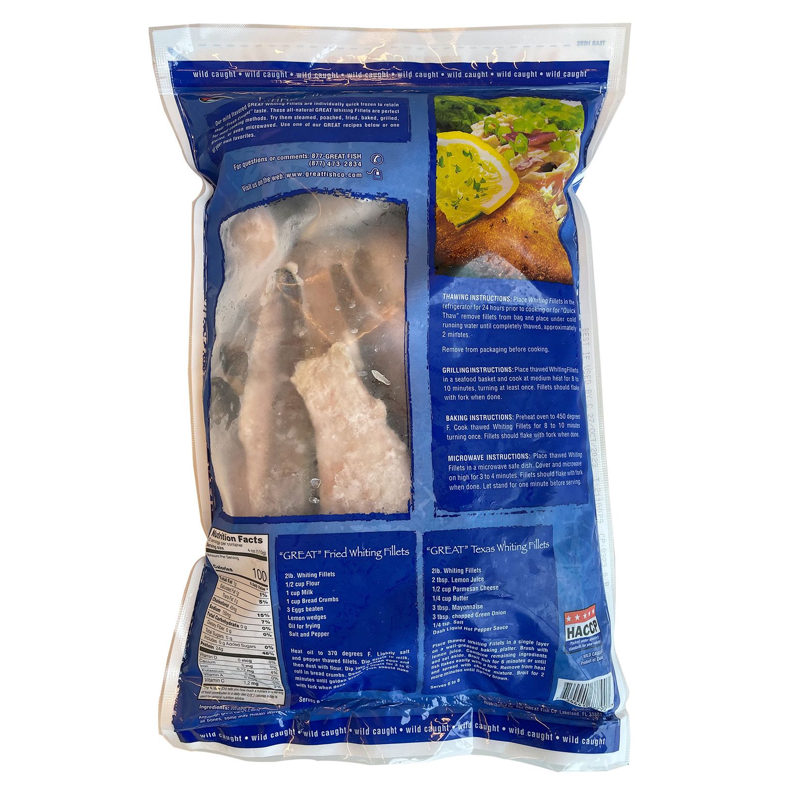 The frozen whiting fillet is a wild-caught mild-flavored flaky white meat. It is a smaller fish from the cod family, is delicate in texture, neutral in flavor and, an excellent source of protein that has 0g of saturated fat. Besides being a healthy lean source of protein, is easy to prepare and enjoyable for all members of the family.