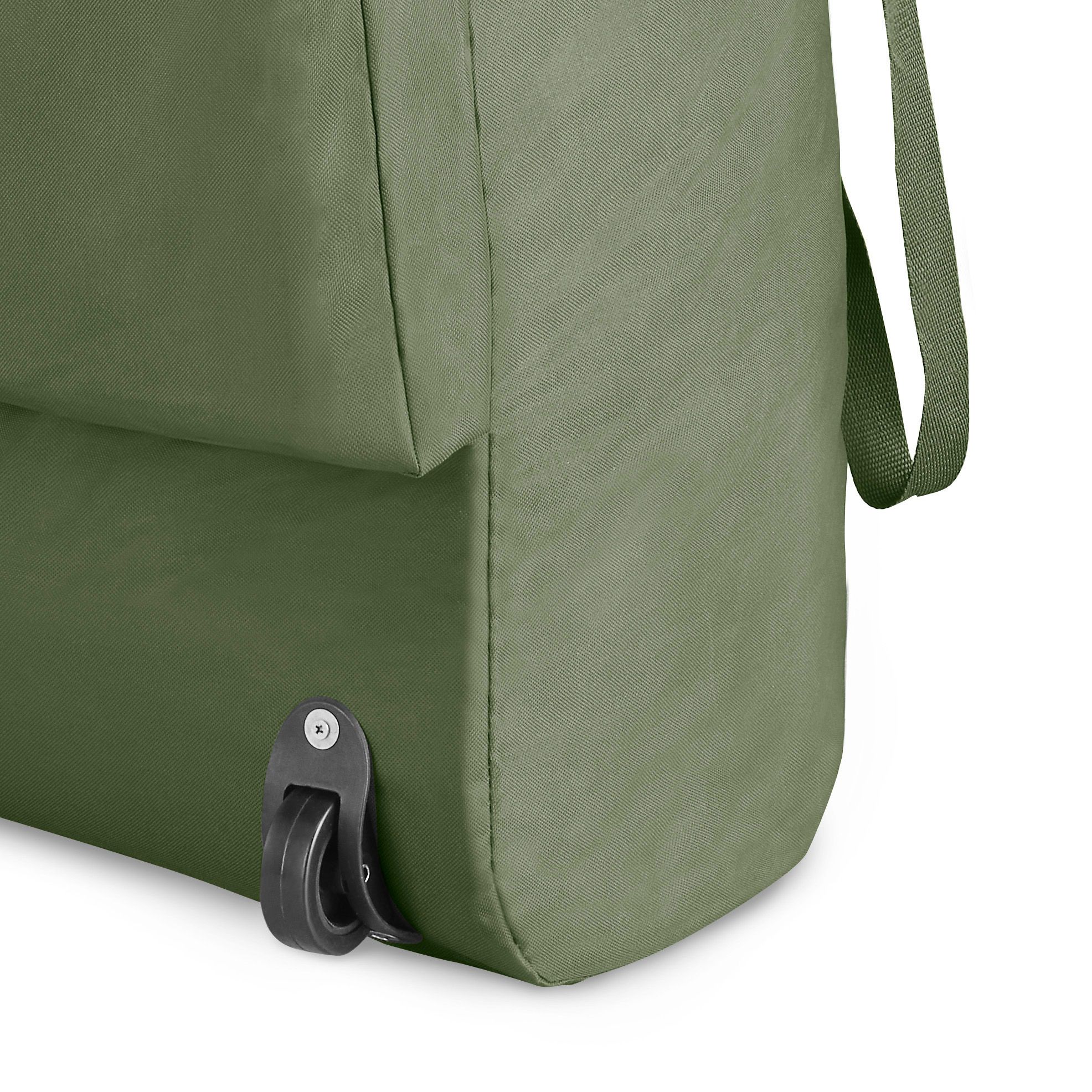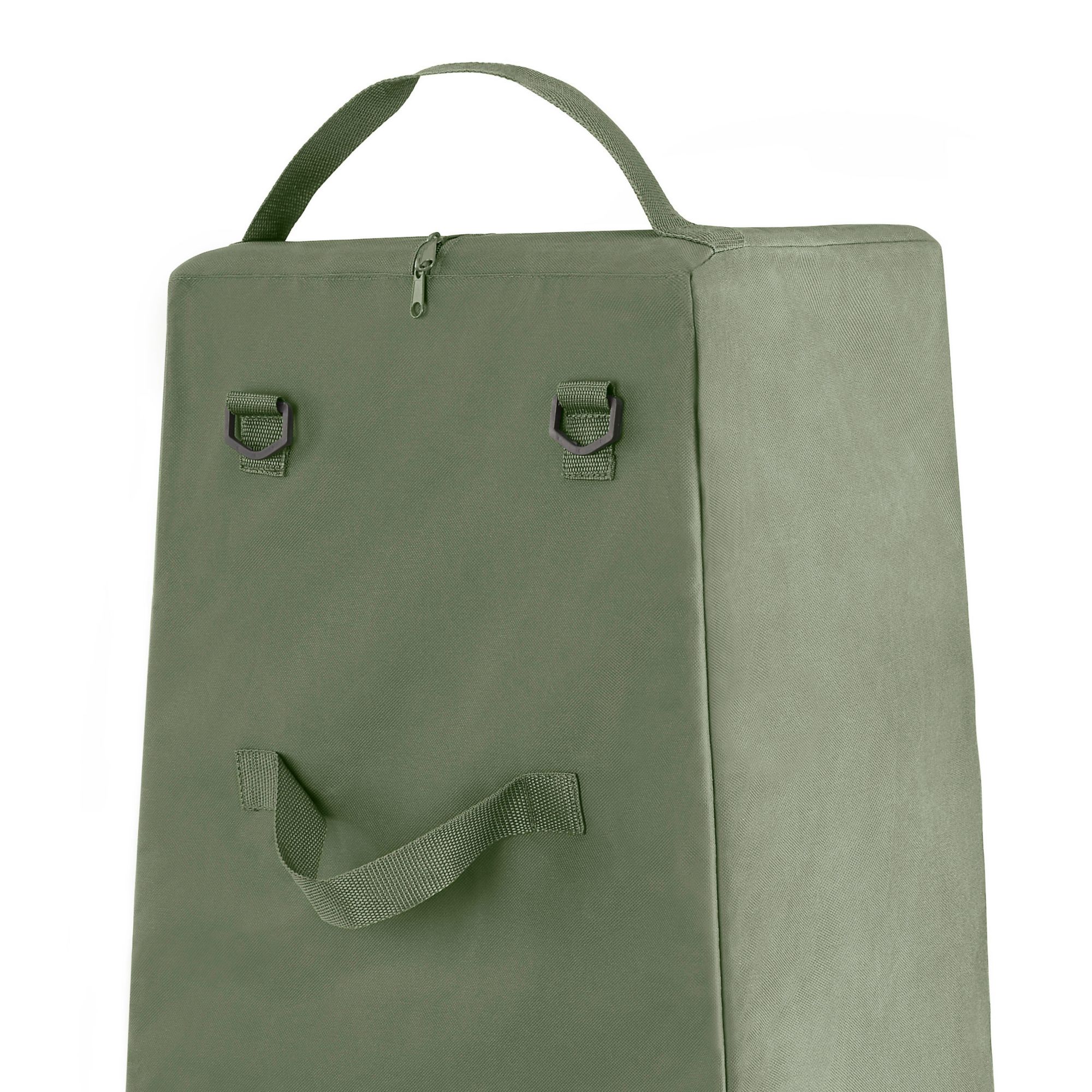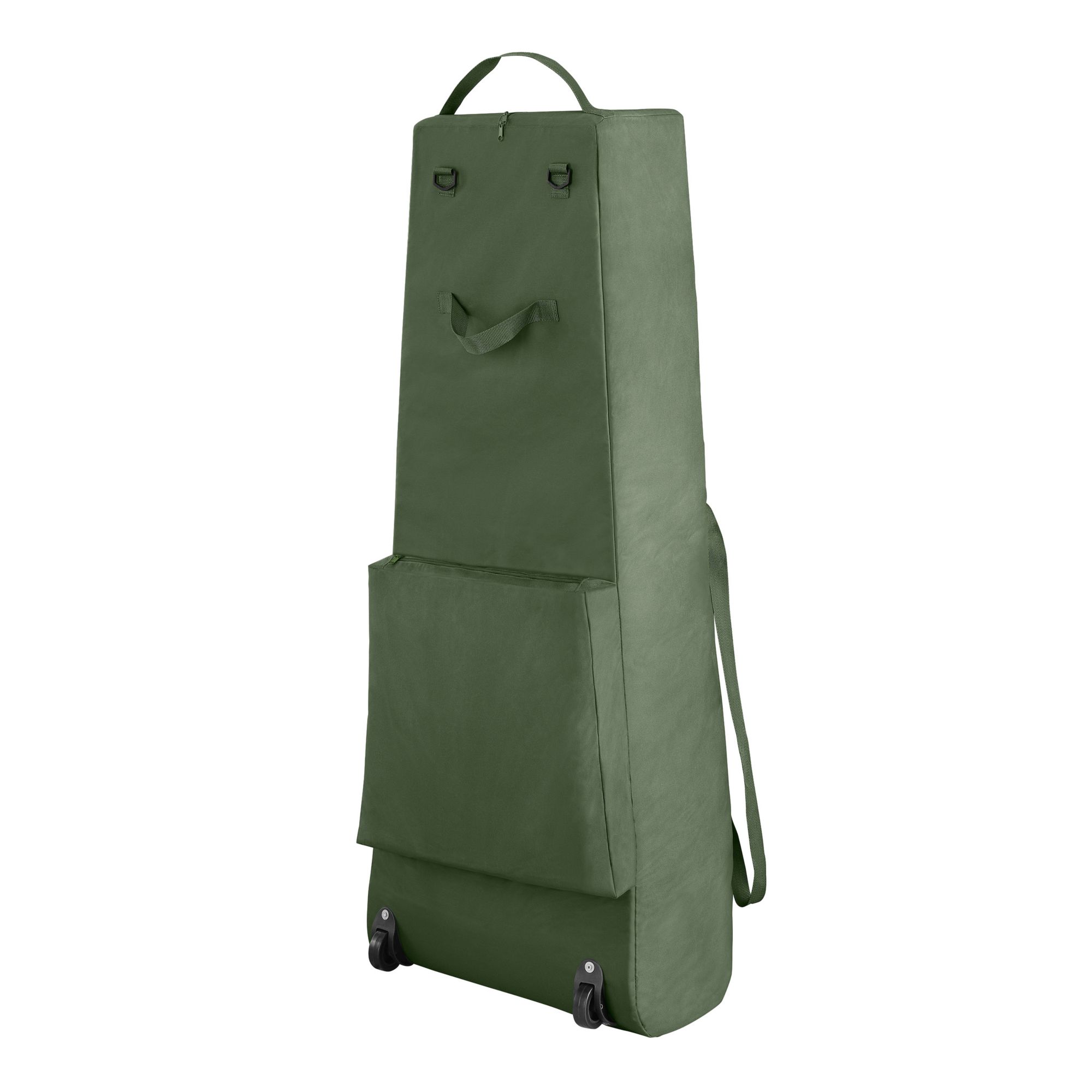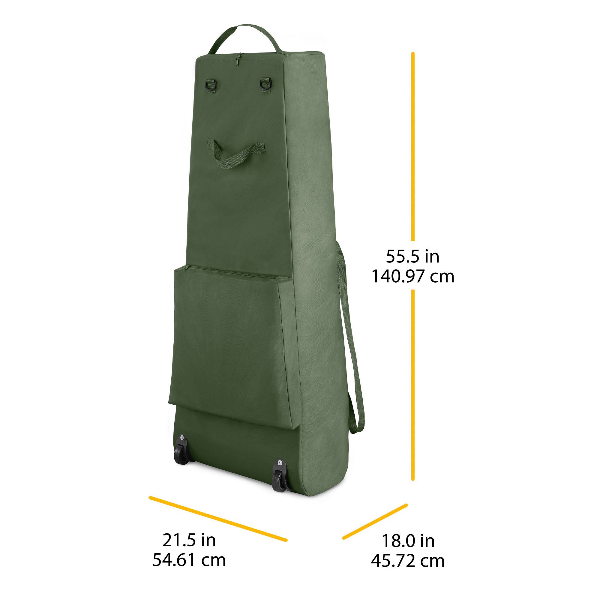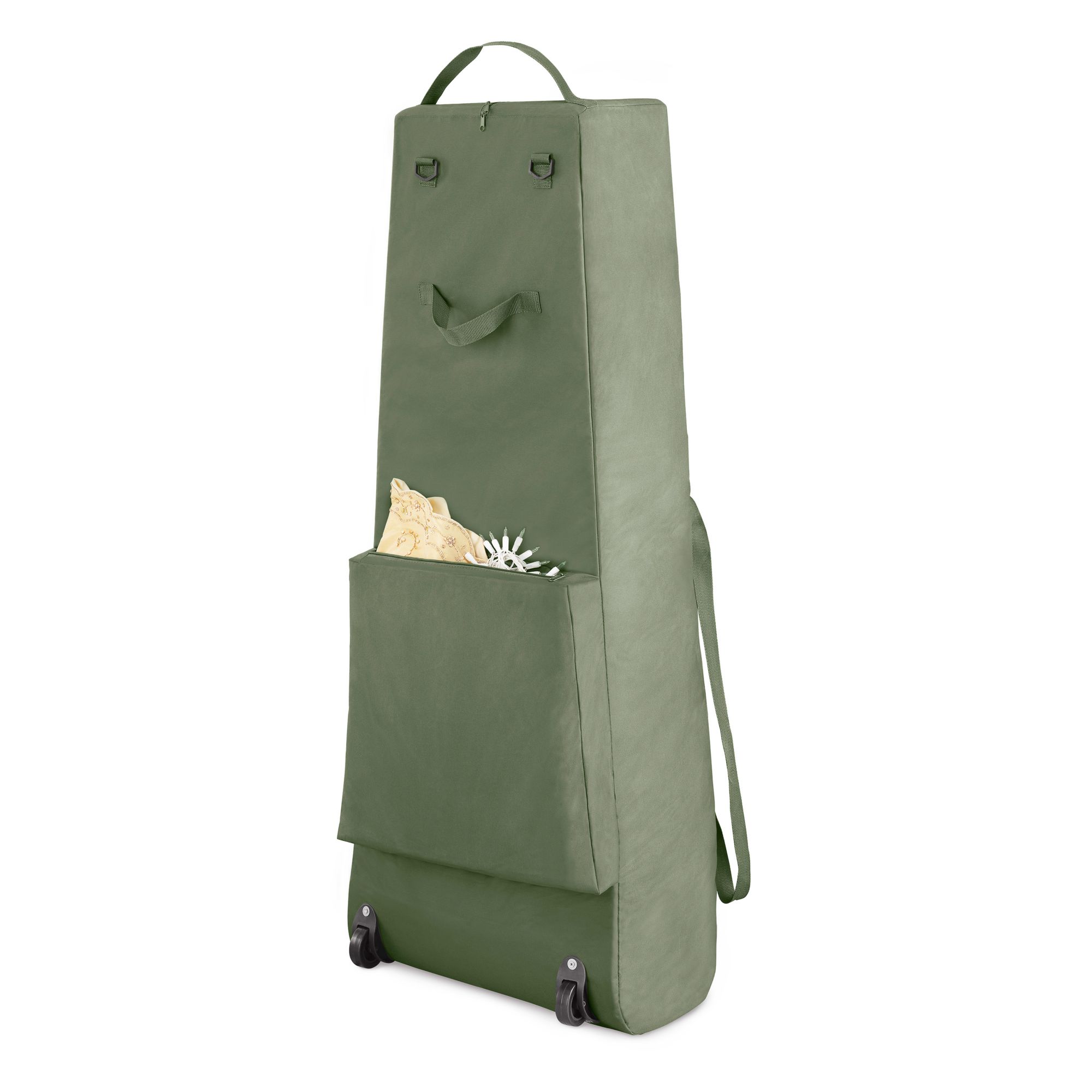 Upgrade your Christmas tree storage game with the Whitmor Christmas upright tree bag. The Christmas upright tree bag holds up to a 9' disassembled artificial tree. The upright tree bag is made of heavy-duty red polyester fabric with dark green sewn-on straps made of strong polyester strap webbing. The large handles and two heavy-duty wheels allow for easy storage and transport. Features a full-length zipper for easy access. There is also a front storage pocket for accessories such as tree stand parts, tree skirts, lights, or extension cords.
