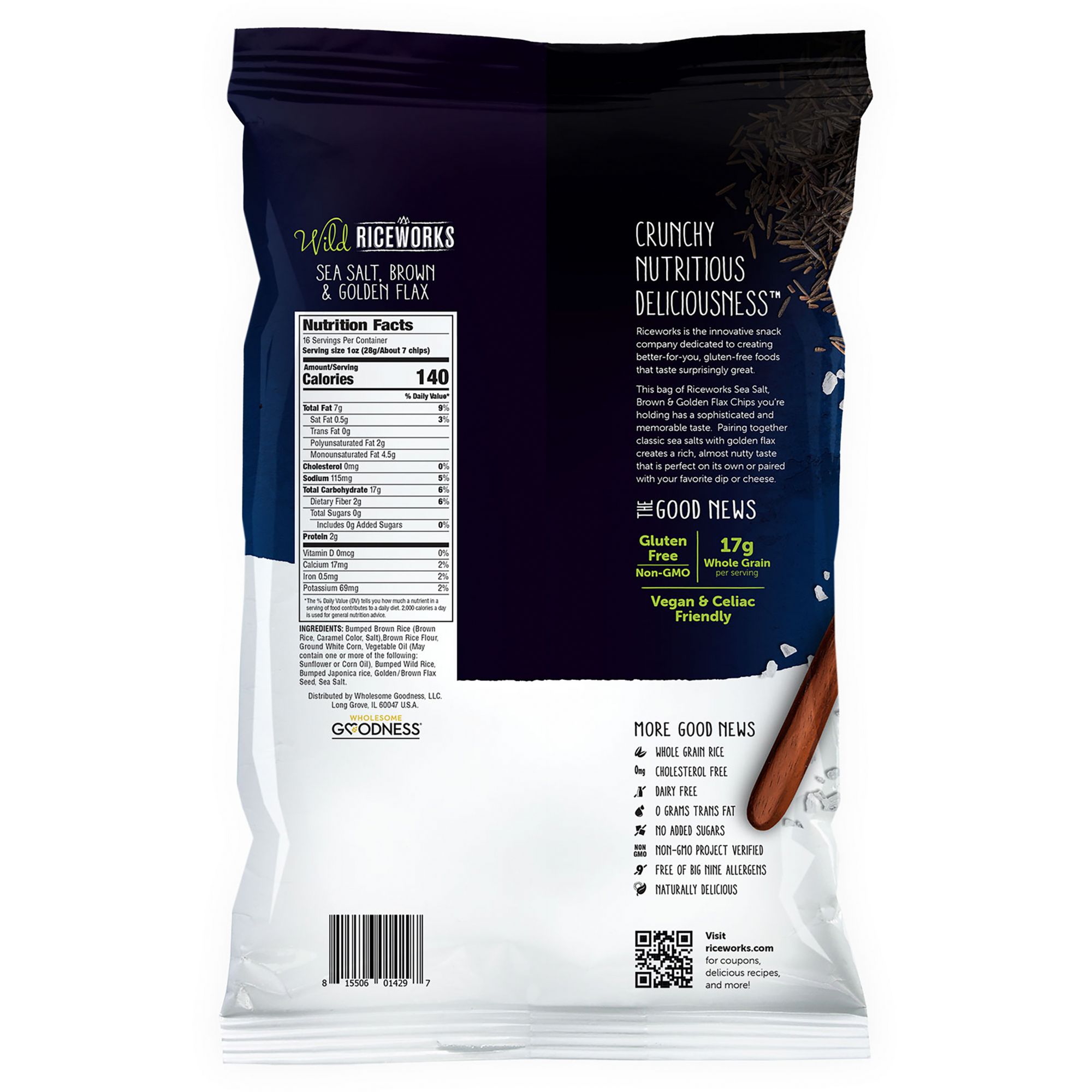 The brand for active people who like healthier snacks a lot better when they taste great! This snack has verified non-GMO ingredients, is gluten free certified, celiac friendly, plant based, whole grain, kosher, free of the FDA's Big-9 allergens, cholesterol free and all natural. Riceworks bans 156 ingredients used by other food companies. Wholesome Goodness/Riceworks is the better for you snack company providing customers with simple, naturally delicious, high quality snacks that are affordable. More than a decade ago, a family rice grower began experimenting with blending whole grain rice into a delectable snack and Riceworks was born. This bag of Sea Salt, Brown & Golden Flax crisps has a sophisticated and memorable taste. Pairing together classic flavors creates a rich, almost nutty taste that is perfect on its own or paired with your favorite dip or cheese. You'll immediately notice the whole grain rice and then the hearty, satisfying crunch. This unique combination is delicious straight out of the bag or ideal for dipping and topping. Riceworks insists on seeking out the freshest, most healthful, minimally processed ingredients. No artificial anything, no short cuts, just food in its purest state - unadulterated by artificial additives, sweeteners, coloring and preservatives. At the same time, Riceworks believes that protecting the environment is an important part of their corporate responsibility. Their goal is to make the world a better place, now and in the future. Snacking shouldn't be a guilty pleasure but rather a healthy choice that is part of everyday life.
