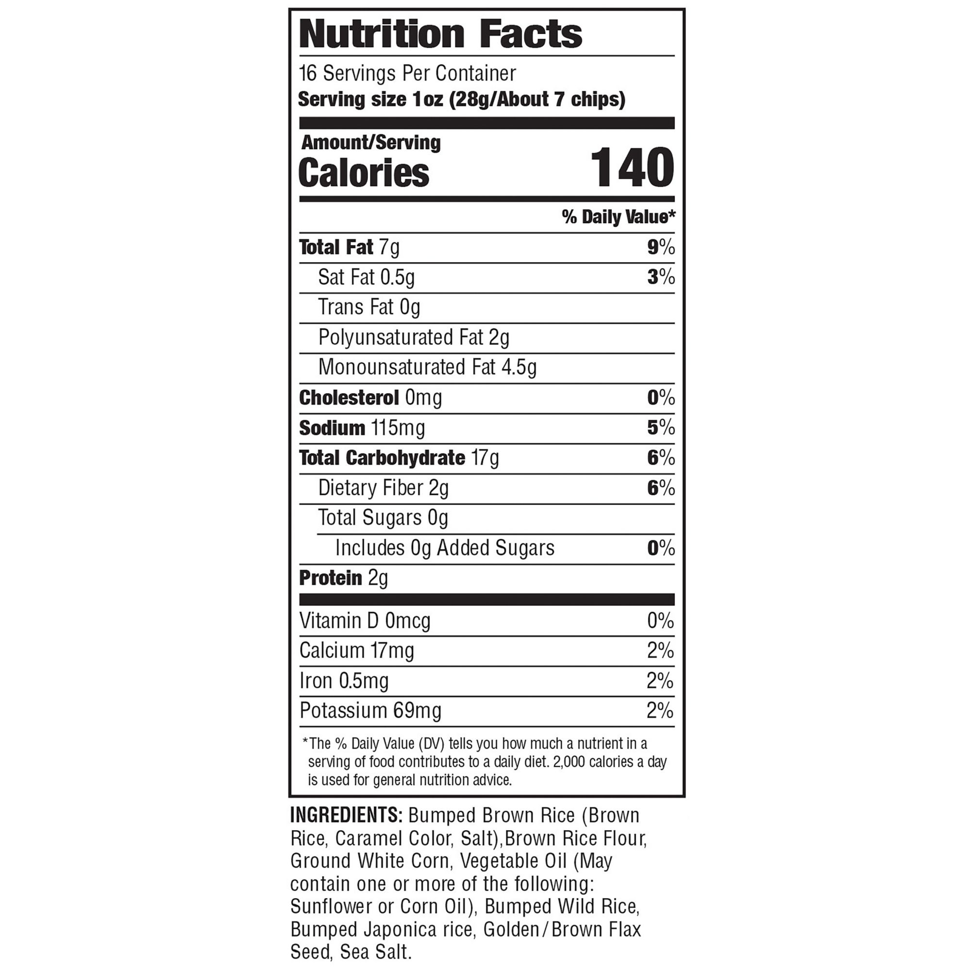Ingredients: Brown Rice Flour, Ground White Corn, Vegetable Oil (May Contain One or More of the Following: Sunflower or Corn Oil), Bumped Brown Rice (Brown Rice, Caramel Color, Salt), Bumped Wild Rice, Bumped Japonica Rice, Brown / Golden Flax Seed, Sea Salt.