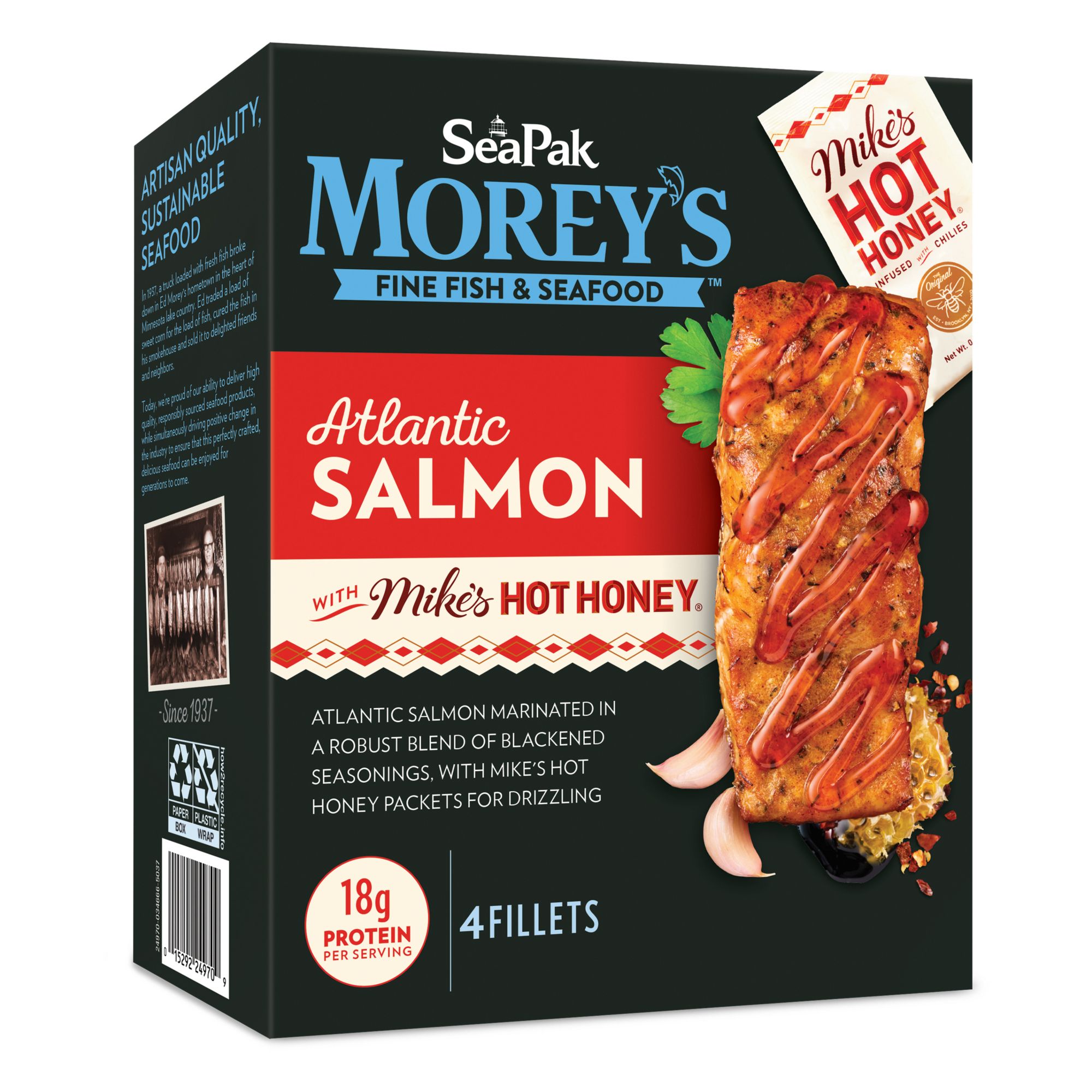 Ingredients: Atlantic Salmon (Color Added), Water, Mike's Hot Honey (Honey, Chili Pepper, Vinegar), High Oleic Canola Oil, Contains Less Than 2% Of The Following: Salt, Spices, Modified Corn Starch, Modified Potato Starch, Smoked Paprika, Extra Virgin Olive Oil, Onion Powder, Roasted Garlic, Garlic Powder, Paprika, Sunflower Lecithin, Canola Oil, Paprika Extract (Color), Xanthan Gum.
