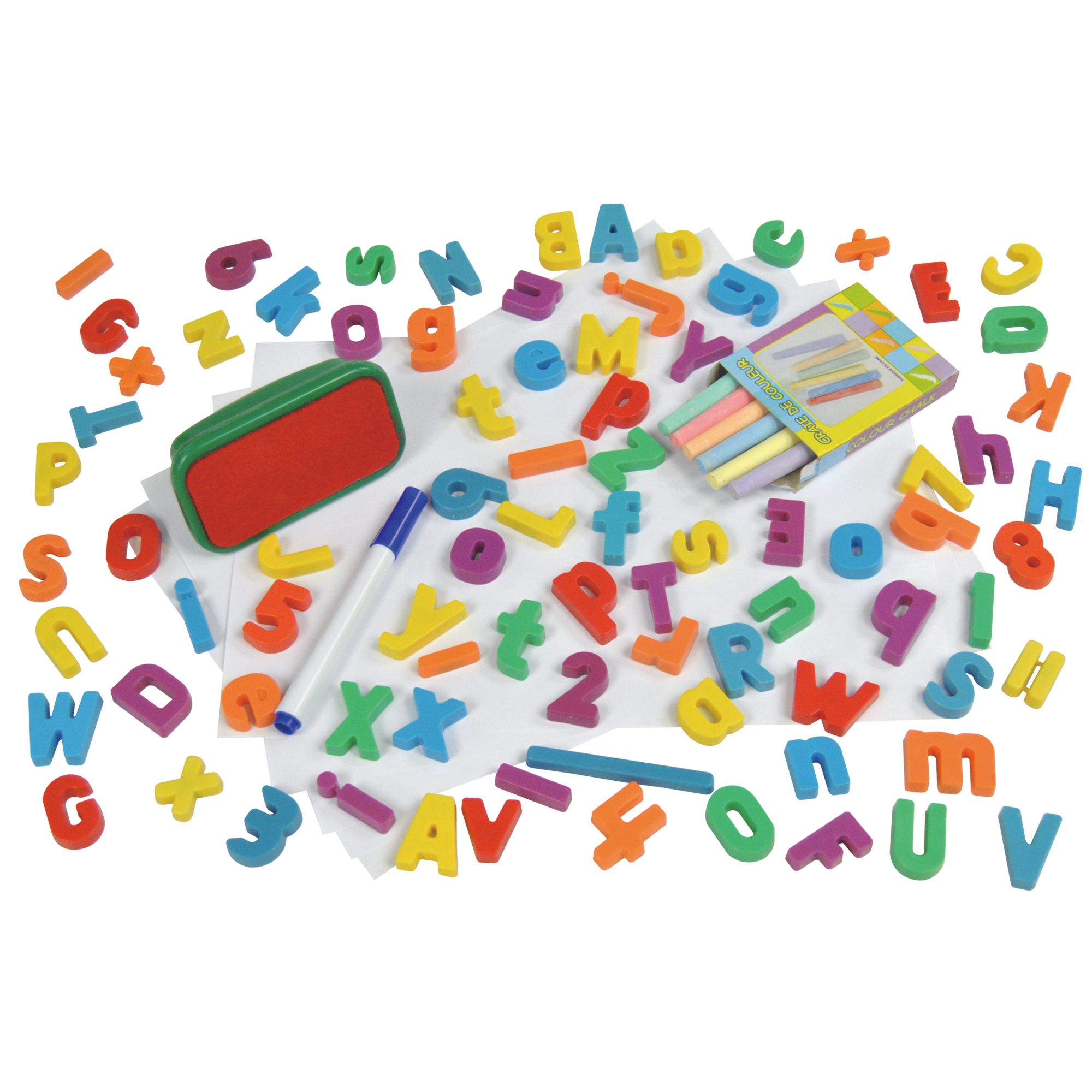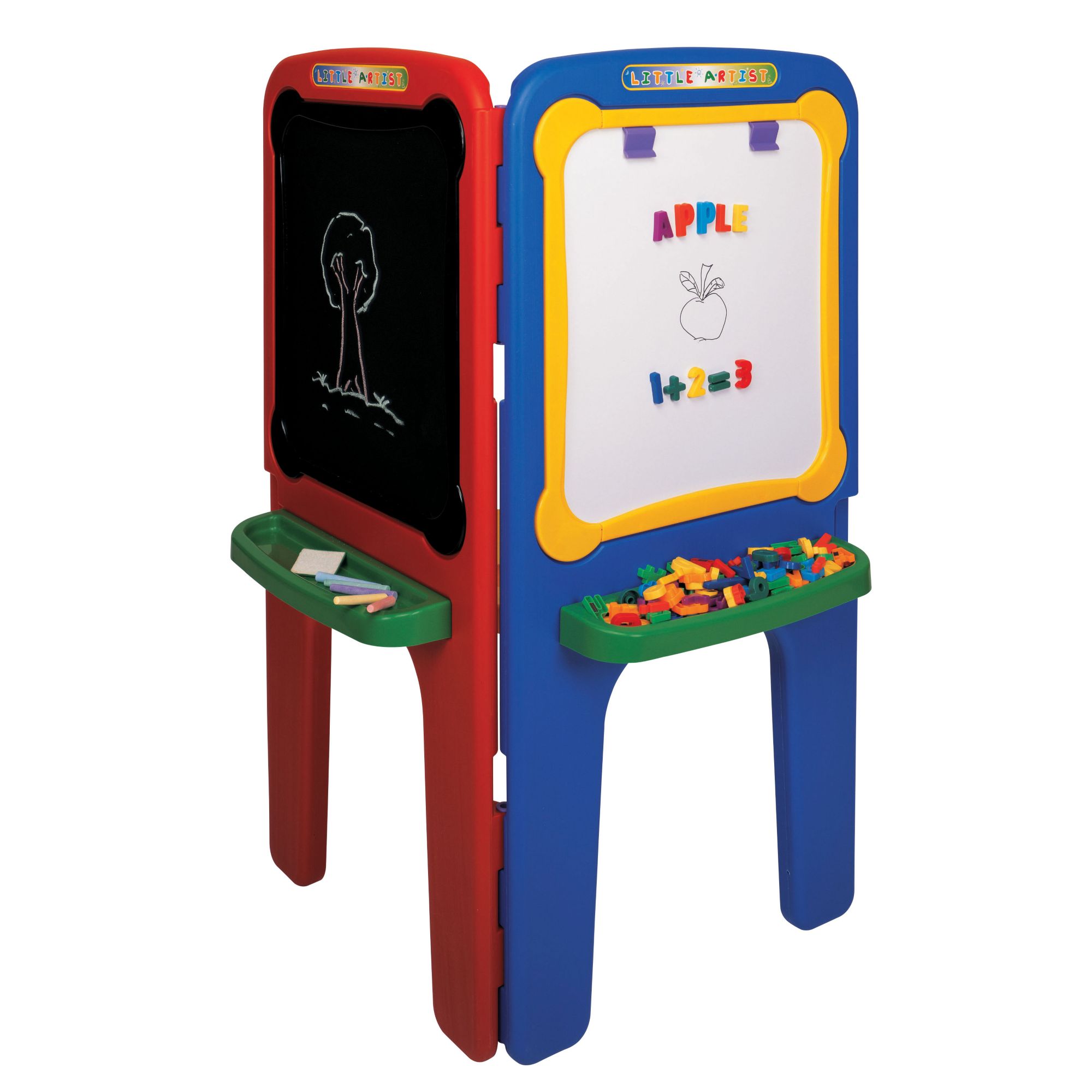 Magnetic white board, chalk board and painting board 2-sided drawing board for dual-sided play Folds for compact storage Large accessory tray 97 accessories Ages 3+ Includes learning easel, 84 magnetic letters and numbers, 6 pieces of colored chalk, 5 sheets of drawing paper, white board marker, eraser