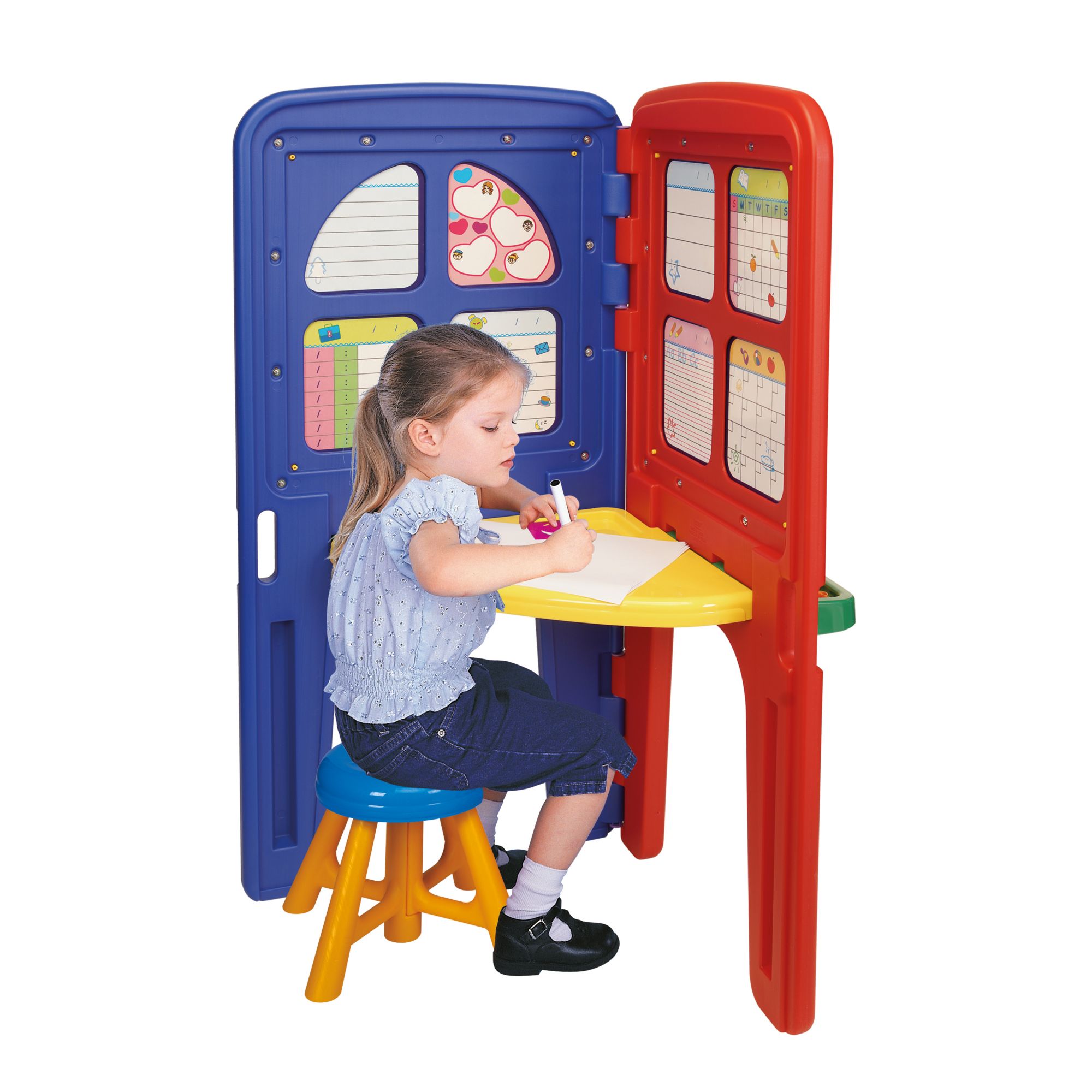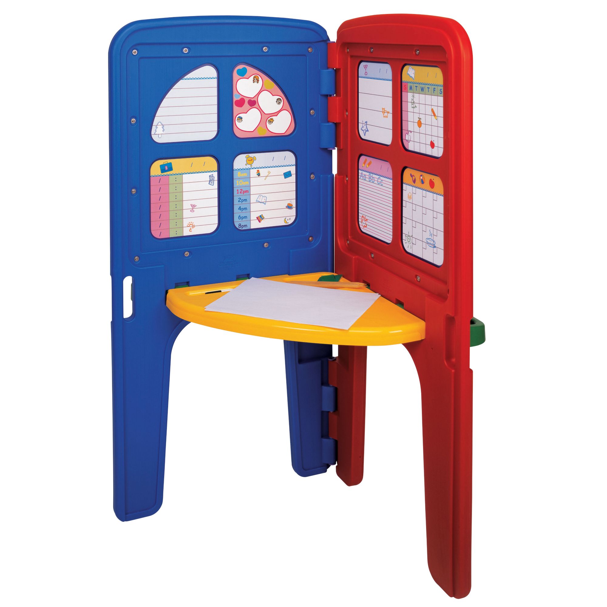 Little ones will love to express their creativity using this L-shaped double easel, featuring a magnetic white board, chalk board and painting board. 2 large accessory trays hold colored chalk and magnetic letters and numbers, while a folding tray on the reverse side is perfect for drawing and painting. The easel folds for compact storage.