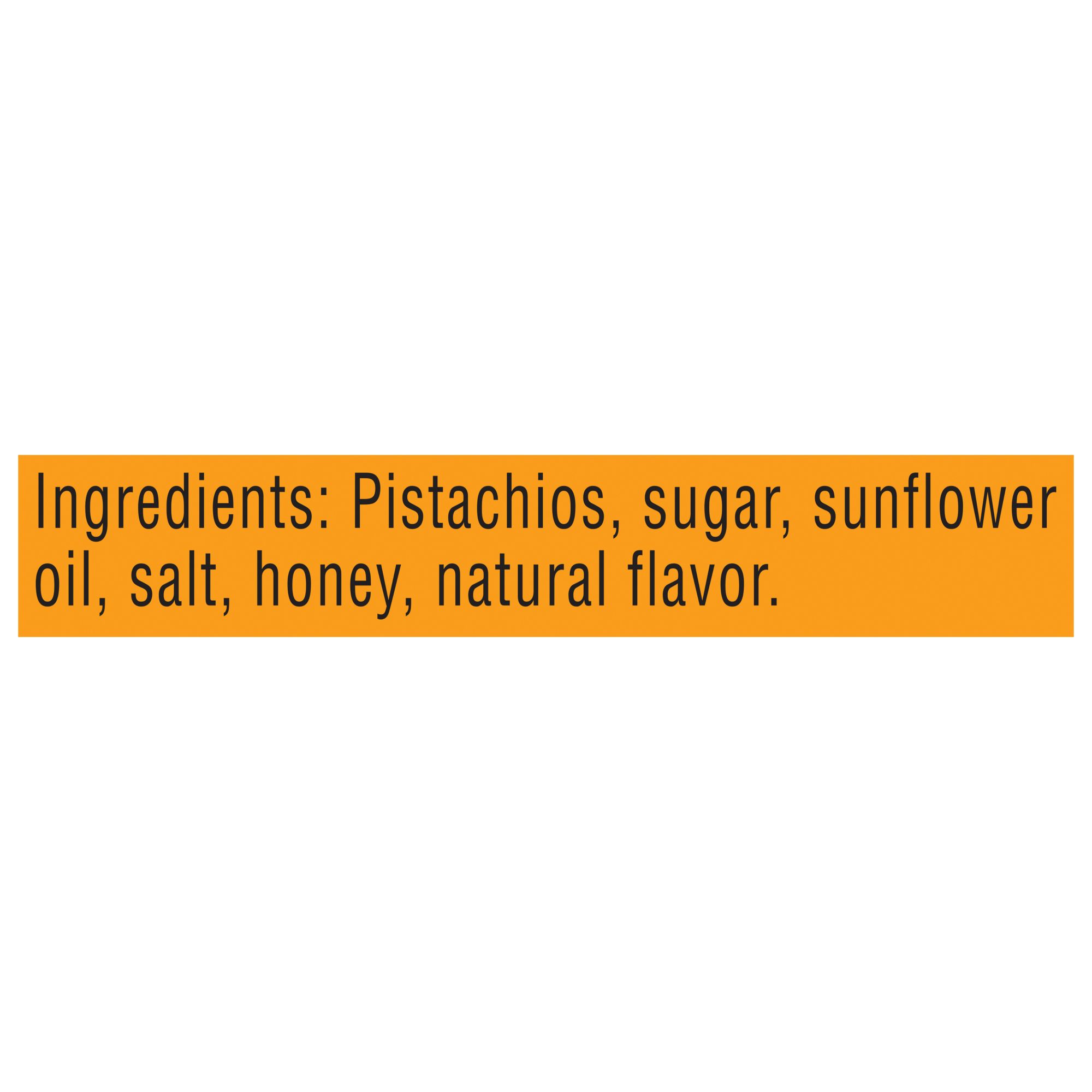 Ingredients: Pistachios, Sugar, Sunflower Oil, Salt, Honey, Natural Flavor.