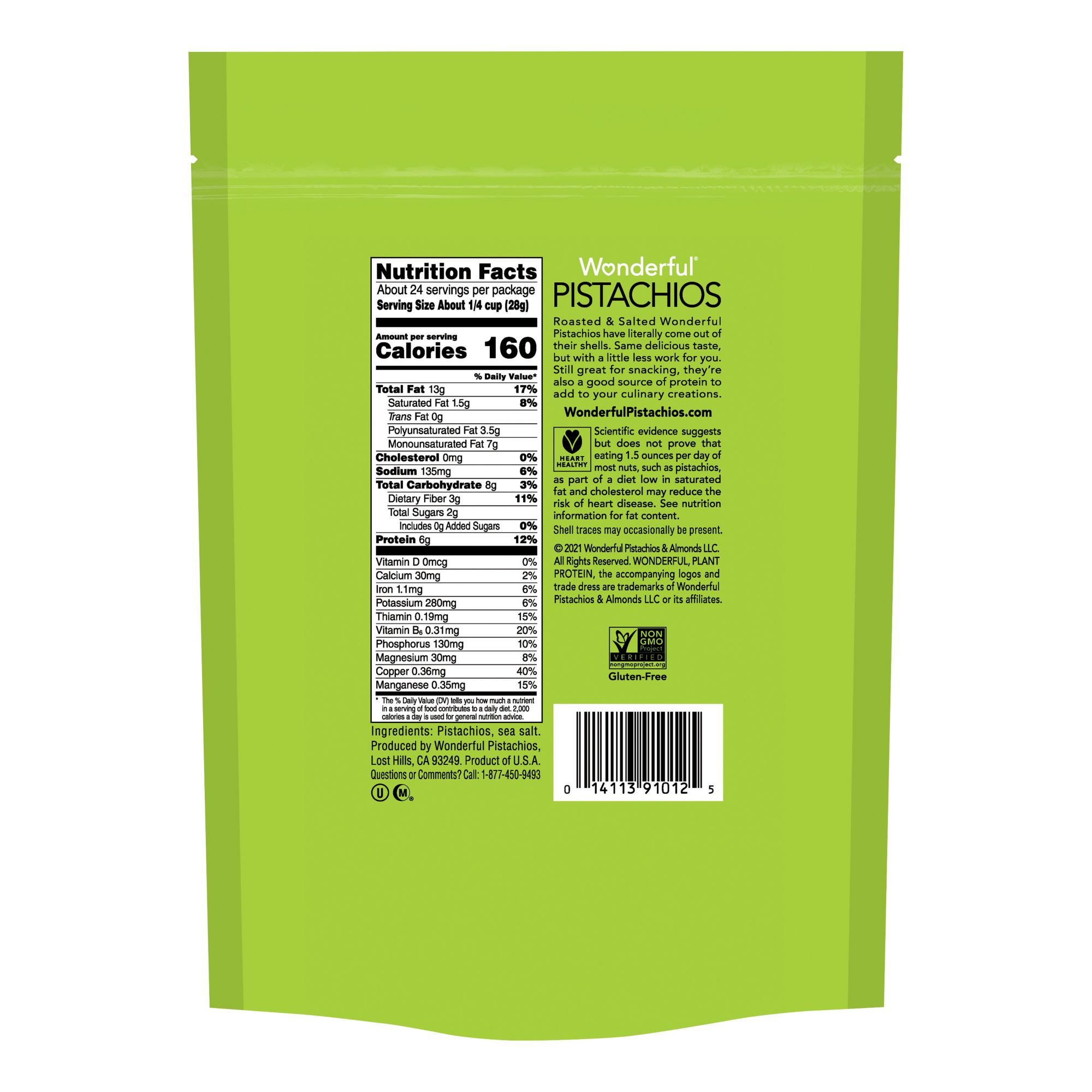 Simply Wonderful Pistachios: Gluten Free, Plant Based Protein, Kosher Certified, Halal Certified, and Non-GMO Project Verified. Contains tree nuts (pistachios), a good source of copper and vitamin B6.