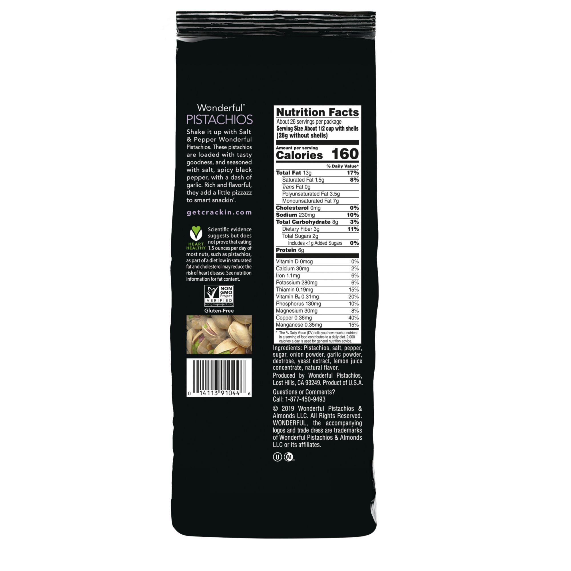One 48 ounce bag of Salt & Pepper In-Shell Wonderful Pistachios. Nutritious and healthy: Wonderful Pistachios is a good source of plant protein, with 6 grams in every serving. Every 1 oz. serving has 12% of your recommended Daily Value and is a complete protein powerhouse! Welcome to Wonderful: Wonderful Pistachios are a smart, healthy choice for folks around the world. Located in California’s fertile San Joaquin Valley, Wonderful Pistachios & Almonds owns, cultivates and harvests more than 75,000 acres of pistachio and almond orchards, and delivers pounds of nuts globally each year. The warm days and cool nights work in harmony with the region’s natural soils to create the perfect growing climate. Wonderful then carefully tends and harvests each pistachio using the latest in sustainable practices.