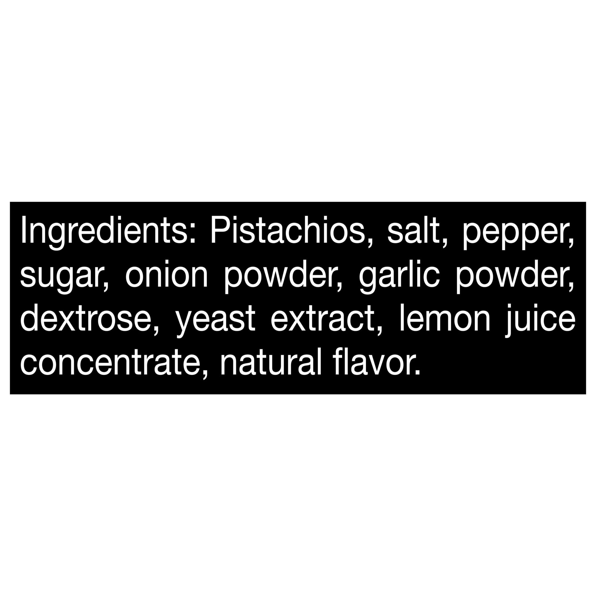 Ingredients: Pistachios, Salt, Pepper, Sugar, Onion Powder, Garlic Powder, Dextrose, Yeast Extract, Lemon Juice Concentrate, Natural Flavor.