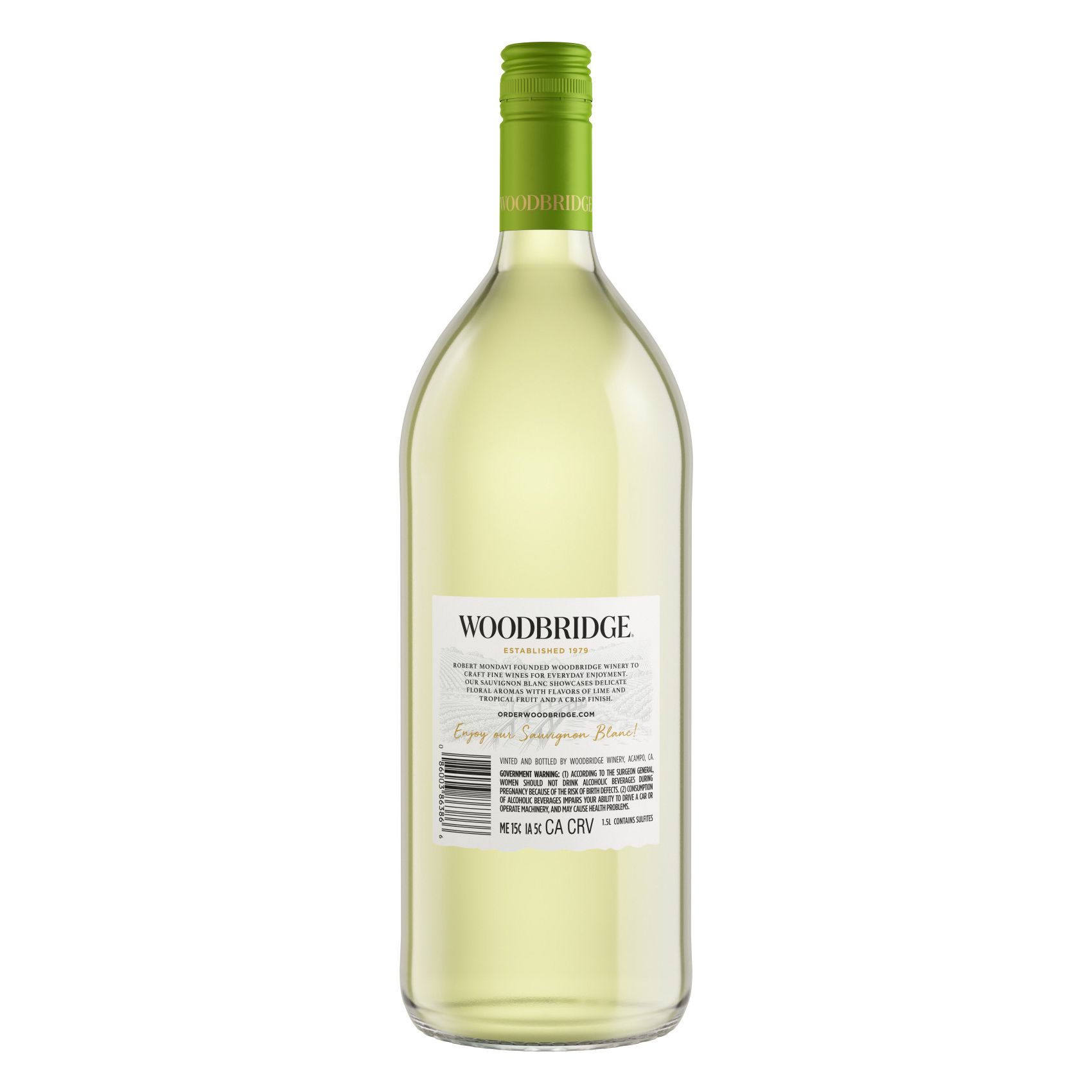 Woodbridge Sauvignon Blanc White Wine showcases delicate floral and citrus aromas complemented by fruit-forward flavors of lime and tropical fruits. This light-bodied table white wine is made with sauvignon blanc grapes sourced from California's celebrated Lodi region, where warm days and cool nights are ideal for growing premium grapes. Pair this Woodbridge Wine by Robert Mondavi with oysters and crab cakes or chicken dishes, or enjoy a glass of wine on its own, savoring its pleasantly crisp finish. To fully realize this California white wine's flavor, chill this larger 1.5 liter bottle of wine in the refrigerator for two to two and a half hours before serving chilled at around 50 degrees. Winner of multiple Wine Enthusiast Best Buy awards since 2011, Woodbridge is Wine Your Way. Please enjoy our wines responsibly. 2025 Woodbridge Winery, Acampo, CA.