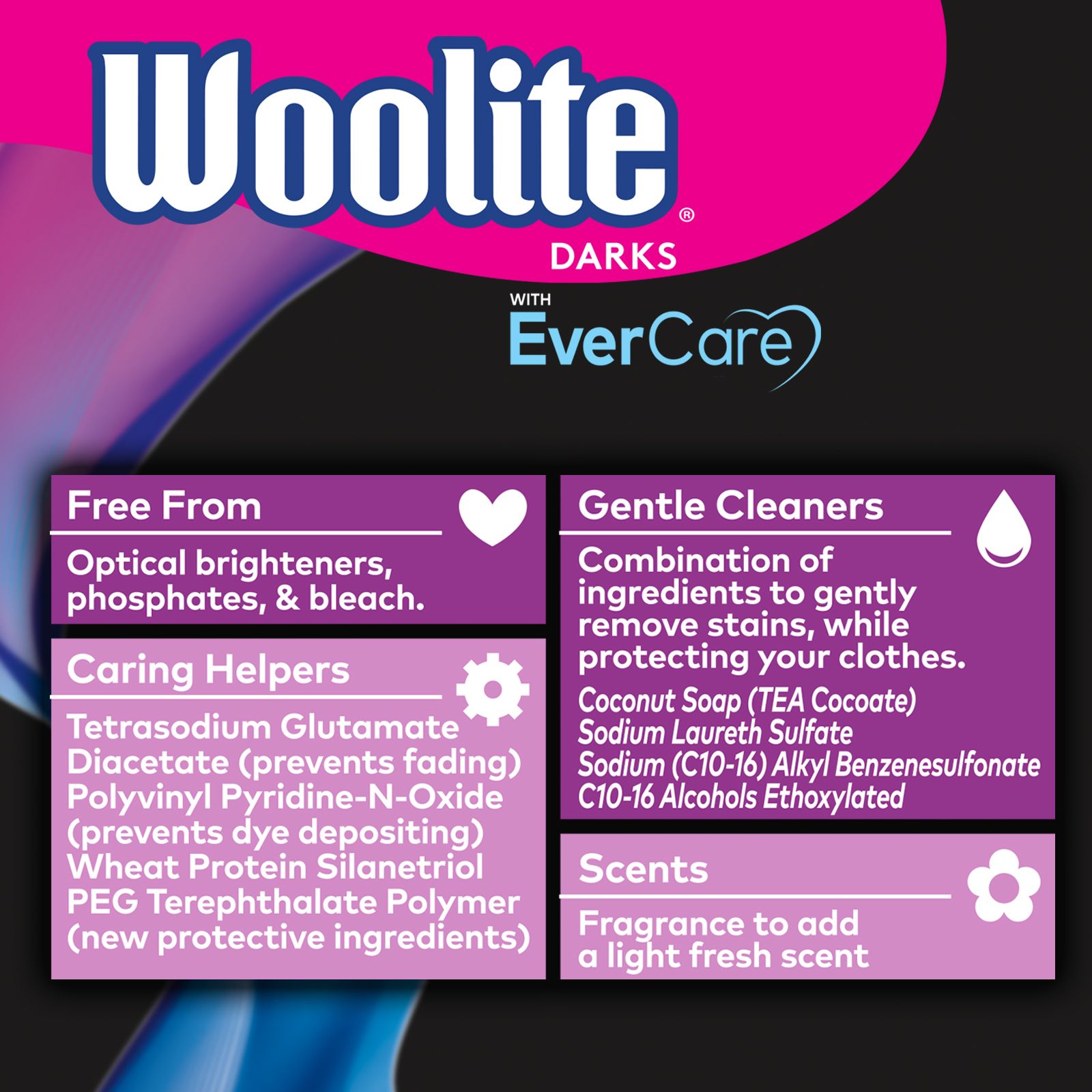 Woolite Darks with DarkDefense keeps your clothes looking like new, even synthetics and blends.* It protects your clothes from fading, pilling, and stretching.** Woolite Darks with EverCare is perfect for all of your dark clothes, including your favorite jeans, leggings, and go-to blouse. It effectively cleans without the harshness. Woolite Darks with DarkDefense is free from optical brighteners, phosphates, and bleach.