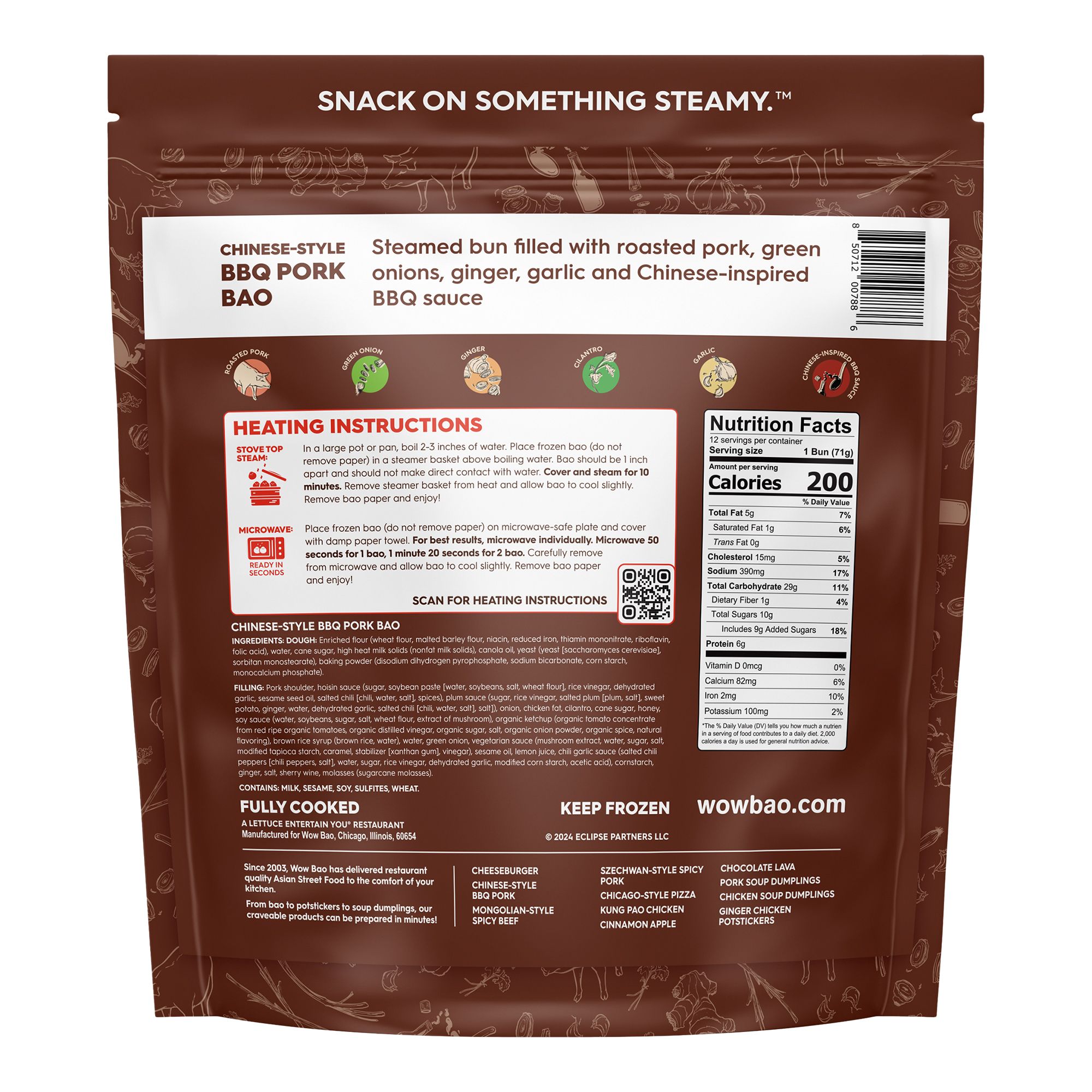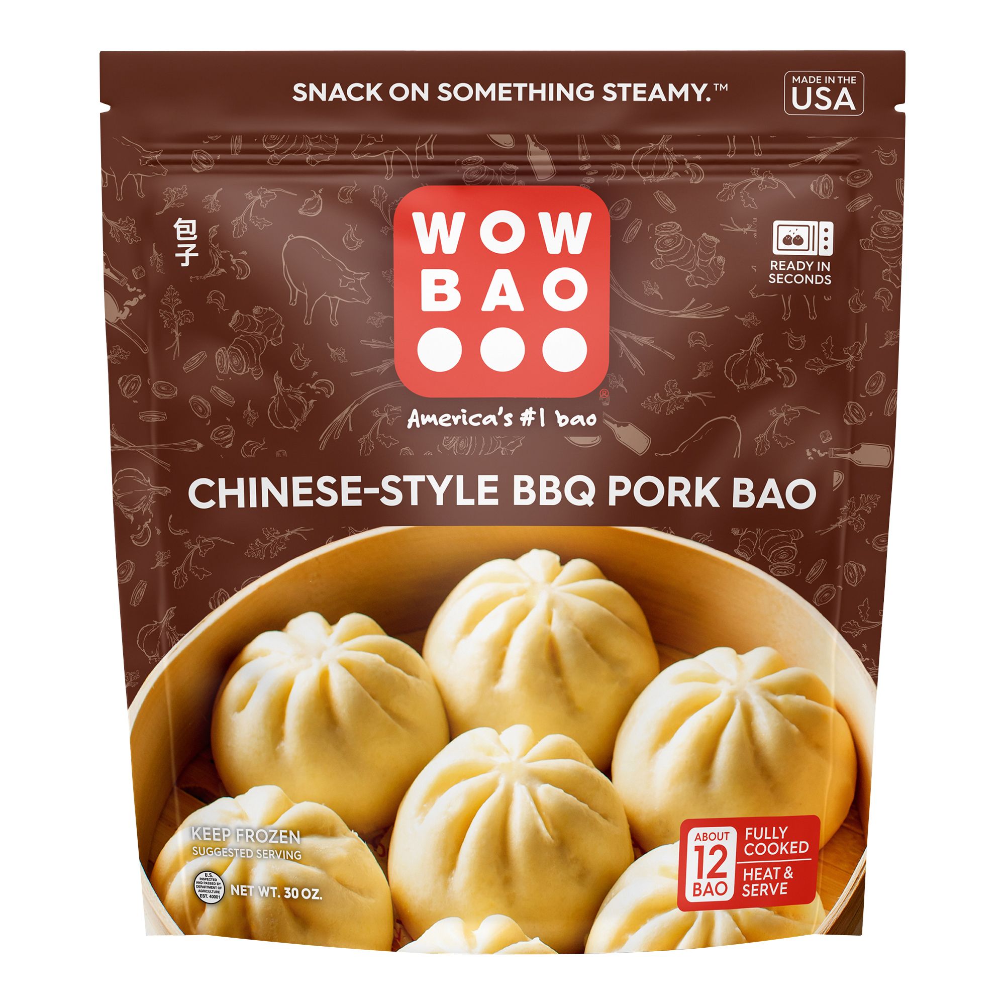 Wow Bao's Chinese-Style BBQ Pork Bao is a steamed bun filled with roasted pork, green onions, ginger, garlic, and Chinese-inspired BBQ sauce. It's one of Wow Bao's signature bao and contains all the savory flavors of traditional Chinese BBQ wrapped in an Asian bun. Chinese-Style BBQ Pork Bao are a quick and easy way to enjoy this rich Asian flavor profile – ready in minutes when steamed on the stovetop, or in just seconds from the microwave.