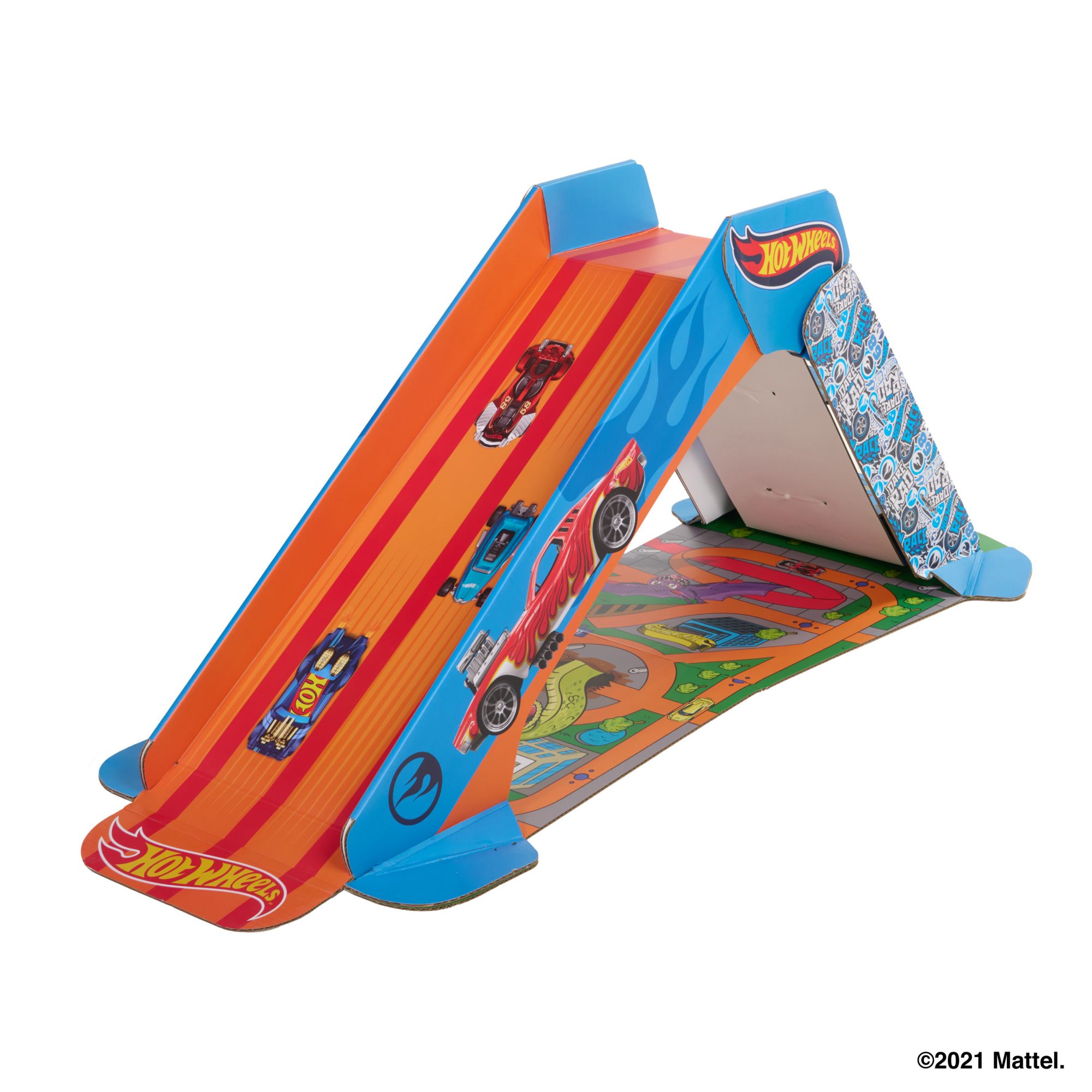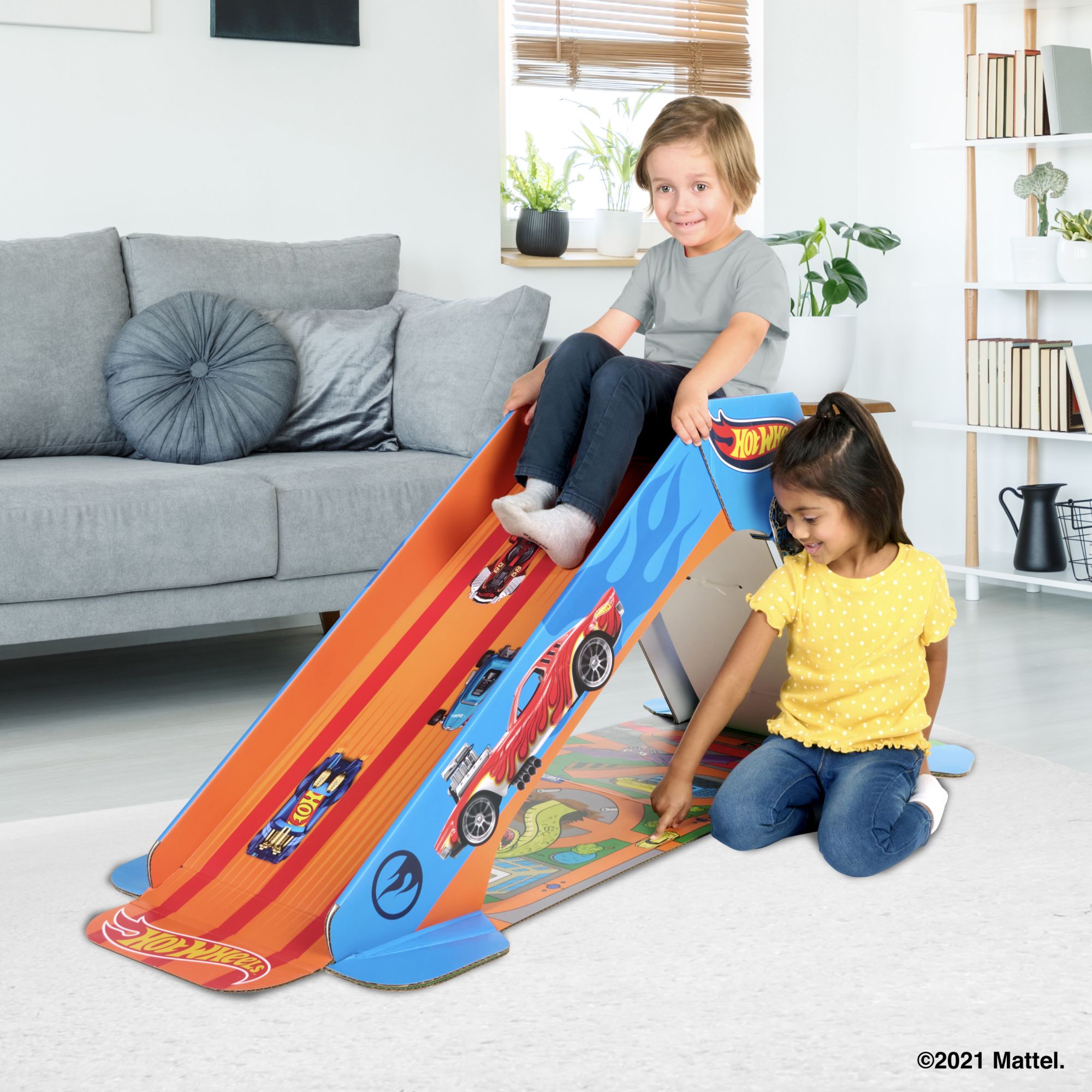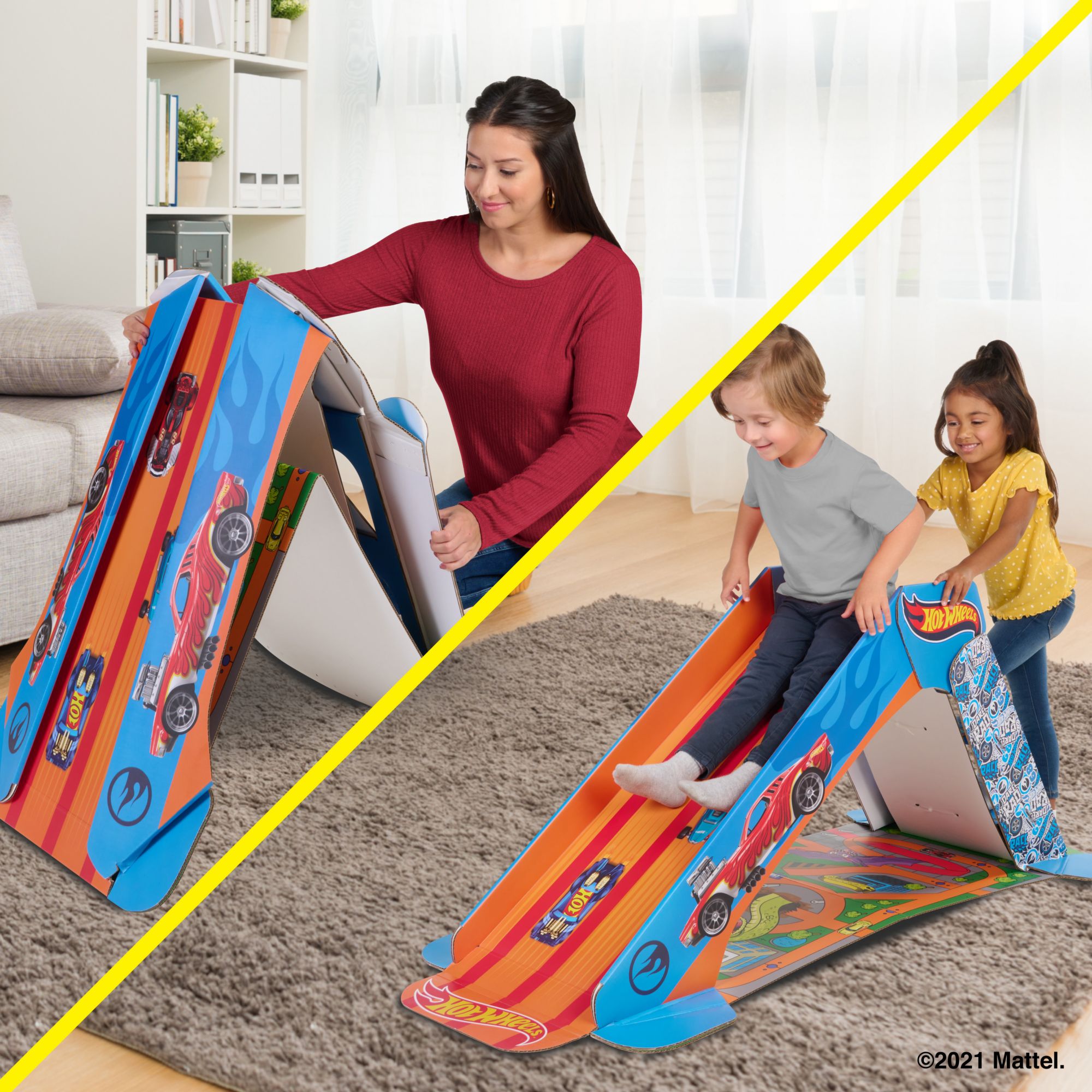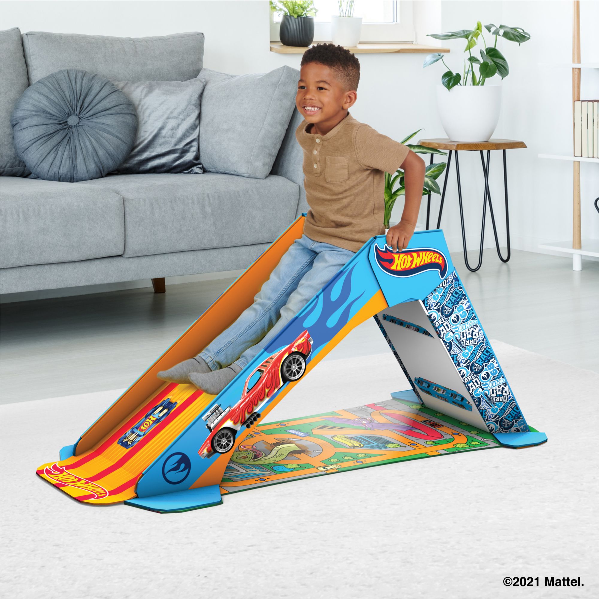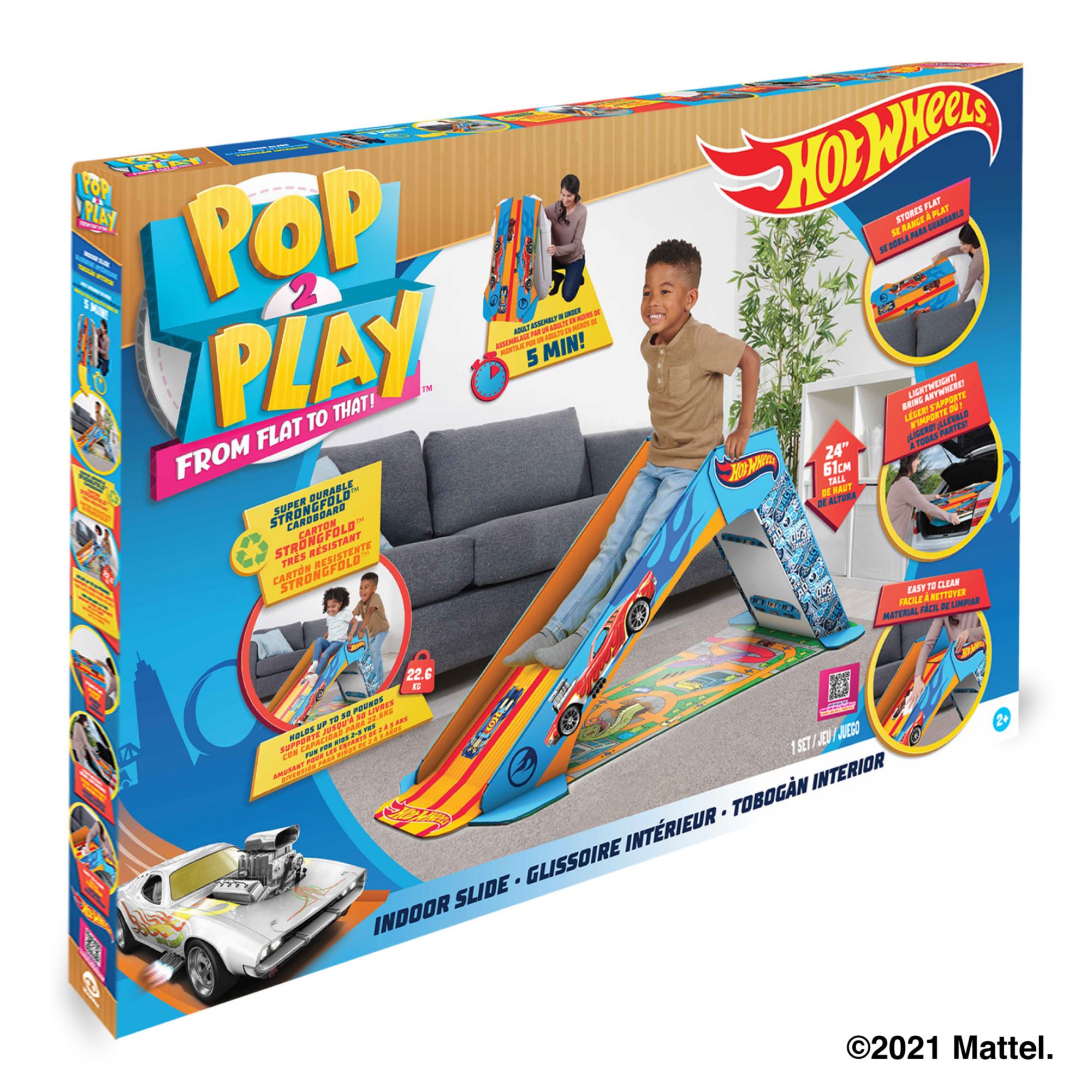 Bring the playground home Don’t let the weather dictate when your kids can go to the park to run around Rain or shine, this hot wheels indoor slide is ready to deliver hours of fun at the snap of a finger Super sturdy. The patented strong fold cardboard supports up to 50 lbs. and is super durable and safe (push in the side flaps for added reinforcement) Product size: 28"L x 25"W x 59"H. Ages 2-5 Spacesaver. Tired of toys piling up? Say goodbye to messy playrooms and crowded living rooms Pop2Play, then pop it away. Folds flat so you can easily put it away when you’re done Pop up the fun. Instantly turn any room into a play area Lightweight and portable, take this toddler slide with you wherever you go, and keep your young ones entertained for hours. Who said playing indoors is boring? Easy assembly, easier cleanup. Most playsets take time to put together, are difficult to store, and are expensive to buy. Not this one Pop2Play’s budget-friendly fold-away kid's slide assembles in a snap and is just as easy to wipe clean Includes one Pop2Play Hot Wheels slide