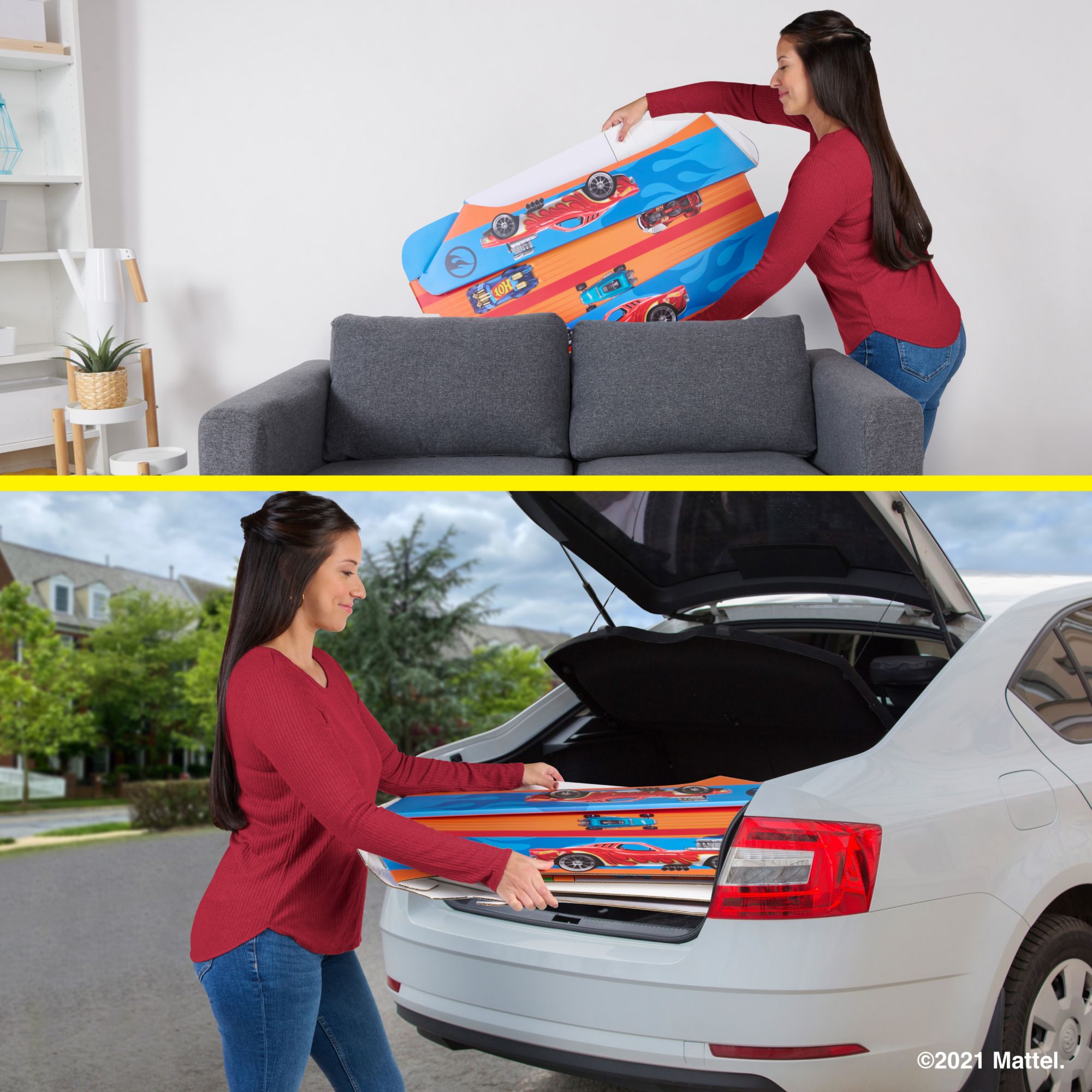 Made for kids with parents in mind. Pop2play, from WowWee, introduces a new and innovative way to play without a big mess getting in the way. Rain or shine, this Hot Wheels indoor slide is ready to deliver hours of fun at the snap of a finger. This storable, pop-up playset can be assembled in under 5 minutes and folds flat for easy storage. Each pop2play hot wheels slide is made from super durable stronghold cardboard that can hold up to 50 lbs., and be wiped clean with ease. The Pop2play Hot Wheels slide also doubles as a racetrack for your very own hot wheels vehicles. Ideal for kids aged 2-5, it’s the first of its kind playset that can transform any living space into the perfect playroom and then folds flat behind, or under, any couch or bookcase out of the way. Each Pop2play Hot Wheels slide comes with one fully assembled slide. Product size: 59 by 25 by 28.