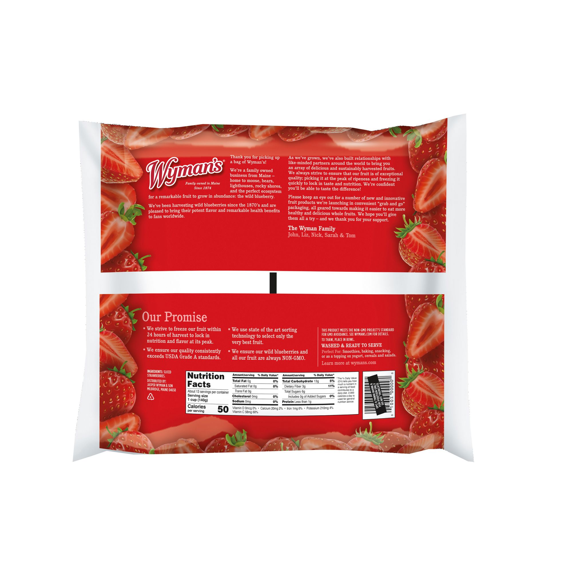 Calling all strawberry lovers! Enjoy the sweet flavor of summer all year 'round with Wyman's delicious fresh-frozen strawberries. Ideal for smoothies, desserts, sauces, and more, these strawberries are bursting with antioxidant vitamin C and heart-healthy fiber. To lock in nutrition and fresh taste, all of Wyman's fruit is harvested, washed and flash frozen within 24 hours of being picked. What a treat - ready to eat and in a convenient resealable package of course!