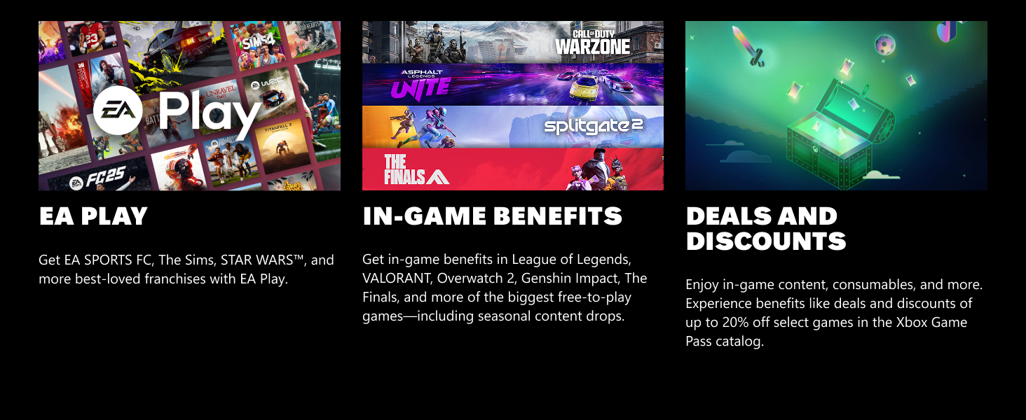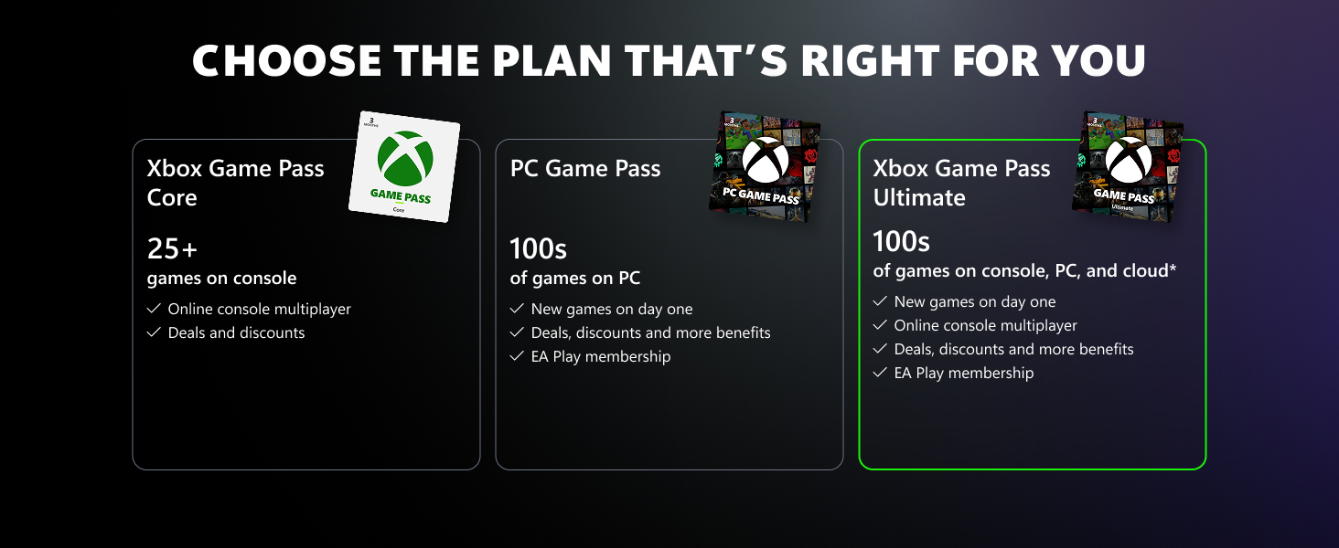 Enjoy hundreds of high-quality games with Xbox Game Pass Ultimate. Play new games on day one like Starfield from Bethesda Softworks as well as iconic franchises like Halo from Xbox Game Studios, indie games, blockbusters, and more. Includes online multiplayer so you can play together with friends on console, PC, and cloud. Plus, an EA Play membership gives you access to top titles on console and PC, including best-loved series like Battlefield and Star Wars. Get more from the games you love, including exclusive in-game challenges and rewards, special member-only content, and early trials of select new EA titles. Tap into the heart of the Xbox community and join millions of players ready to play together with Xbox Cloud Gaming (Beta). Jump in on your Xbox Series X|S and Xbox One —no installs required. With Game Pass Ultimate, you also get free Perks including in-game content, consumables, and more. Get member discounts off select games in the Xbox Game Pass library and related game add-ons. Discover and keep playing a game with cloud gaming across console, Windows PC, or phones and tablets. Redeem at microsoft.com/redeem