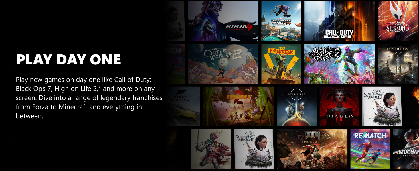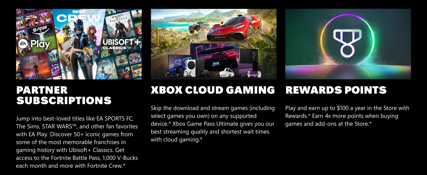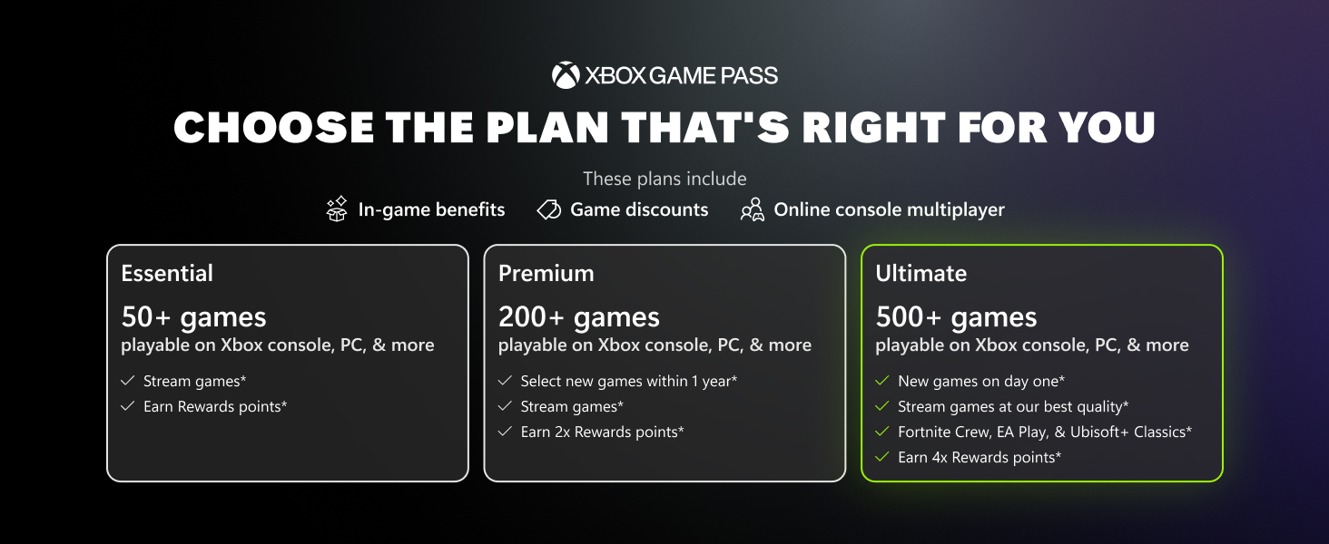 Enjoy hundreds of high-quality games with Xbox Game Pass Ultimate. Play new games on day one like Starfield from Bethesda Softworks as well as iconic franchises like Halo from Xbox Game Studios, indie games, blockbusters, and more. Includes online multiplayer so you can play together with friends on console, PC, and cloud. Plus, an EA Play membership gives you access to top titles on console and PC, including best-loved series like Battlefield and Star Wars. Get more from the games you love, including exclusive in-game challenges and rewards, special member-only content, and early trials of select new EA titles. Tap into the heart of the Xbox community and join millions of players ready to play together with Xbox Cloud Gaming (Beta). Jump in on your Xbox Series X|S and Xbox One —no installs required. With Game Pass Ultimate, you also get free Perks including in-game content, consumables, and more. Get member discounts off select games in the Xbox Game Pass library and related game add-ons. Discover and keep playing a game with cloud gaming across console, Windows PC, or phones and tablets. Redeem at microsoft.com/redeem
