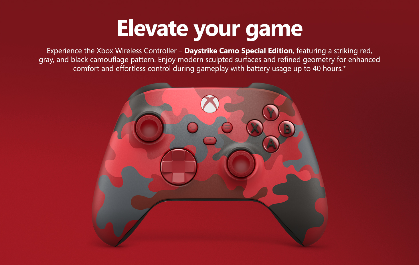 Experience the Xbox Wireless Controller Daystrike Camo Special Edition, featuring a striking red, gray, and black camouflage pattern. Enjoy modern sculpted surfaces and a refined geometry for enhanced comfort during gameplay with battery usage of up to 40 hours. Stay on target with a hybrid D-pad and textured grip on the triggers, bumpers, and back-case.