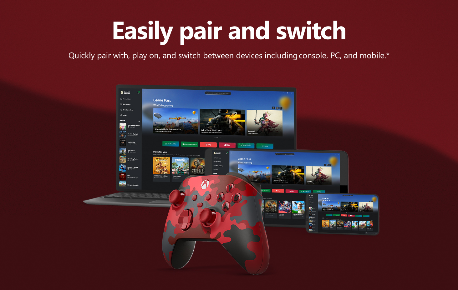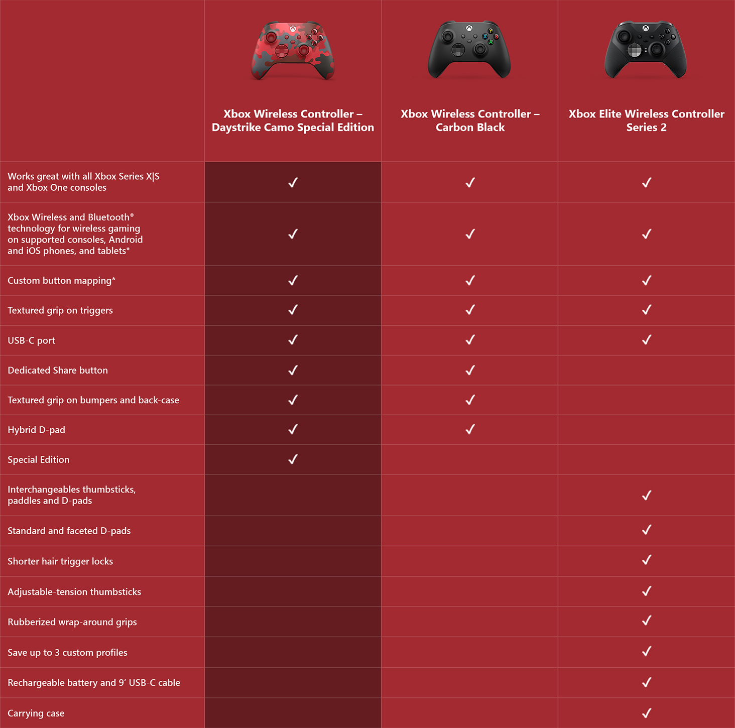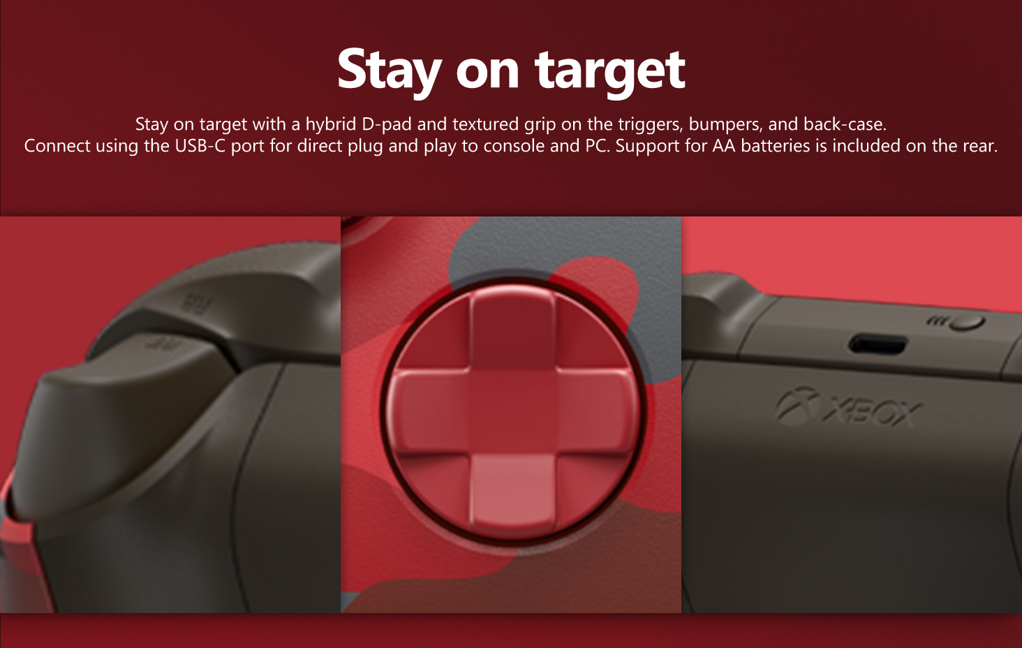 Experience the Xbox Wireless Controller Daystrike Camo Special Edition, featuring a striking red, gray, and black camouflage pattern Enjoy modern sculpted surfaces and a refined geometry for enhanced comfort and effortless control during gameplay with battery usage of up to 40 hours Make the controller your own by customizing button mapping Plug into any compatible headset with the 3.5mm audio headset jack Xbox Wireless and Bluetooth technology for wireless gaming on supported consoles, Windows 10 PCs, Android and iOS phones, and tablets Stay on target with textured grip on the triggers, bumpers, and back case and with a new hybrid D-pad for accurate, yet familiar input Seamlessly capture and share content such as screenshots, recordings, and more with the new Share button Easily pair and switch between devices including Xbox Series X, Xbox One, Windows 10 PCs, iOS, and Android Includes controller, 2/AA batteries