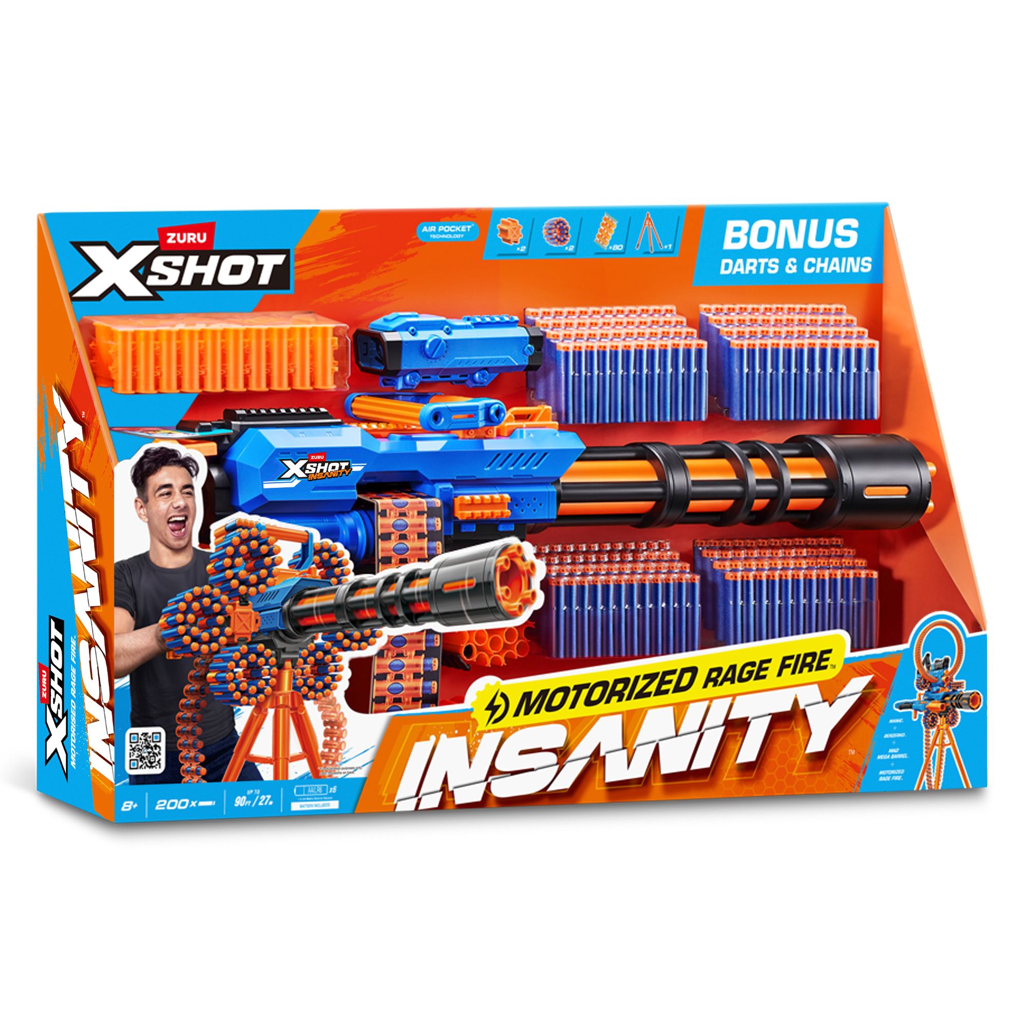 Insane combos, ammo and action with XSHOT Insanity. The Motorized Rage Fire is so big it needs a tripod, so we threw one in. Load up its 40 dart auto feeding belt to take out multiple targets from up to 27m / 90 feet away in seconds. Plus it comes with an insane amount of accessories and dart storage to hold an additional 46 darts. Plus, get bonus darts and chains in this handy pack. Take your blaster game to the next level