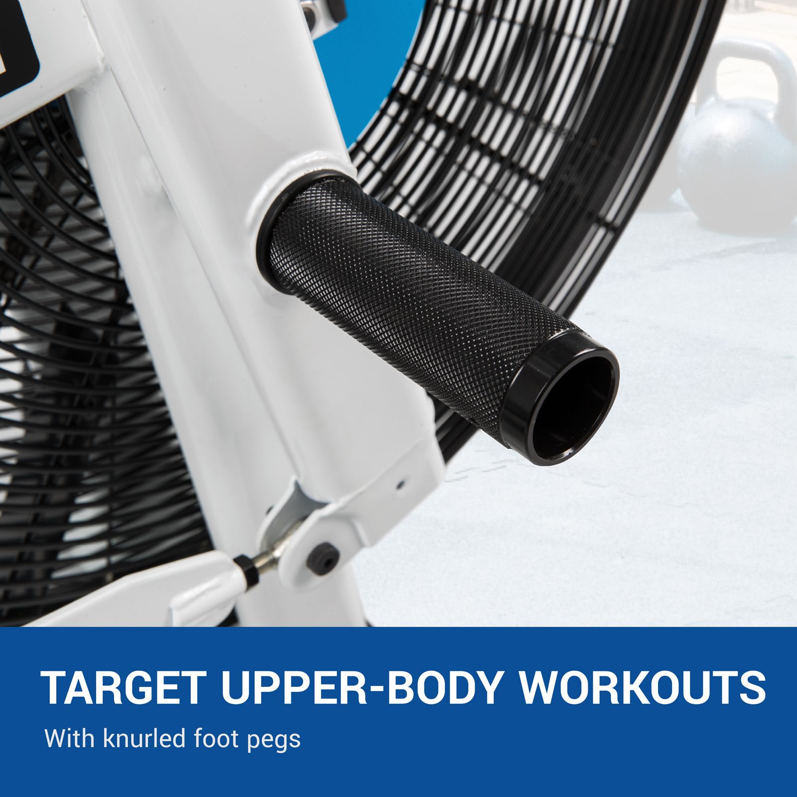 Smooth and unlimited air resistance provides low resistance at slow speeds and high resistance at fast speeds – completely user-controlled and great for anything from rehab to high-intensity interval training Industrial grade chain drive system operates as a fixed gear (direct drive) and is extremely durable and reliable Performance monitor LCD display is easy to read with all your necessary information - RPM, speed, time, distance, calories, watt, interval prompt, and heart rate. A chest strap transmitter (not included) is required for a heart rate display to function Quick mode program buttons include target time, target distance, target calories, target HR, interval 20-10, interval 10-20, and interval custom Performance designed seat enables maximum exercise mobility while still providing support and comfort Ergonomic handlebars are designed with multiple padded grip options and are built to take the most intense upper body workouts Wide, low profile pedals are anti-skid with dual-sided molded pegs for an excellent grip Large foot pegs are knurled for better grip, allowing user to rest their feet during targeted upper-body workouts The seat is fully adjustable (up/down/forward/back) to provide users with a proper fit Includes XTERRA AIR650 air bike, owner's manual, four "AA" batteries