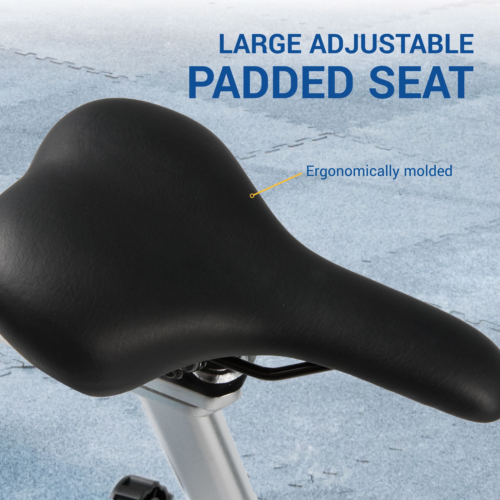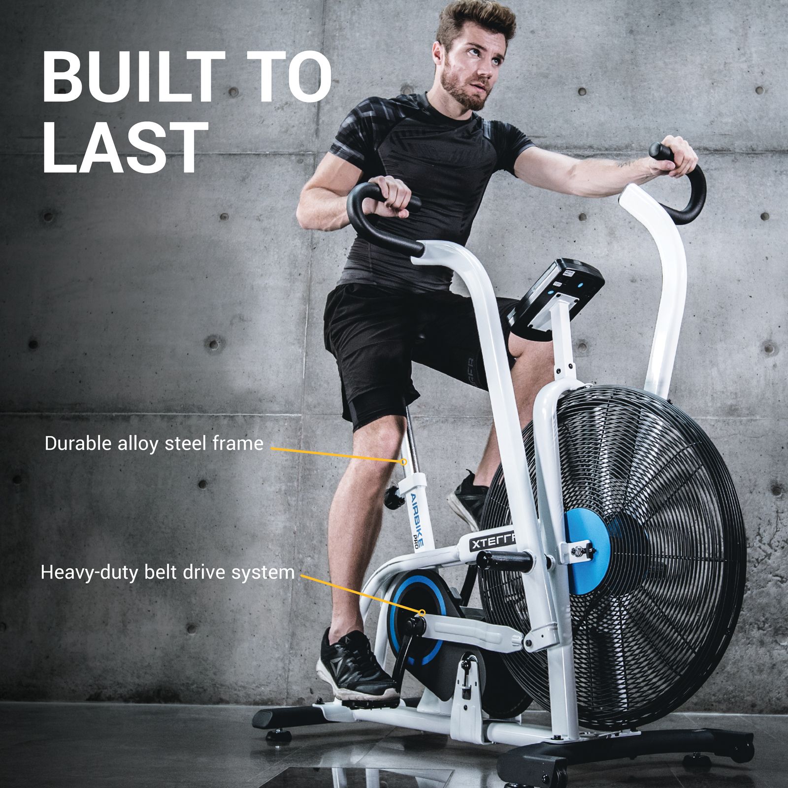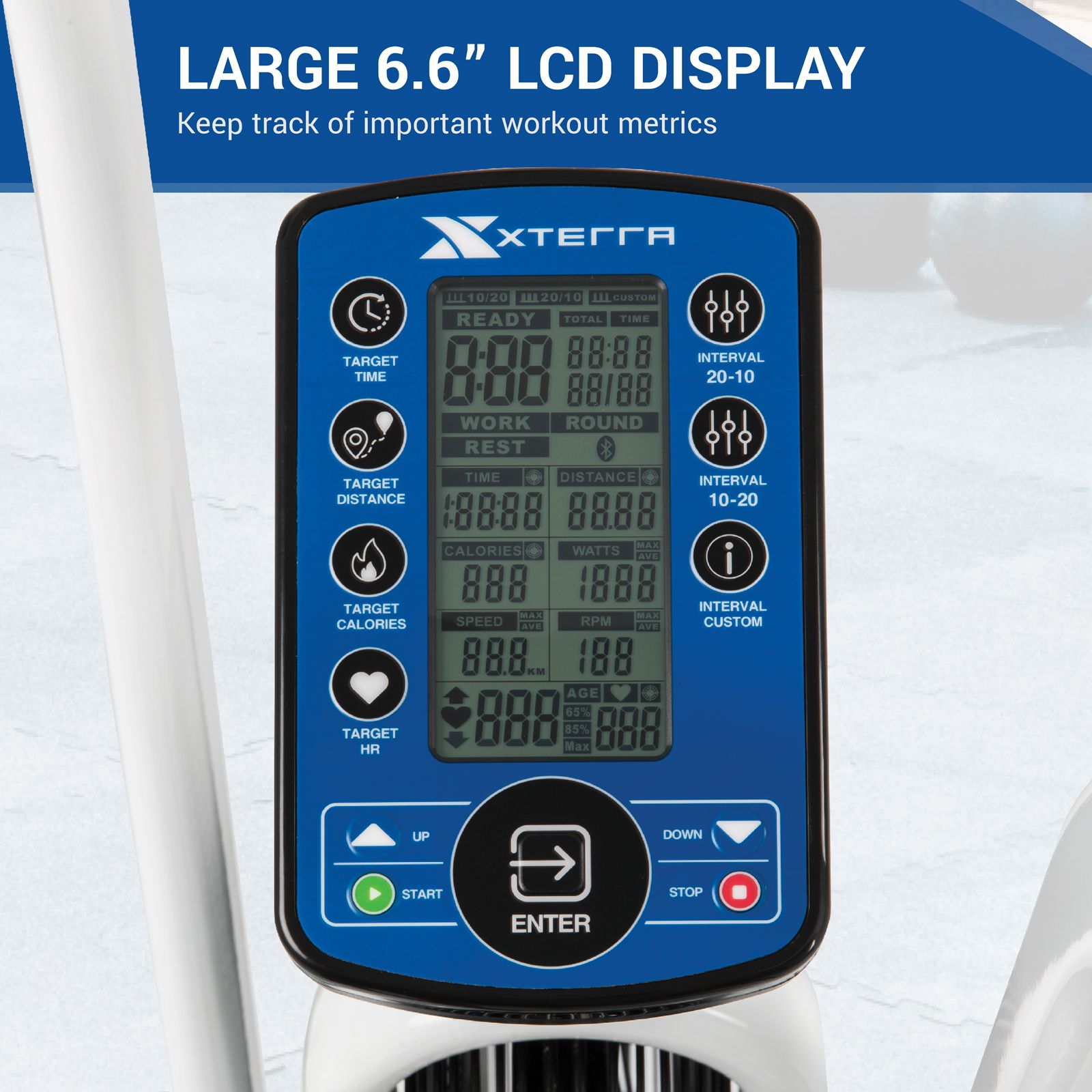Smooth and unlimited air resistance provides low resistance at slow speeds and high resistance at fast speeds – completely user-controlled and great for anything from rehab to high-intensity interval training Industrial grade chain drive system operates as a fixed gear (direct drive) and is extremely durable and reliable Performance monitor LCD display is easy to read with all your necessary information - RPM, speed, time, distance, calories, watt, interval prompt, and heart rate. A chest strap transmitter (not included) is required for a heart rate display to function Quick mode program buttons include target time, target distance, target calories, target HR, interval 20-10, interval 10-20, and interval custom Performance designed seat enables maximum exercise mobility while still providing support and comfort Ergonomic handlebars are designed with multiple padded grip options and are built to take the most intense upper body workouts Wide, low profile pedals are anti-skid with dual-sided molded pegs for an excellent grip Large foot pegs are knurled for better grip, allowing user to rest their feet during targeted upper-body workouts The seat is fully adjustable (up/down/forward/back) to provide users with a proper fit Includes XTERRA AIR650 air bike, owner's manual, four "AA" batteries