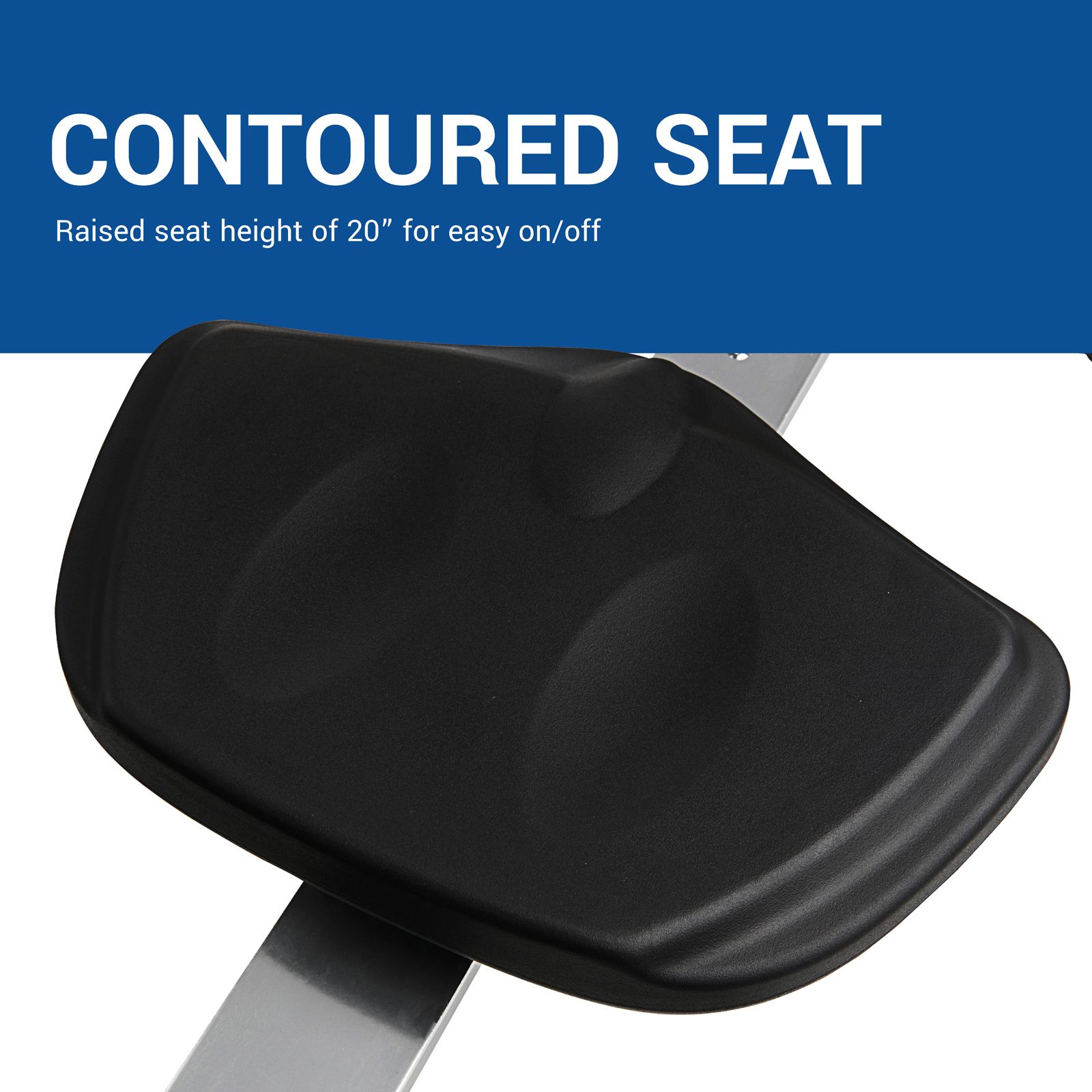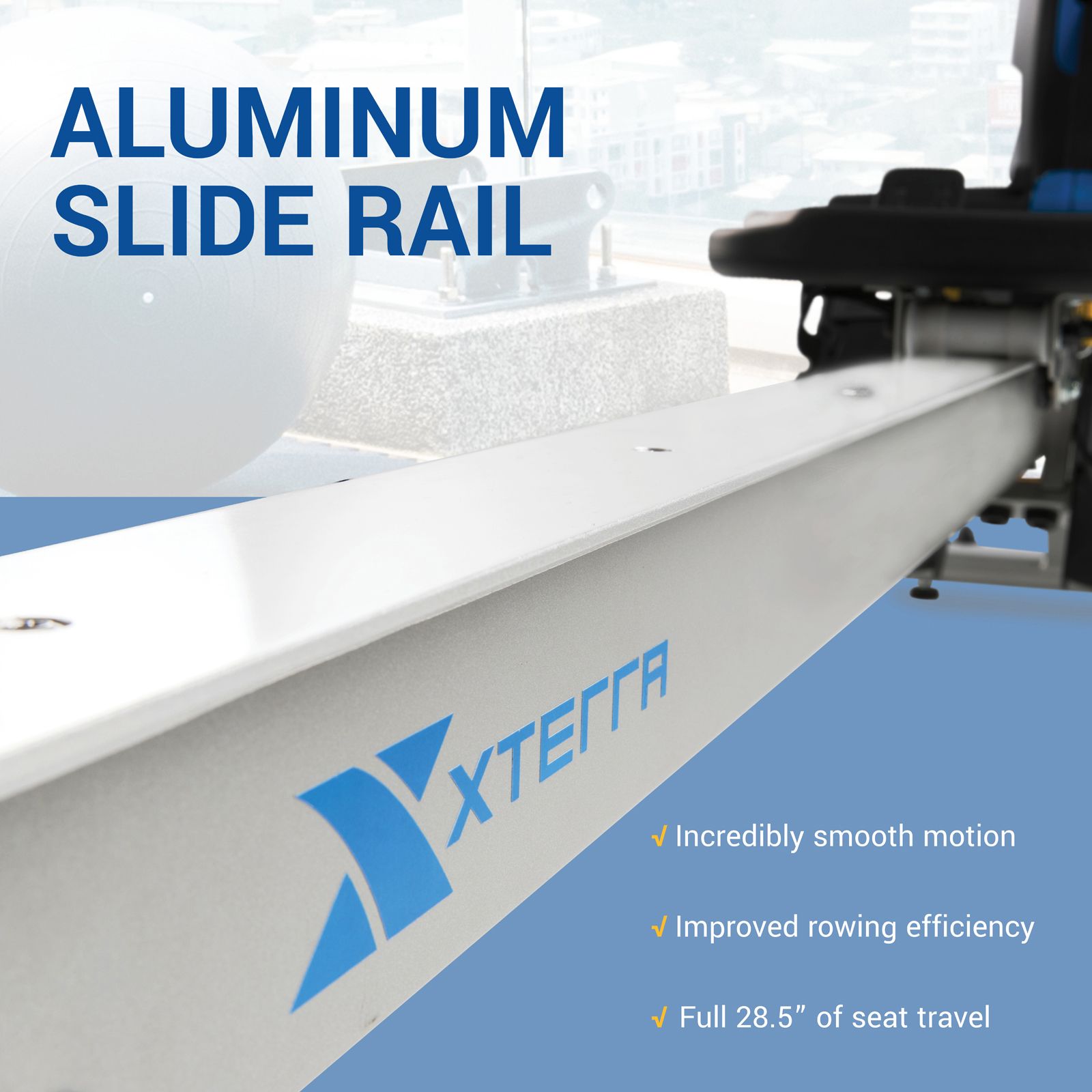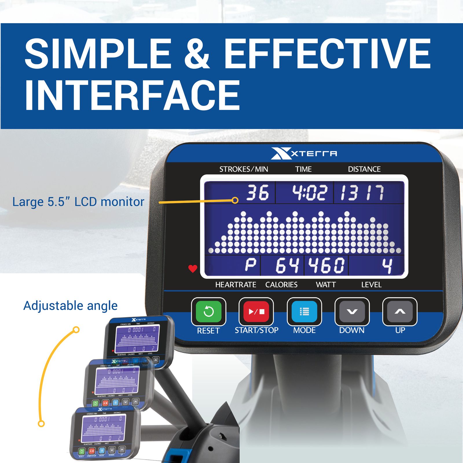 Combination of both air and magnetic resistance (16 levels) simulates the feel of rowing Ergonomic rowing handle is contoured and padded for superior feel and comfort with a full 80.7" of travel length 20" frame height gets you on and off the rower with ease Console display features a large 5.5" bright blue backlit LCD with easy touch buttons and height and angle adjustment for the perfect viewing angle 10 effective programs offer a wide variety of workouts including distance, time, calories, 20/10 interval, 10/20 interval, custom interval, fat burn, cardio, strength, game, and manual Large contoured seat maximizes comfort and performance Built-in HR receiver (chest strap sold separately) Solid steel frame with smooth aluminum seat slide provides an incredibly smooth motion for improved rowing efficiency Fold up frame design with built-in transport wheels allow for moving your equipment when not in use Includes XTERRA ERG700 rower, owner's manual, power cord