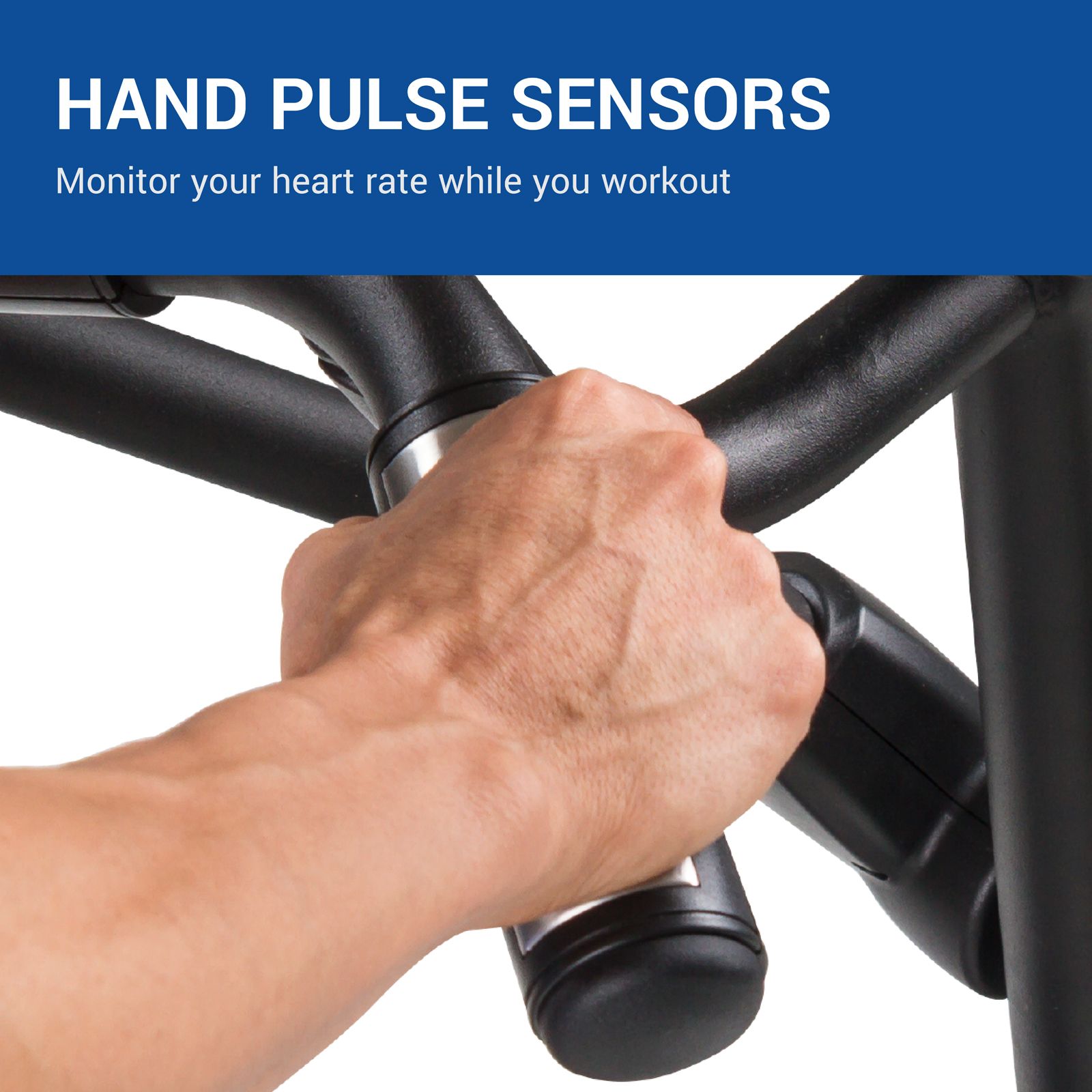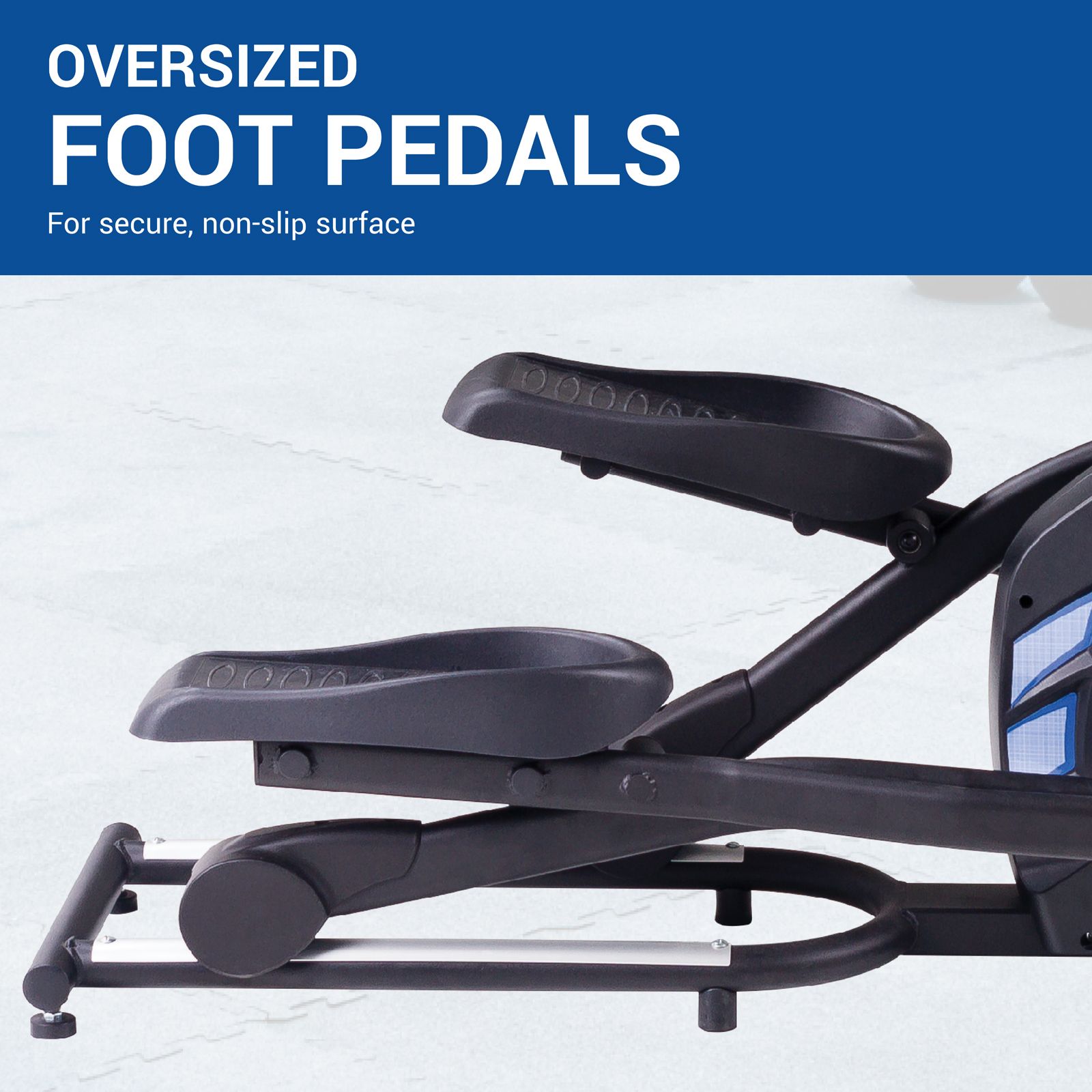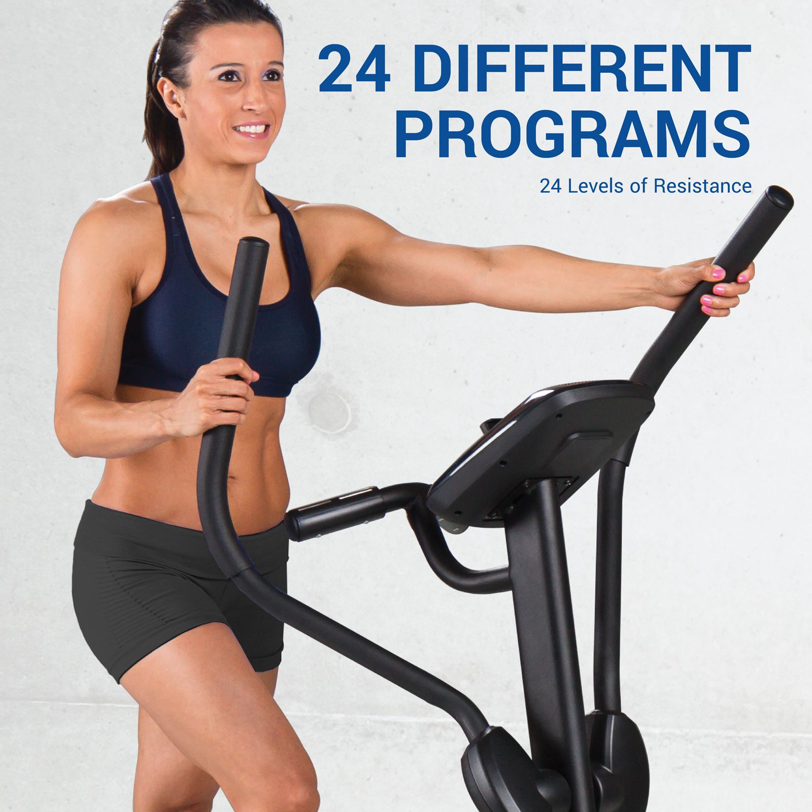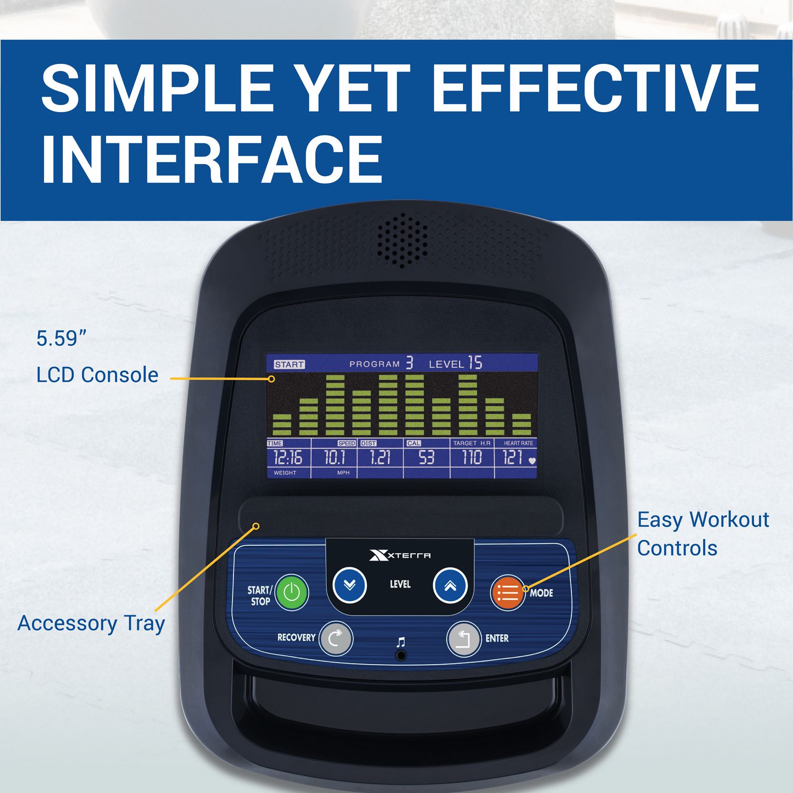 Ergonomic 17" stride length provides a comfortable elliptical motion Aluminum wheel tracks allow the pedals to slide smoothly with minimal friction Blue and yellow backlit LCD window (5" x 2.5") is easy to read with all the necessary information – clearly displays program profile, time, speed, distance, calories, pulse, and resistance level Motivating programs include 12 pre-set, one body fat program, 1W program, four user defined programs, four heart rate control programs, one target heart rate program and a manual program Built-in audio jack with speaker for MP3 player Pulse grips enable you to monitor your heart rate at all times and are conveniently located Belt drive system and friction-free magnetic resistance provide smooth, quiet, and maintenance free operation 24 levels of resistance provides a variety of exercise options Oversized foot pedals add comfort to your workout while providing a secure non-slip surface Includes XTERRA FS3.5 elliptical, owner's manual, power cord