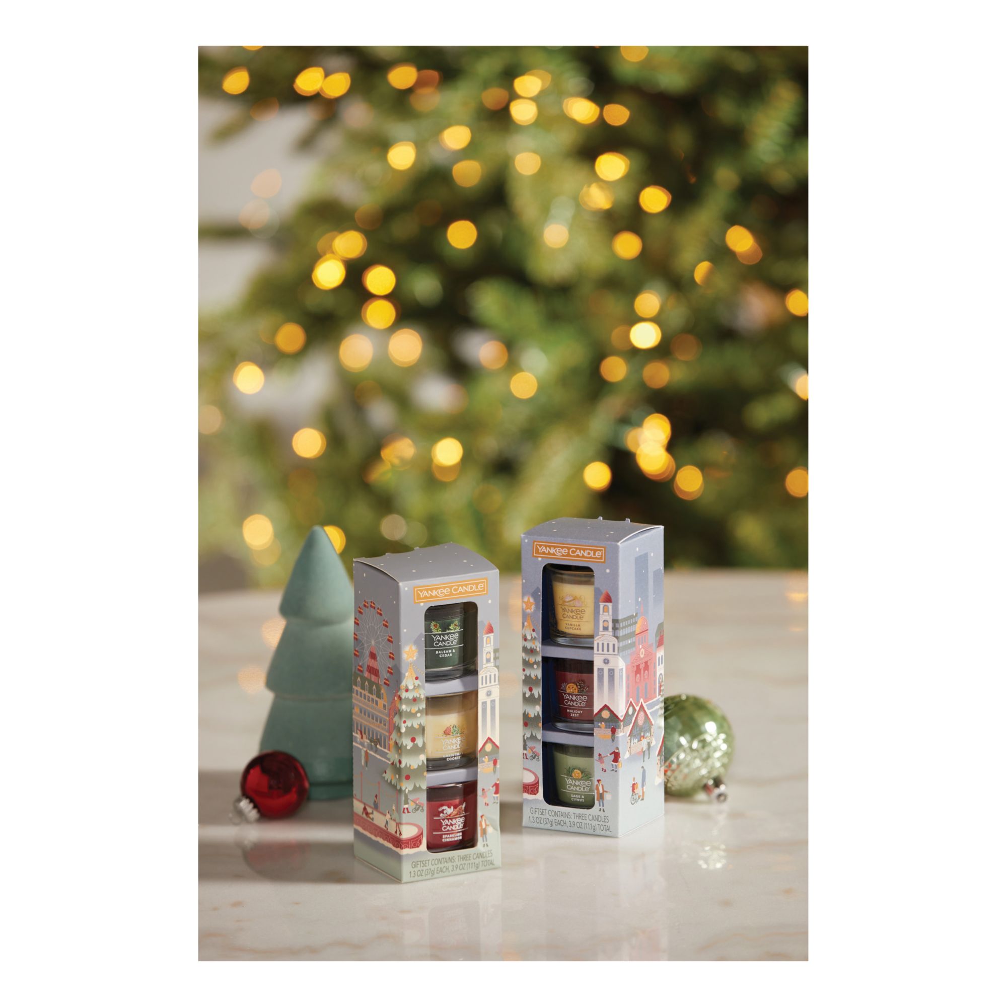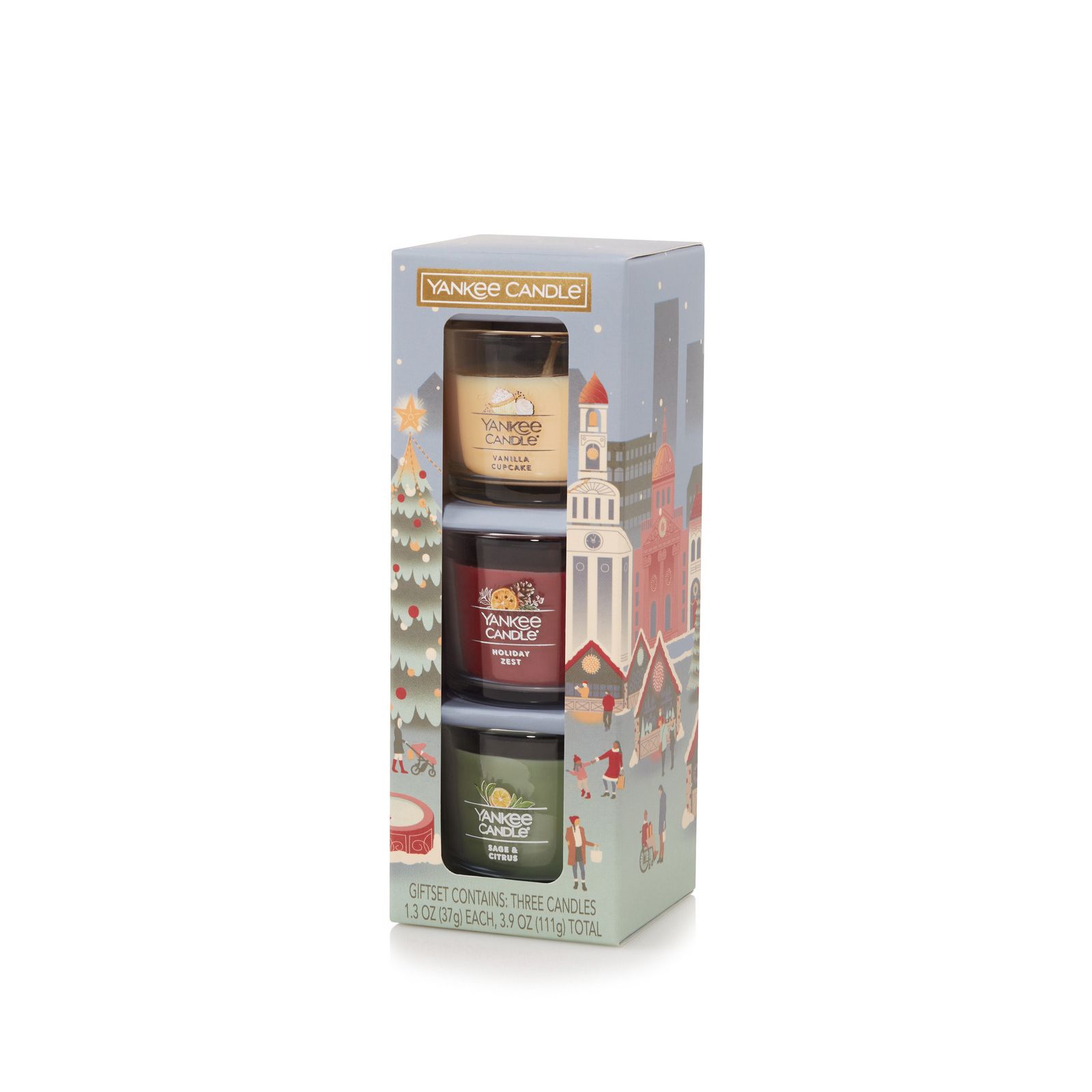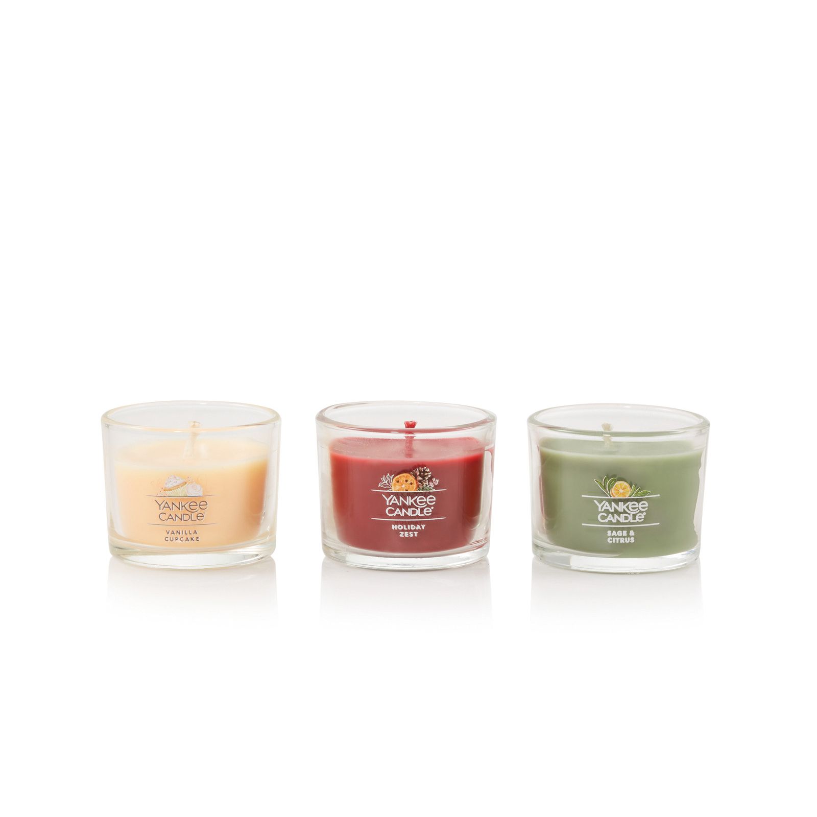 Includes three Yankee Candle Minis, one each in Vanilla Cupcake, Holiday Zest, and Sage And Citrus