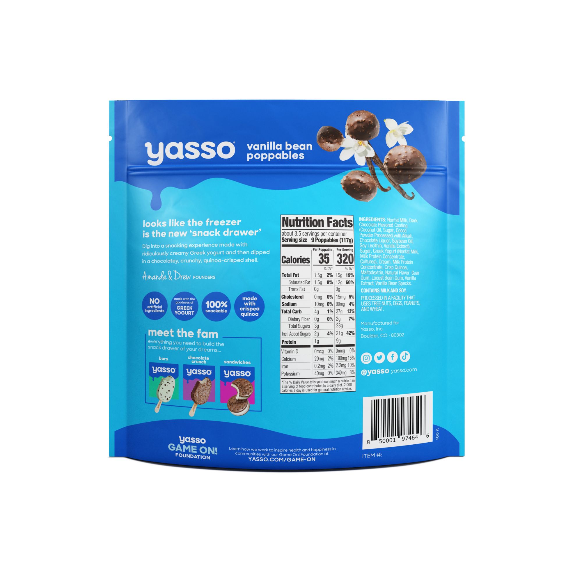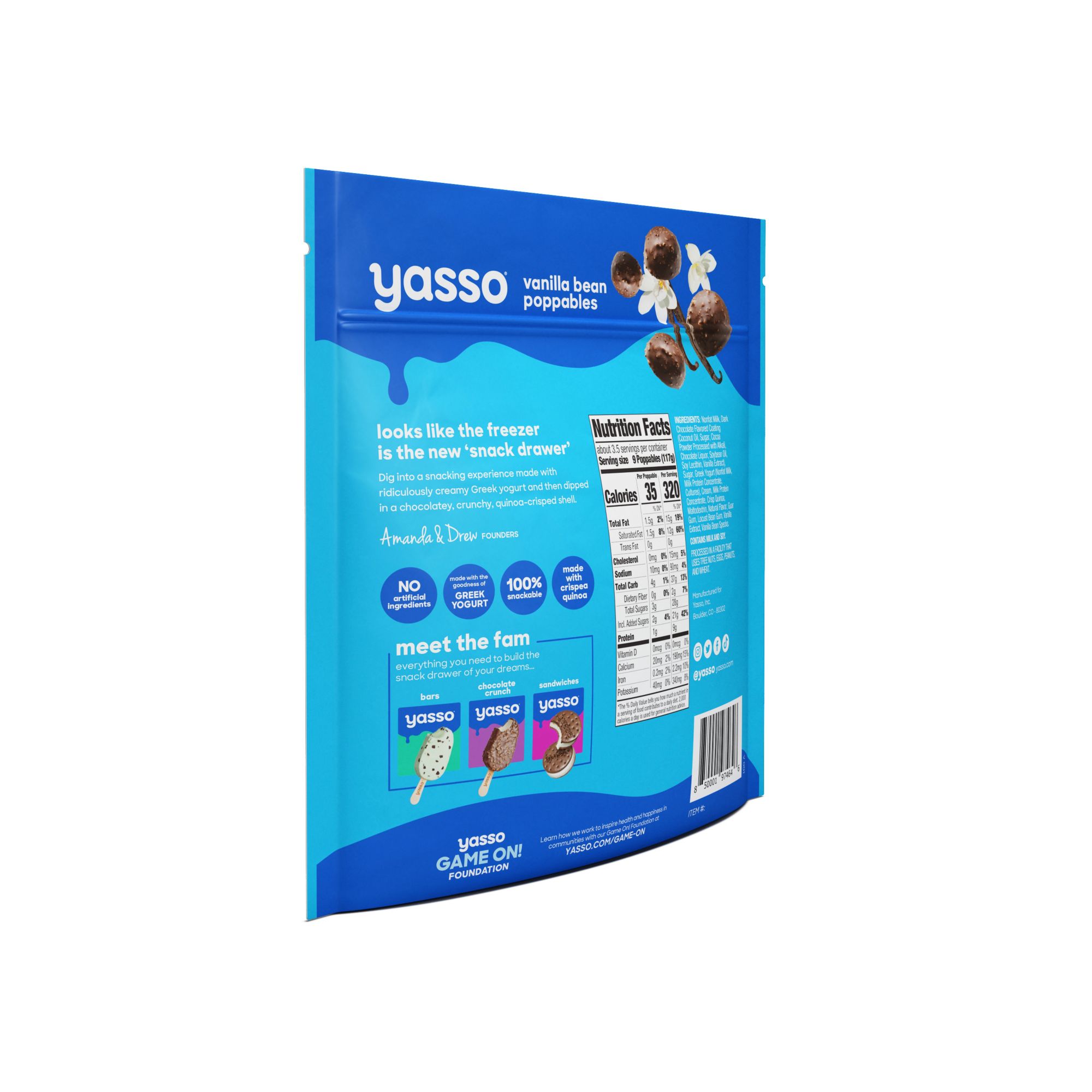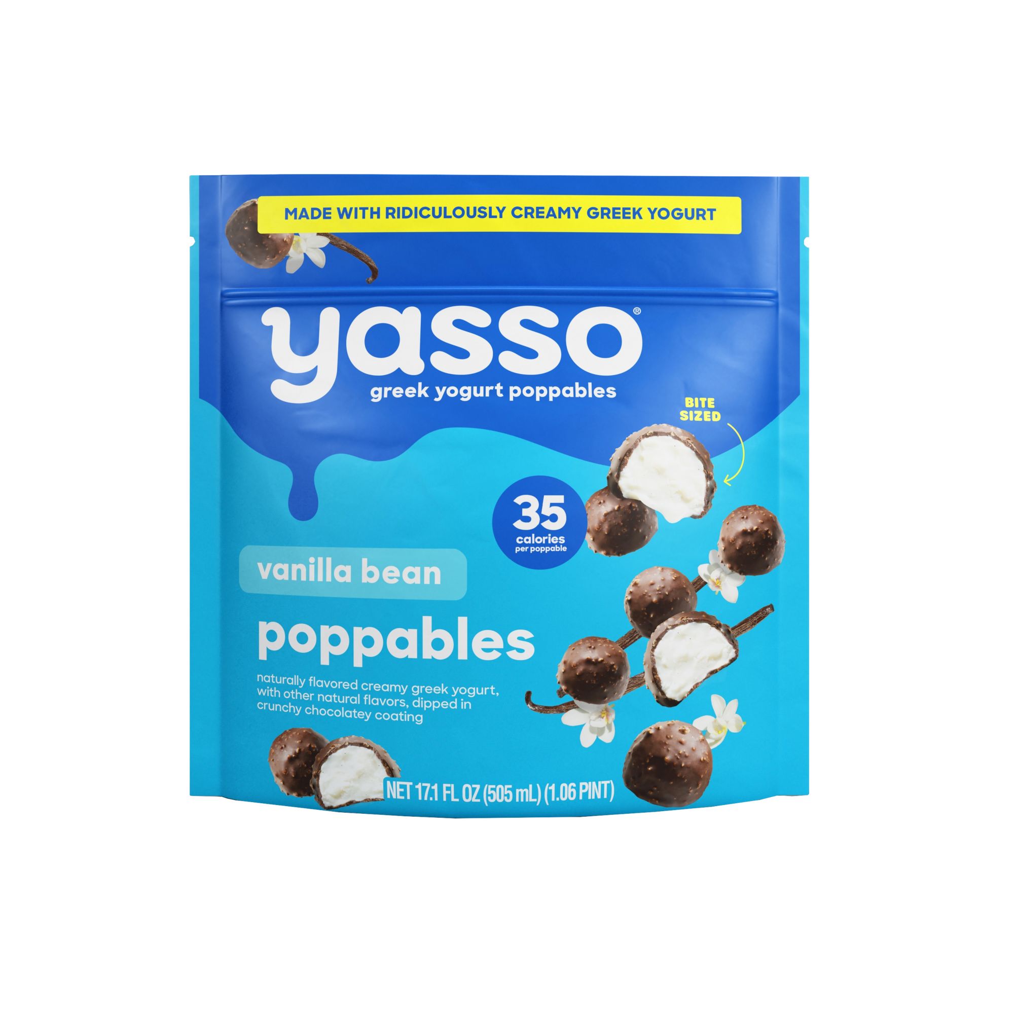 Poppables provide superior taste and nutrition in an innovative snackable form. Vanilla Bean Poppables are made with creamy Greek yogurt and then dipped in a chocolatey, crunchy, quinoa-crisped shell - no artificial ingredients and perfectly portioned as a bite-sized experience.