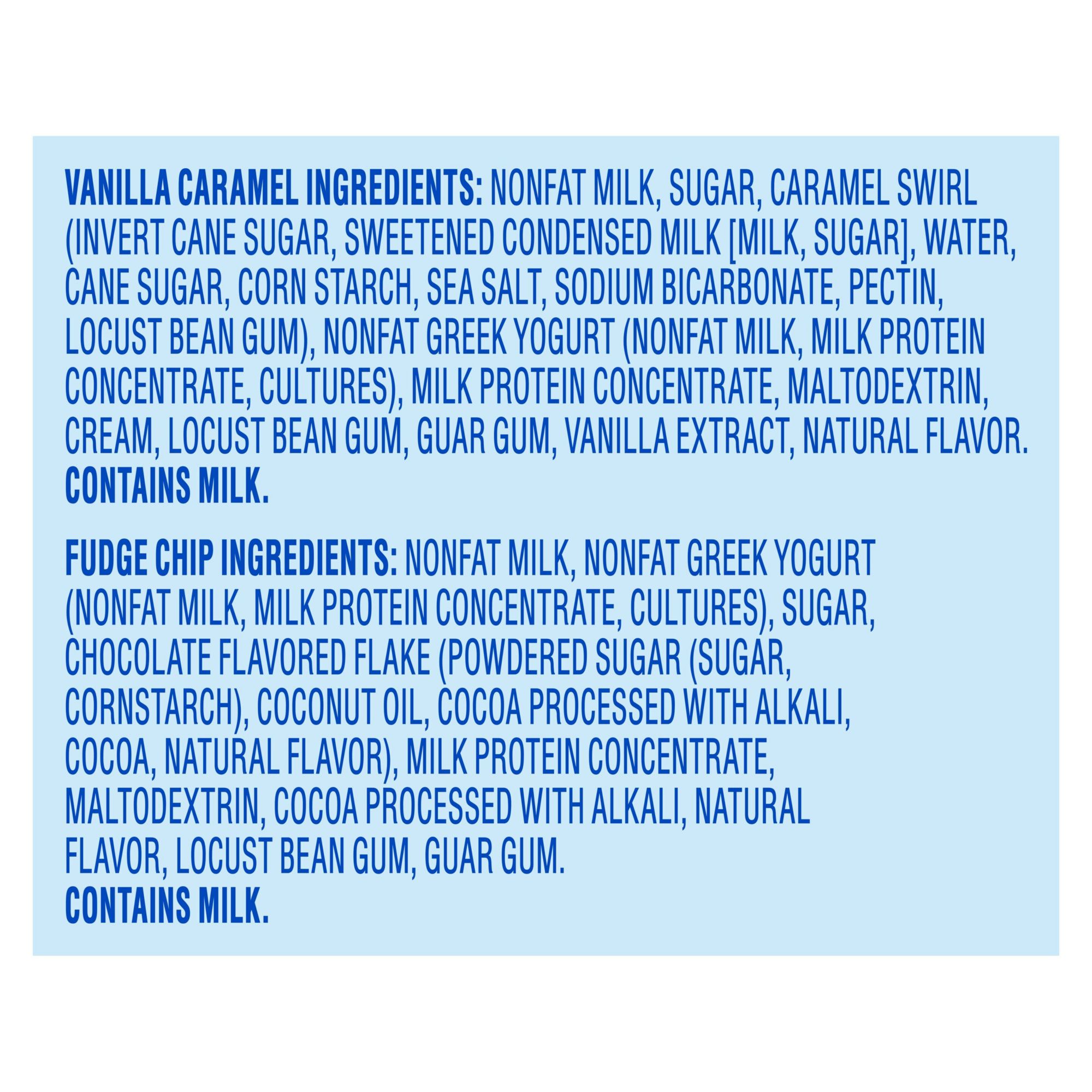 Ingredients: Vanilla Caramel Ingredients: Nonfat Milk, Sugar, Caramel Swirl (Invert Cane Sugar, Sweetened Condensed Milk [Milk, Sugar], Water, Cane Sugar, Corn Starch, Sea Salt, Sodium Bicarbonate, Pectin, Locust Bean Gum), Nonfat Greek Yogurt (Nonfat Milk, Milk Protein Concentrate, Cultures), Milk Protein Concentrate, Maltodextrin, Cream, Locust Bean Gum, Guar Gum, Vanilla Extract, Natural Flavor. Contains Milk. Fudge Chip Ingredients: Nonfat Milk, Nonfat Greek Yogurt (Nonfat Milk, Milk Protein Concentrate, Cultures), Sugar, Chocolate Flavored Flake (Powdered Sugar (Sugar, Cornstarch), Coconut Oil, Cocoa Processed With Alkali, Cocoa, Natural Flavor), Milk Protein Concentrate, Maltodextrin, Cocoa Processed With Alkali, Natural Flavor, Locust Bean Gum, Guar Gum. Contains Milk.