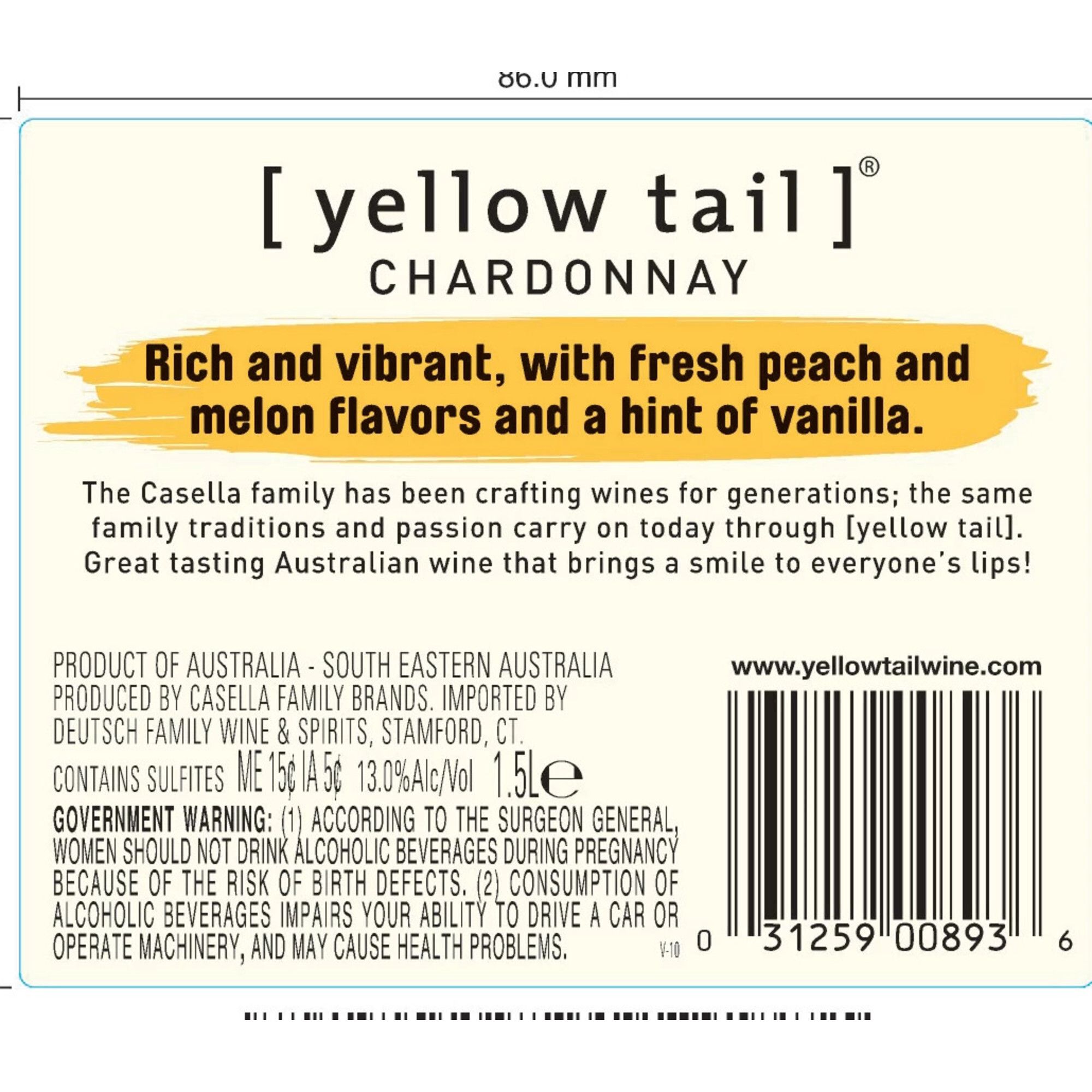 Made in South Eastern Australia, Yellow Tail Chardonnay is a white wine that brings the flavors and essence of the region to your glass, ensuring a smile with each sip. This chardonnay is everything a great wine should be with its easy to drink, rich taste and vibrant flavor profile. Featuring fresh flavors of peach and melon with a hint of vanilla, this white wine is full bodied and silky smooth. Enjoy this white wine with roast chicken or salad greens. Take an adventurous approach to this bottle of wine by adding chardonnay wine to a cinnamon pear cocktail, perfect for sharing with friends. Yellow Tail wine is wonderful for livening up casual dinners with loved ones and bringing a lighthearted spirit to any and every event and celebration. This Yellow Tail wine bottle is 1.5 L and has a 13% ABV. Great quality wine can be affordable and good fun too. We like our wines to be vibrant, flavorsome and approachable, making everyday moments even more enjoyable. A wine for any occasion, Yellow Tail is easy to choose, drink and enjoy.
