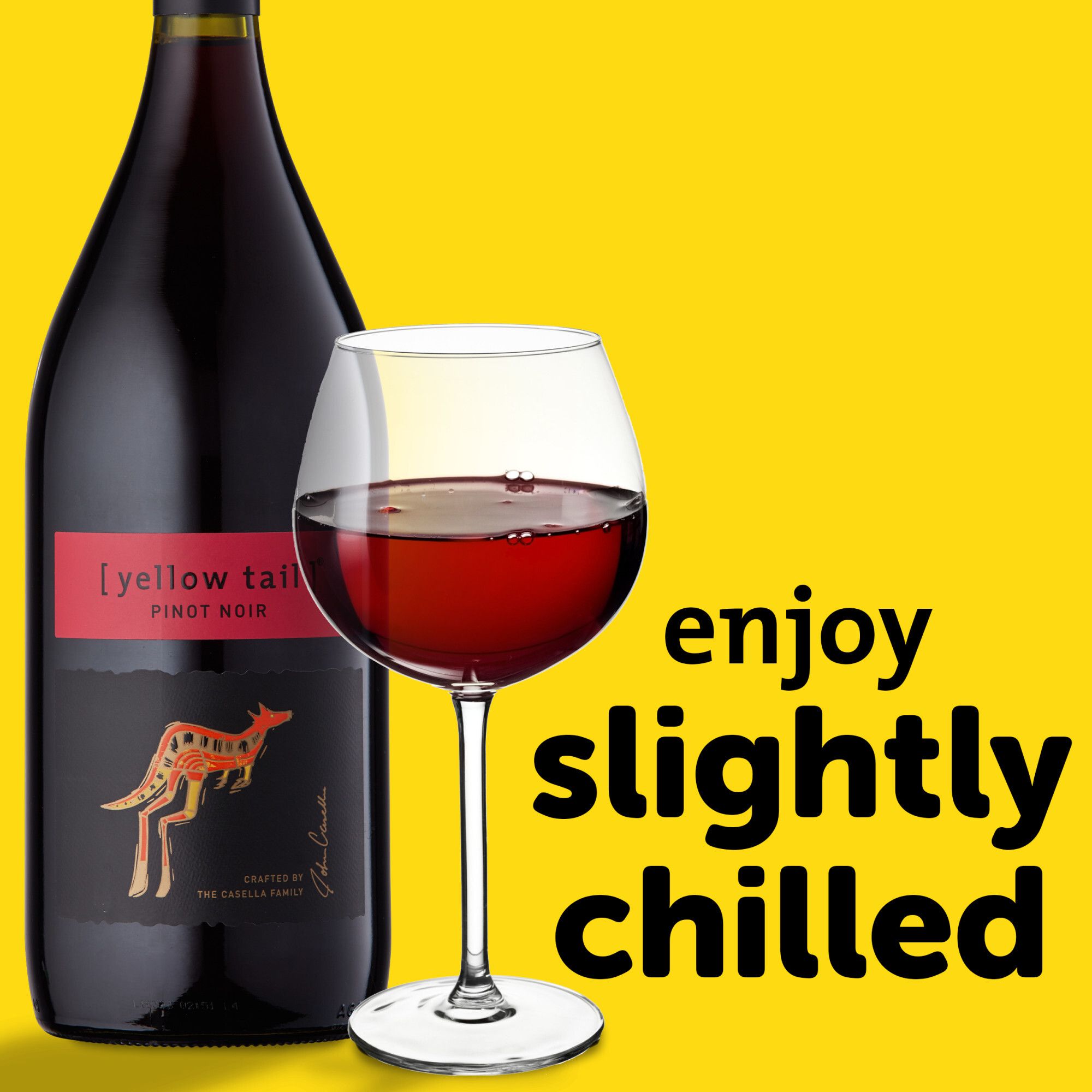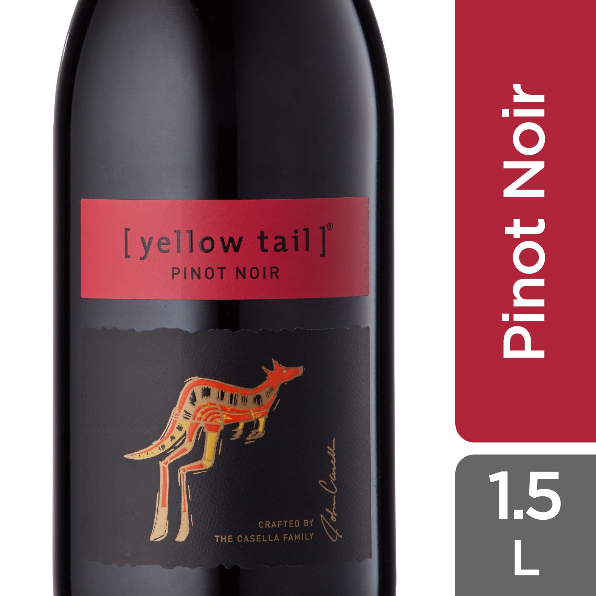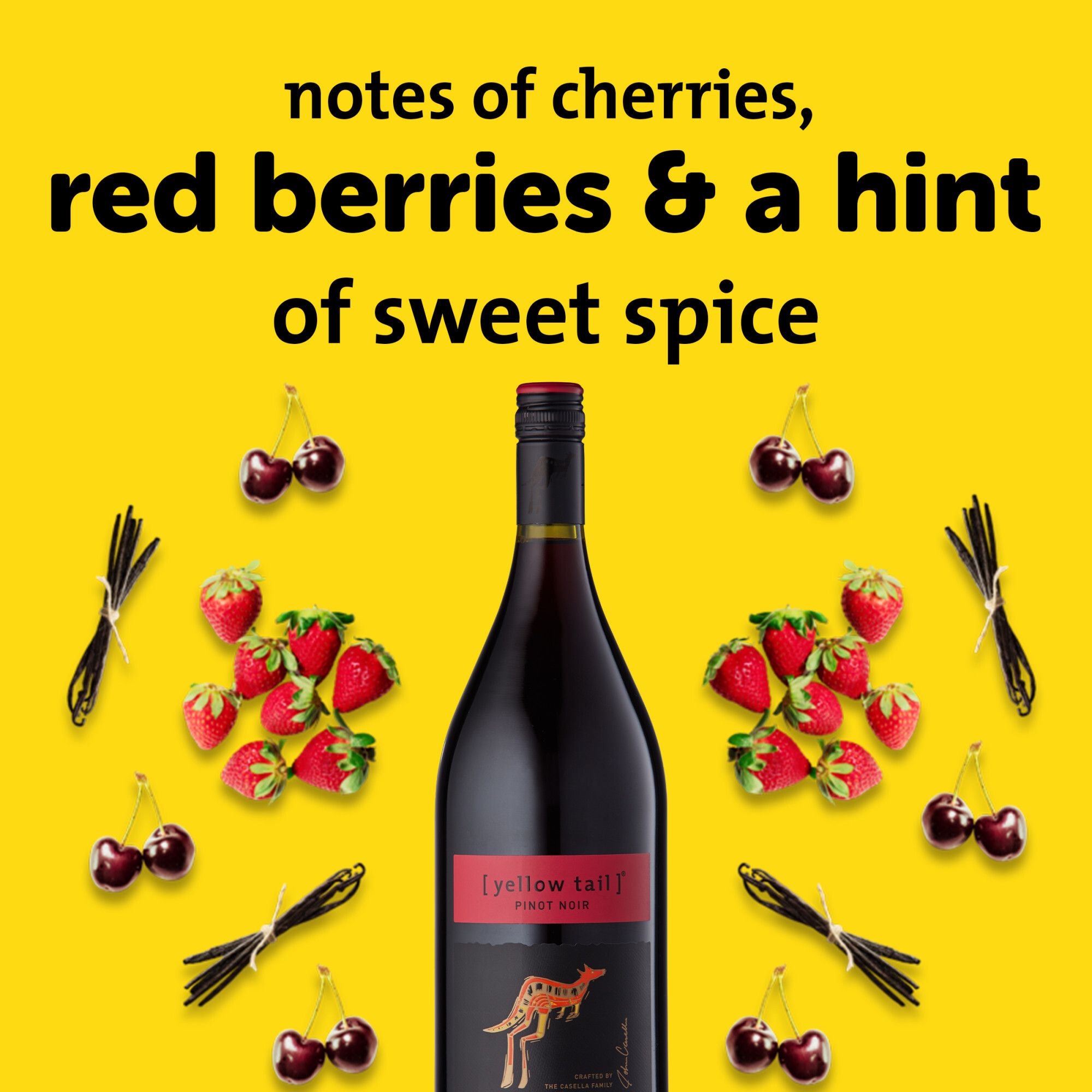 Made in South Eastern Australia, yellow tail Pinot Noir is a red wine that brings the flavors and essence of the region to your glass, ensuring a smile with each sip. This pinot noir is everything a great wine should be with its easy to drink, velvety taste and bright flavor profile. Featuring juicy flavors of cherries, red berries and a hint of sweet spice, this red wine is light bodied and soft with a balanced acidity. Enjoy this flavorful red wine with grilled steak and mushrooms or roasted chicken or duck. Take an adventurous approach to this bottle of wine by adding pinot noir wine to a berry slushie or frozen cocktail, perfect for sharing with friends. yellow tail wine is wonderful for livening up casual dinners with loved ones and bringing a lighthearted spirit to any and every event and celebration. This yellow tail wine bottle is 1.5 L and has a 11.5% ABV. Great quality wine can be affordable and good fun too. We like our wines to be vibrant, flavorsome and approachable, making everyday moments even more enjoyable. A wine for any occasion, yellow tail is easy to choose, drink and enjoy.