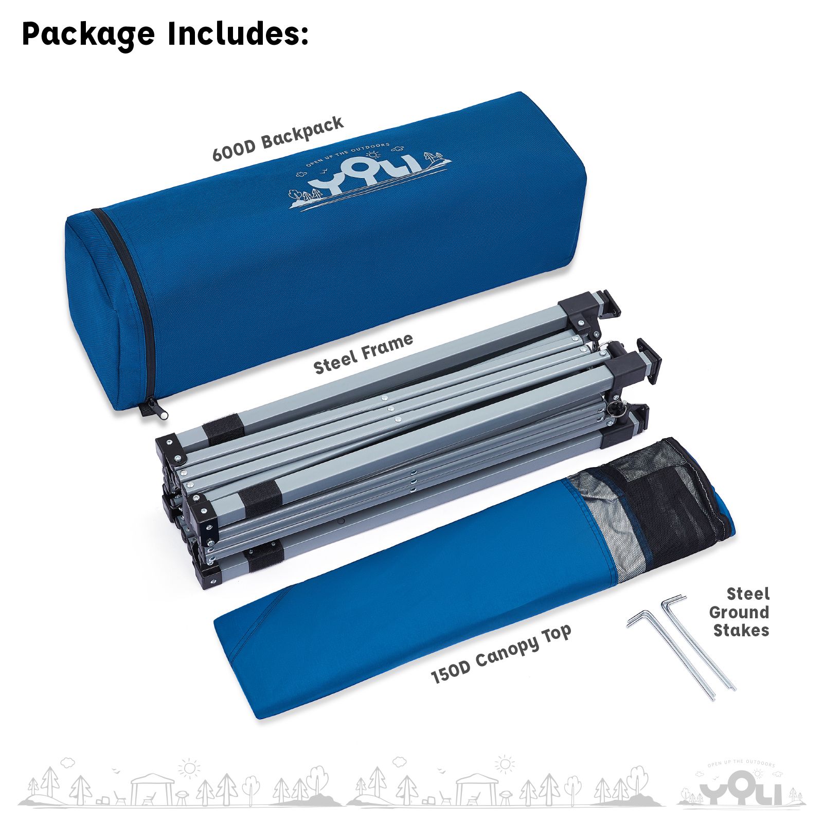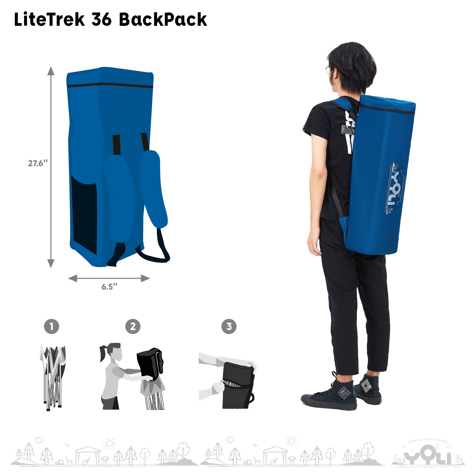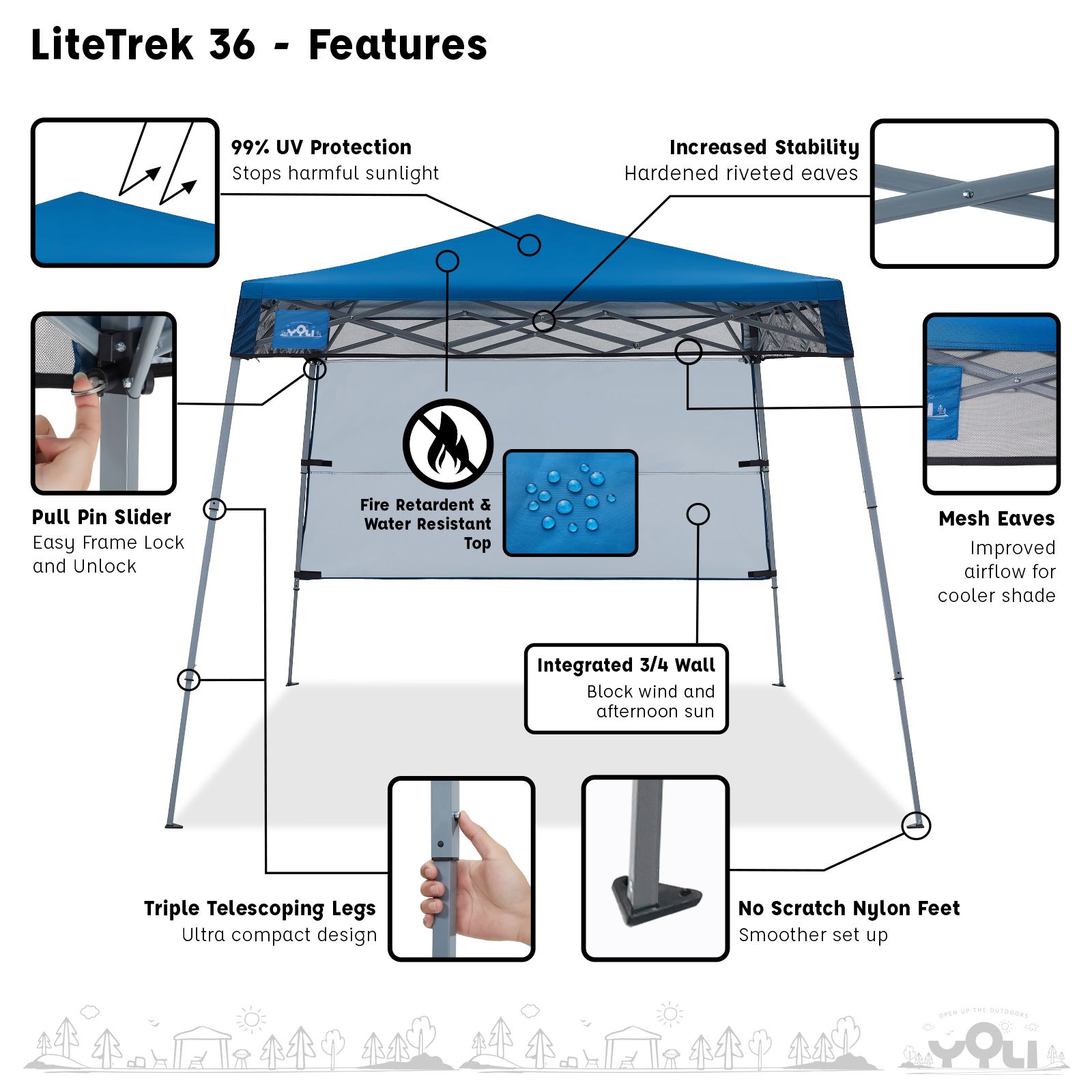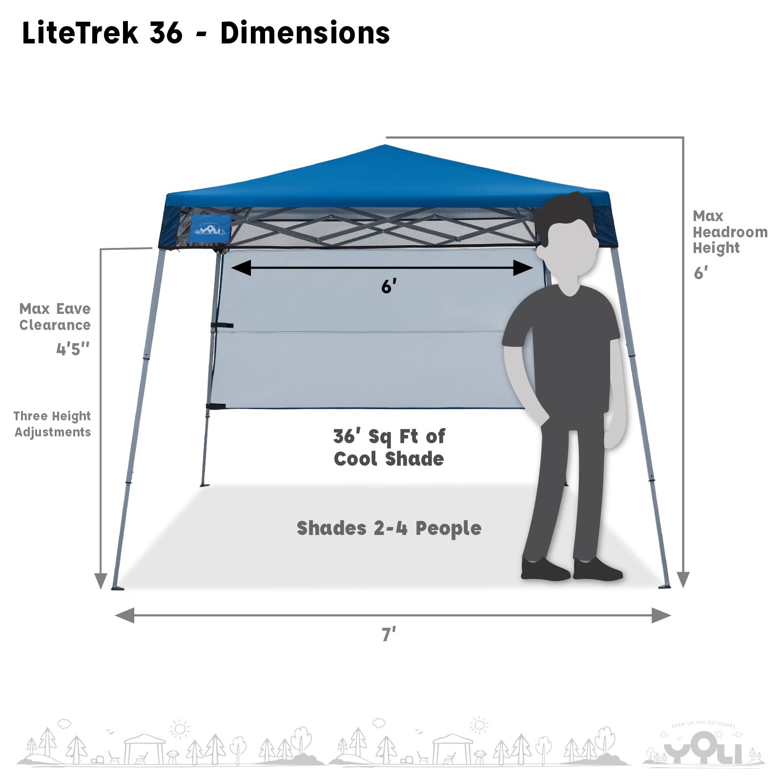 Open up the outdoors with the ultra-portable YOLI LiteTrek 36 7'x7' Instant Canopy. Folds under 28" and weighs less than 18 lbs. for easy transport in a provided backpack. Provides 99% UV protection at the beach, picnic, hike, or the sidelines of a game when a full size 10'x10' is just too big. It's the most compact instant canopy by YOLI providing 36sq.ft of shade to protect and cool two to four people. Going solo? No problem. 1-piece fully assembled powder-coated steel frame is simple and fast to set up by one person. Just as fast to take down. The frame design features easy-to-use pull ring sliders with push-button leg extensions for three different height levels. With legs fully extended the center peak height reaches 6'. The canopy top is made from 150D polyester fabric that is water-resistant and fire retardant (CPAI-84 Rated). Aluminum backing on the underside of the canopy provides 99% UV protection. The canopy top features an integrated 3/4 wall to block the late afternoon sun and mesh eaves to improve airflow for cooler shade. YOLI LiteTrek 36 7'x7' Instant Canopy includes a 600D polyester backpack carry bag with a mesh pocket and four anchoring stakes.
