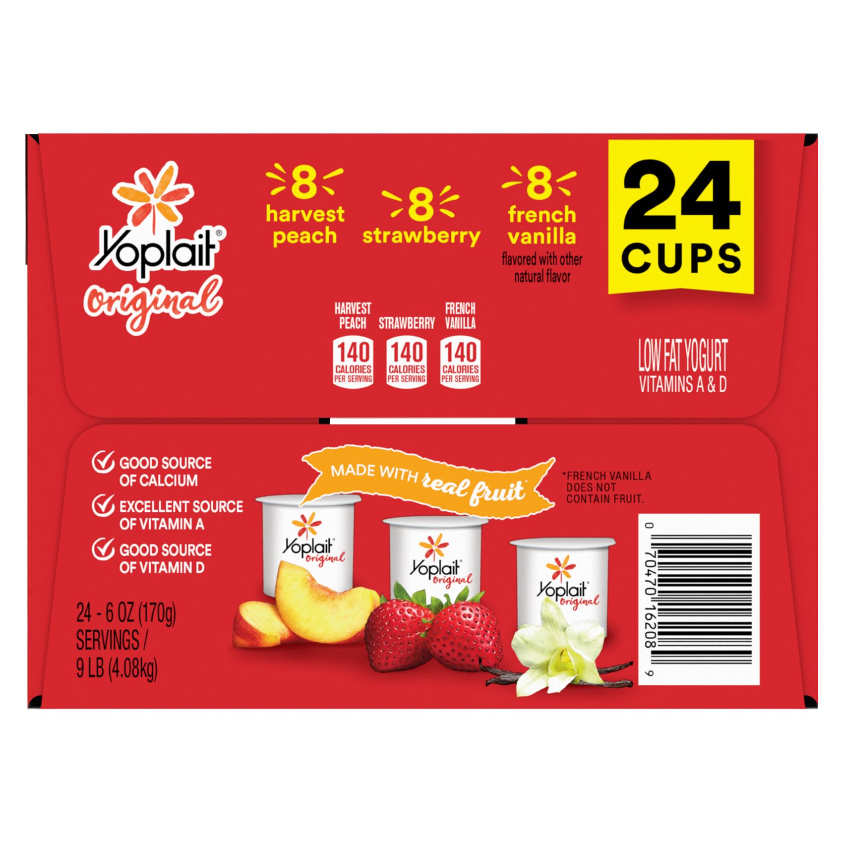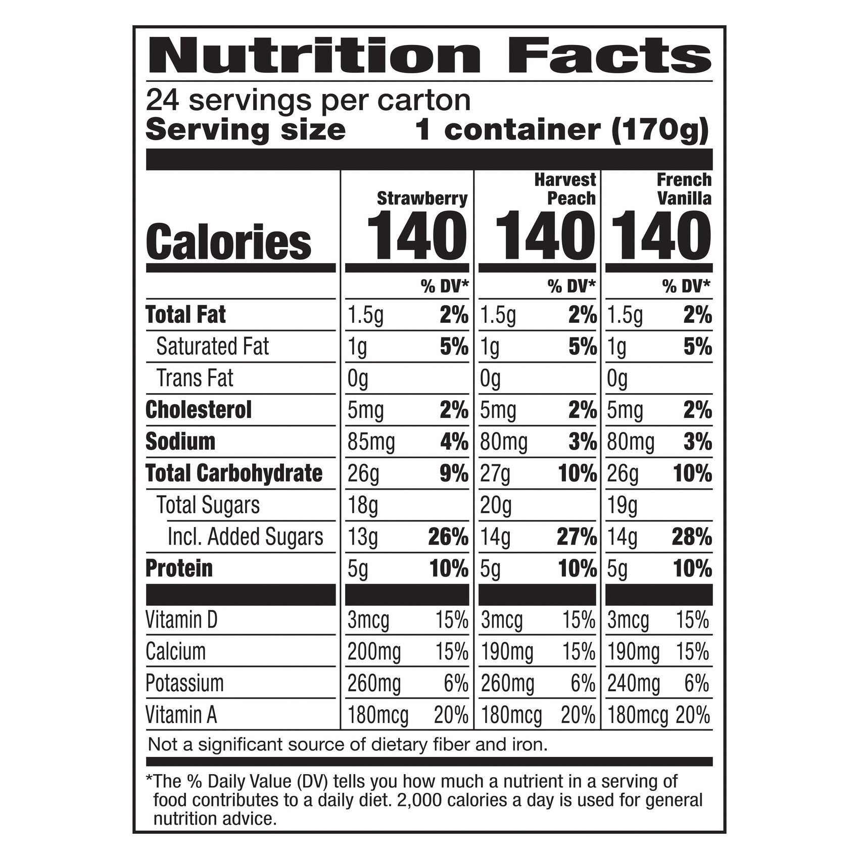 Includes 3 tasty flavors: 8 ct. of French Vanilla, 8 ct. of Harvest Peach, and 8 ct. of Strawberry Made with Real Fruit More Calcium:Â Excellent Source More Vitamin D:Â Good Source Gelatin Free Formula