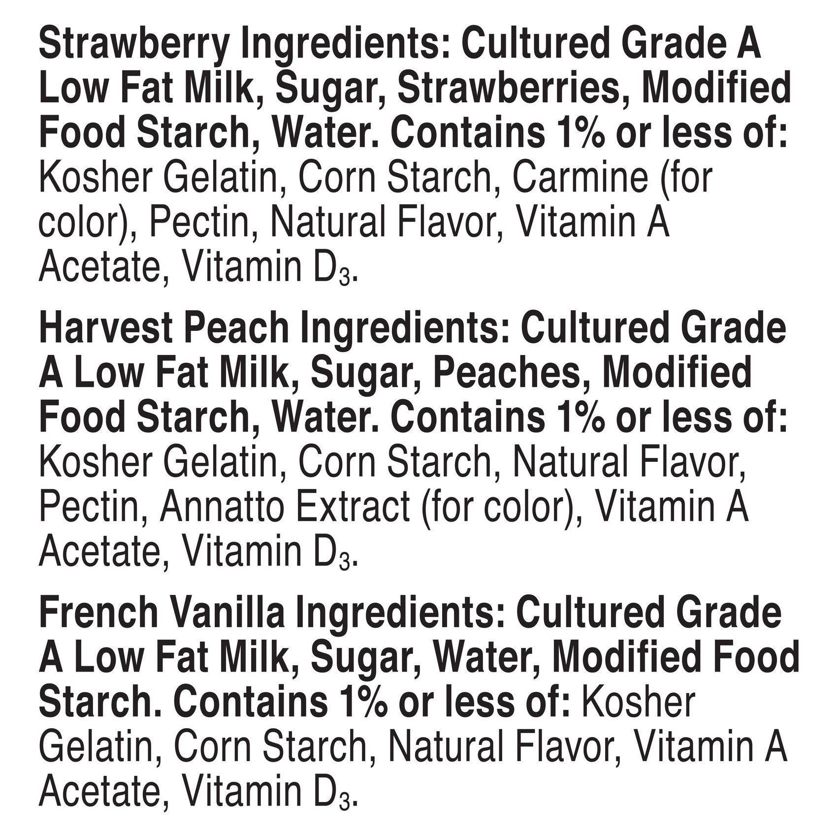 French Vanilla: Cultured Grade A Reduced Fat Milk, Sugar, Water, Modified Corn Starch. Contains 1% or less of: Corn Starch, Tricalcium Phosphate, Natural Flavor, Vitamin A Acetate, Vitamin D3. Harvest Peach: Cultured Grade A Low Fat Milk, Sugar, Peaches, Modified Food Starch, Water. Contains 1% or less of: Corn Starch, Tricalcium Phosphate, Pectin, Natural Flavor, Annatto Extract (for color), Kosher Gelatin, Vitamin A Acetate, Vitamin D3. Strawberry: Cultured Grade A Low Fat Milk, Sugar, Strawberries, Modified Food Starch, Water. Contains 1% or less of: Corn Starch, Tricalcium Phosphate, Carmine (for color), Pectin, Natural Flavor, Kosher Gelatin, Vitamin A Acetate, Vitamin D3.