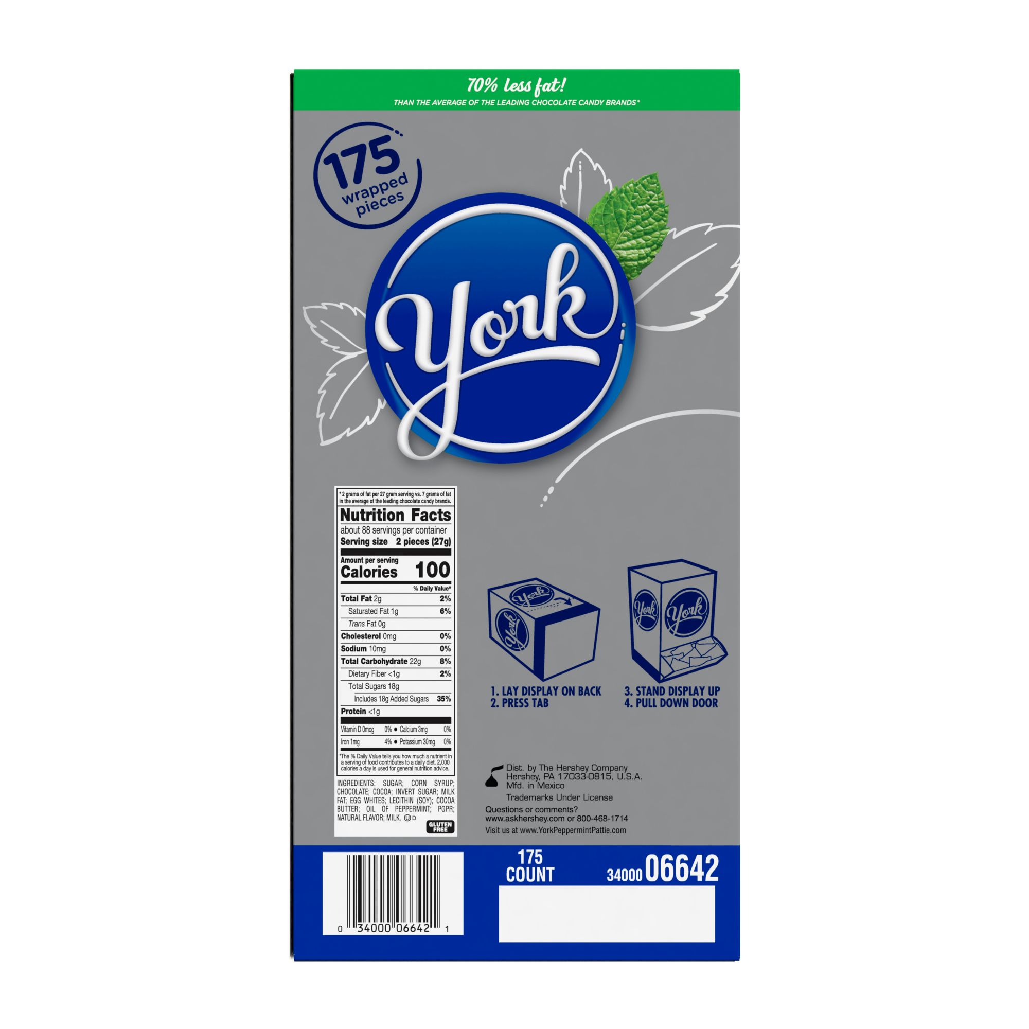 Chill out with York dark chocolate peppermint patties candy with 70 percent less fat than other leading chocolate candy brands. These small but mighty candies invigorate your taste buds with a minty kick combined with rich dark chocolate to keep you feeling excited for a full day ahead. Bring a bulk box into work so everyone can have a piece, and don't forget to keep a few for yourself. This box is perfect for any special occasion like movie marathons, birthday parties, work celebrations, family get-togethers and fundraising events as resale candy. Everyone can reach in and grab a York peppermint patties treats of their own. And with these bite-size sweets, they're a quick snack you can have on the go. The dark chocolate peppermint treats are also fun to bake with! Wrap your favorite cookie dough around the chocolate peppermint candy, bake in the oven, then experience a minty fresh cookie created by yours truly. You can also hand out scrumptious York dark chocolate peppermint patties candies during the holidays like in Easter baskets, Christmas stockings, Halloween candy bowls and Valentine's Day gift bags. These minty delights covered in dark chocolate are gluten-free and kosher for those who love a refreshing but rich snack.