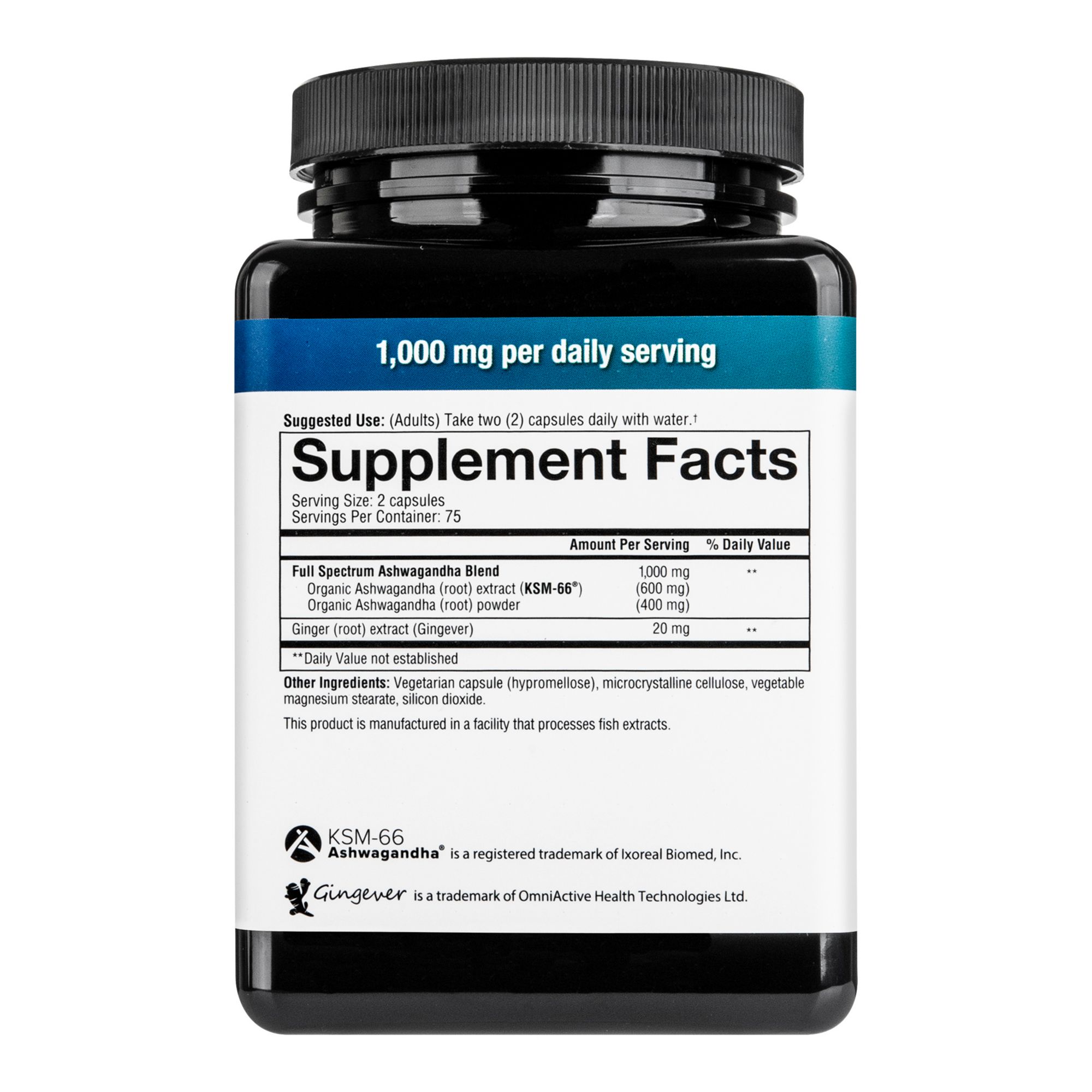 Active Ingredients: Full Spectrum Ashwagandha Blend 1, 000 mg Organic Ashwagandha (root) extract (KSM-66) (600mg) Organic Ashwagandha (root) extract (KSM-66) (600mg) Organic Ashwagandha (root) powder (400 mg) Ginger (root) extract 20 mg.