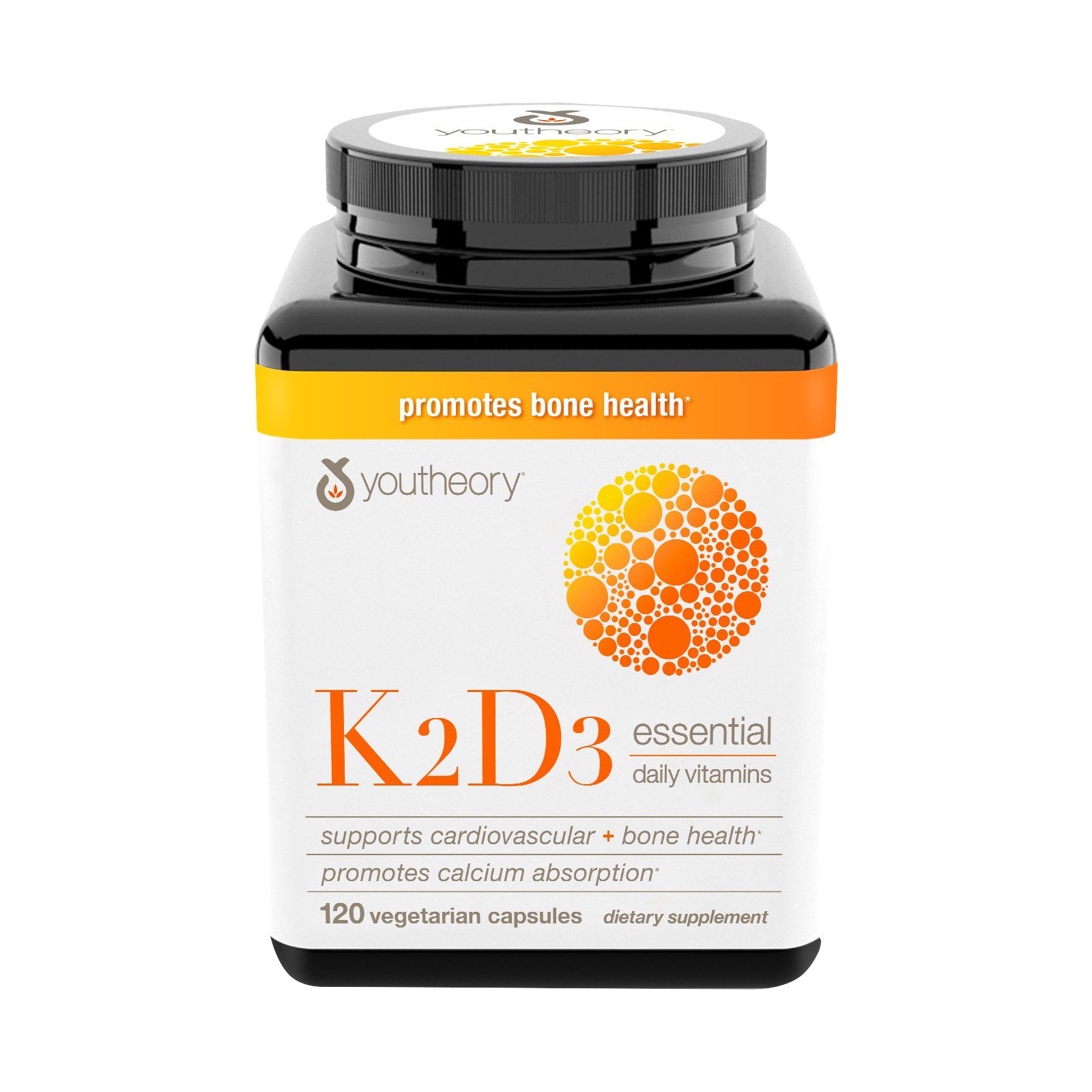 Youtheory K2D3 capsules are formulated with 5000 IU's of D3, and formulated with K2 (Menaquinone 7-as K2 VITAL). Promotes bone health and calcium absorption. Supports healthy heart and blood circulation. Support immune health. Vitamin D3 directs the absorption of calcium from your intestines into your blood. Without K2, D3 can cause an increase in calcium levels without the ability to use it effectively, which raises the risk of depositing calcium in arteries and soft tissue. Vitamin K2 takes the calcium from your blood into your bones ensuring minimal deposits of calcium in your arteries and soft tissue.