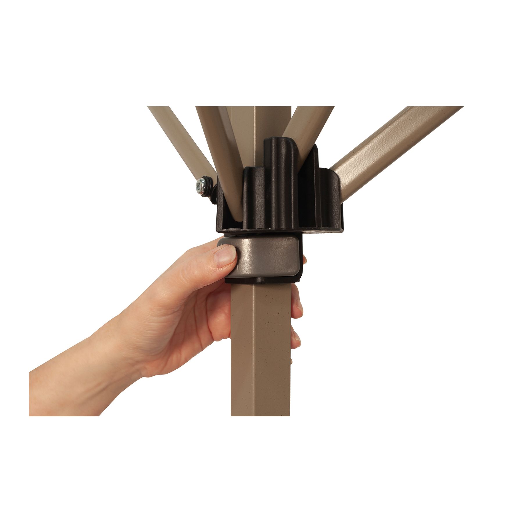 Powder-coated steel frame, tan/brown two-tone 150D polyester top, roller bag, stake kit, user manual