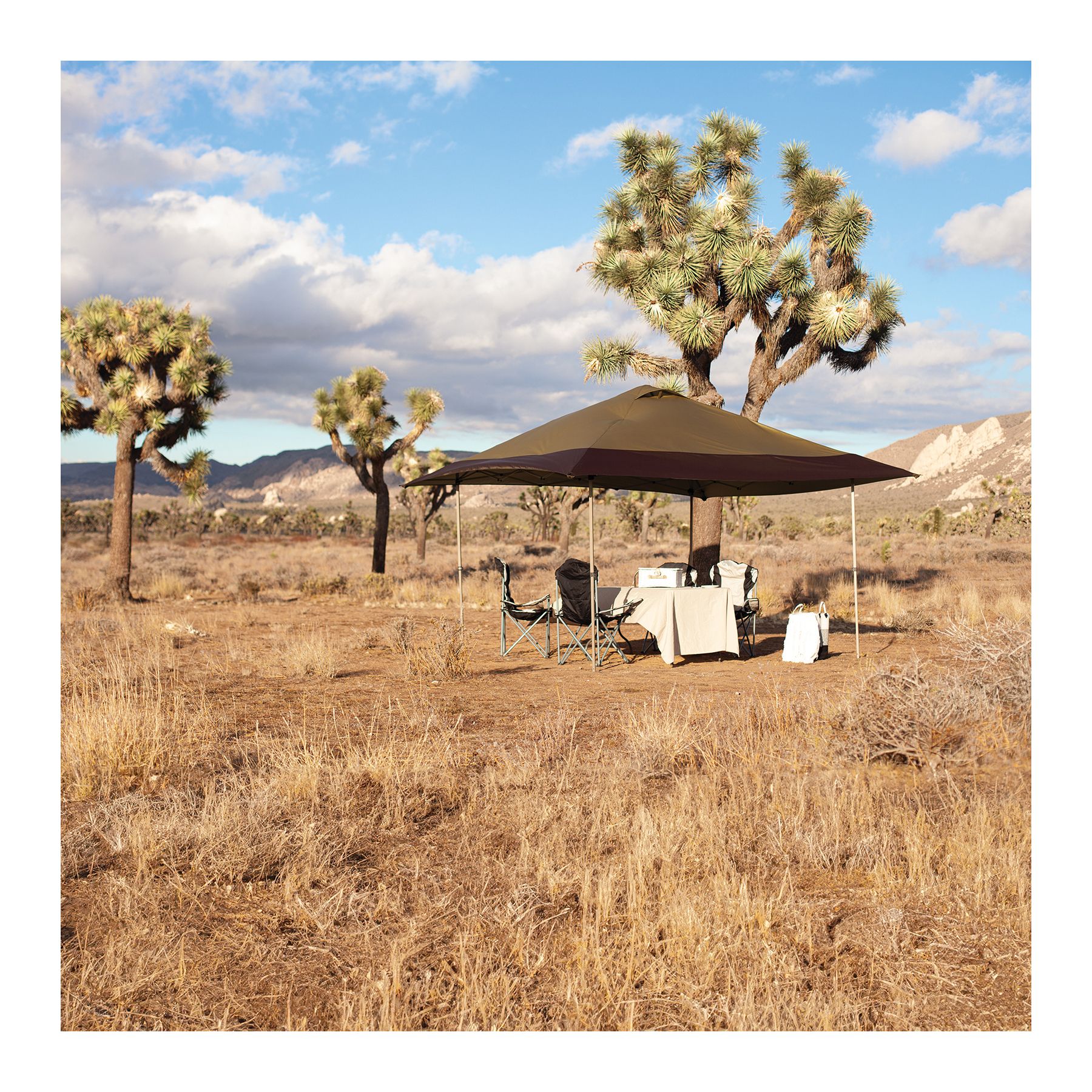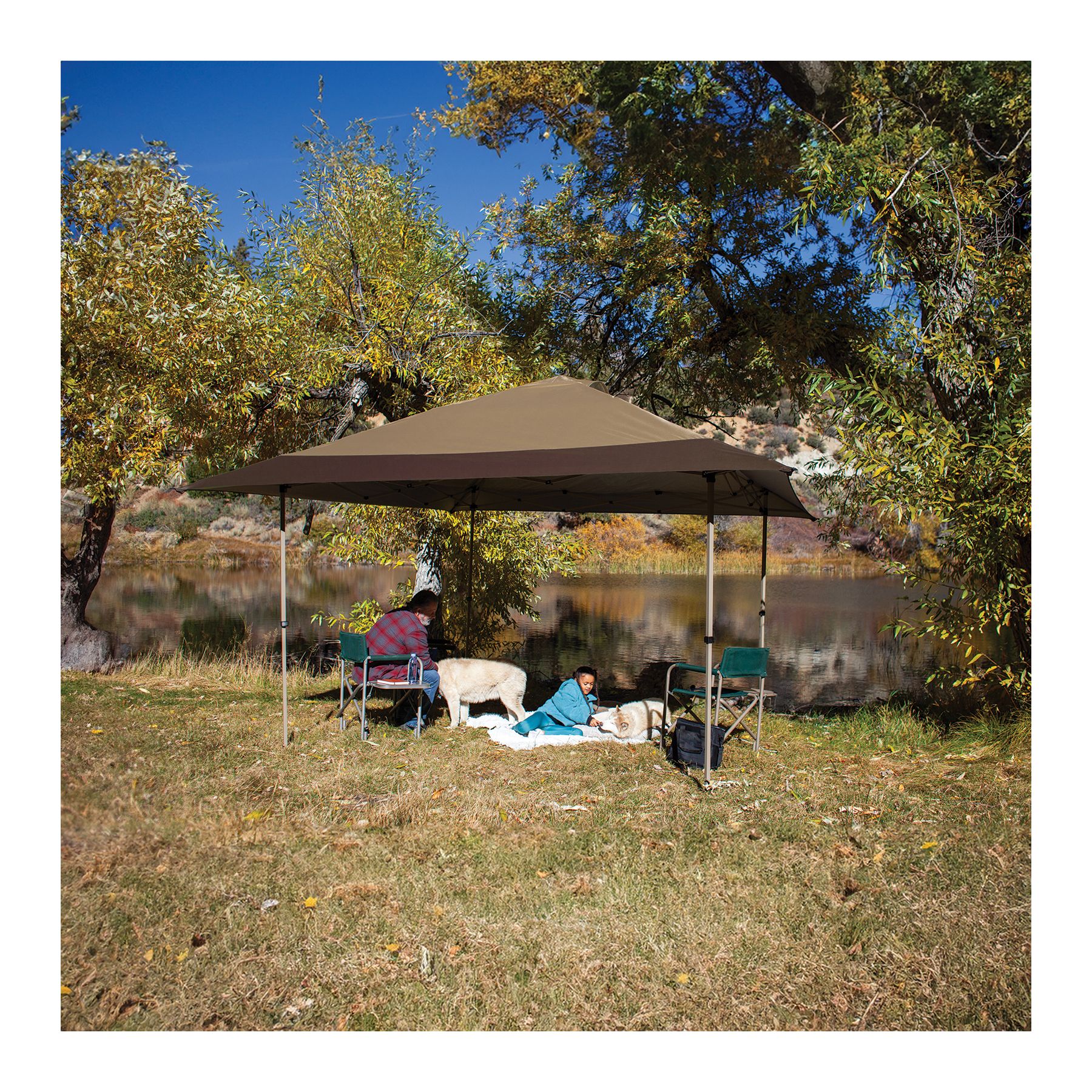 Includes Powder coated steel frame, tan/brown two-tone 150D polyester top, roller bag, stake kit, user manual