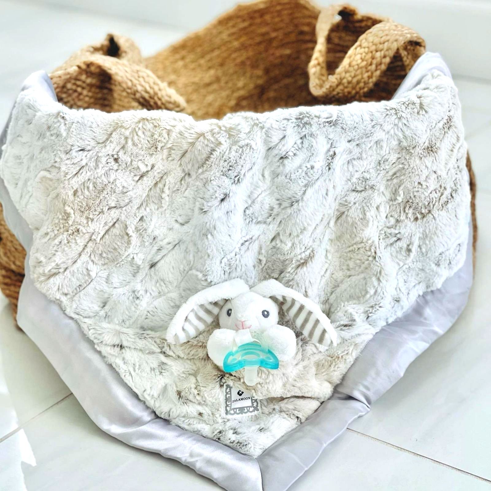Zalamoon Luxie Pocket Blanket in Snow Leopard with Coco Bunny RaZbuddy and JollyPop pacifier